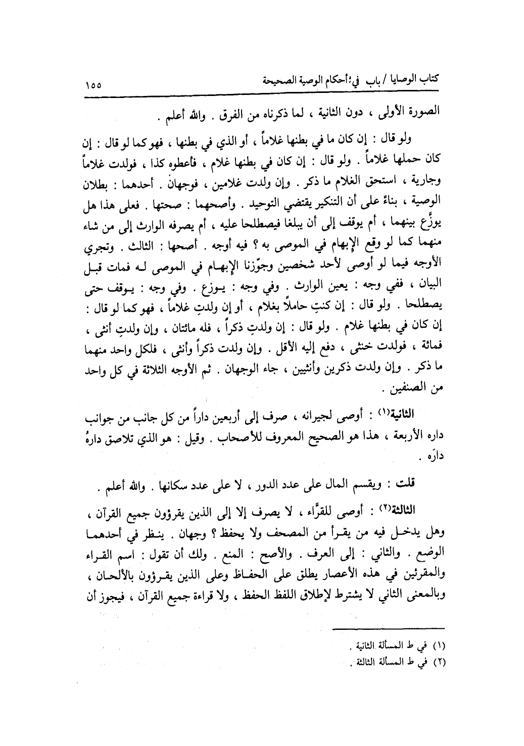 الصورة الاولى، دون الثانية، لما ذكرناه من الفرق. والله أعلم. ولو قال: إن كان ما في بطنها غلاما، أو الذي في بطنها، فهو كما لو قال: إن كان حملها غلاما. ولو قال: إن كان في بطنها غلام، فأعطوه كذا، فولدت غلاما وجارية، استحق الغلام ما ذكر. وإن ولدت غلامين، فوجهان. أحدهما: بطلان الوصية، بناء على أن التنكير يقتضي التوحيد. وأصحهما: صحتها. فعلى هذا هل يوزع بينهما، أم يوقف إلى أن يبلغا فيصطلحا عليه، أم يصرفه الوارث إلى من شاء منهما كما لو وقع الابهام في الموصى به ؟ فيه أوجه. أصحها: الثالث. وتجري الاوجه فيما لو أوصى لاحد شخصين وجوزنا الابهام في الموصى له فمات قبل البيان، ففي وجه: يعين الوارث. وفي وجه: يوزع. وفي وجه: يوقف حتى يصطلحا. ولو قال: إن كنت حاملا بغلام، أو إن ولد ت غلاما، فهو كما لو قال: إن كان في بطنها غلام. ولو قال: إن ولدت ذكرا، فله مائتان، وإن ولدت أنثى، فمائة، فولدت خنثى، دفع إليه الاقل. وإن ولدت ذكرا وأنثى، فلكل واحد منهما ما ذكر. وإن ولدت ذكرين وأنثيين، جاء الوجهان. ثم الاوجه الثلاثة في كل واحد من الصنفين. المسألة (الثانية): أوصى لجيرانه، صرف إلى أربعين دارا من كل جانب من جوانب داره الاربعة، هذا هو الصحيح المعروف للاصحاب. وقيل: هو الذي تلاصق داره داره. قلت: ويقسم المال على عدد الدور، لا على عدد سكانها. والله أعلم. (المسألة) الثالثة: أوصى للقراء، لا يصرف إلا إلى الذين يقرؤون جميع القرآن، وهل يدخل فيه من يقرأ من المصحف ولا يحفظ ؟ وجهان. ينظر في أحدهما إلى الوضع. والثاني: إلى العرف. والاصح: المنع. ولك أن تقول: إسم القراء والمقرئين في هذه الاعصار يطلق على الحفاظ وعلى الذين يقرؤون بالالحان، وبالمعنى الثاني لا يشترط لاطلاق اللفظ الحفظ، ولا قراءة جميع القرآن، فيجوز أن