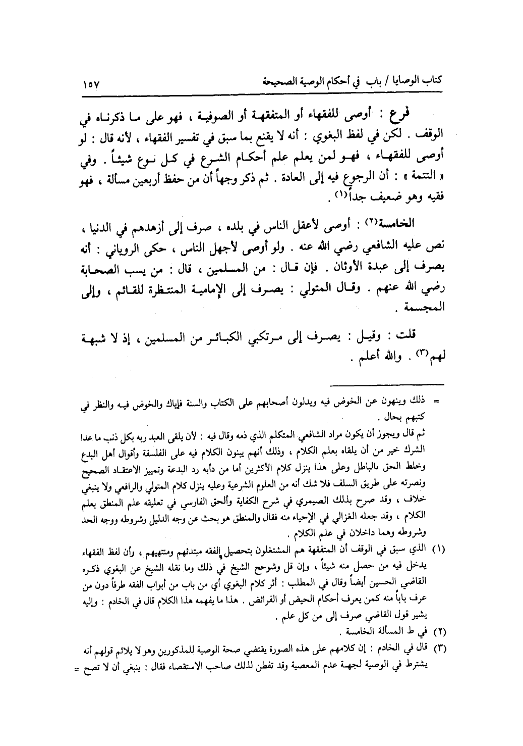 فرع أوصى للفقهاء أو المتفقهة أو الصوفية، فهو على ما ذكرناه في الوقف. لكن في لفظ البغوي: أنه لا يقنع بما سبق في تفسير الفقهاء، لانه قال: لو أوصى للفقهاء، فهو لمن يعلم علم أحكام الشرع في كل نوع شيئا. وفي التتمة: أن الرجوع فيه إلى العادة. ثم ذكر وجها أن من حفظ أربعين مسألة، فهو فقيه وهو ضعيف جدا. (المسألة) الخامسة: أوصى لاعقل الناس في بلده، صرف إلى أزهدهم في الدنيا، نص عليه الشافعي رضي الله عنه. ولو أوصى لاجهل الناس، حكى الروياني: أنه يصرف إلى عبدة الاوثان. فإن قال: من المسلمين، قال: من يسب الصحابة رضي الله عنهم. وقال المتولي: يصرف إلى الامامية المنتظرة للقائم، وإلى المجسمة. قلت: وقيل: يصرف إلى مرتكبي الكبائر من المسلمين، إذ لا شبهة لهم. والله أعلم