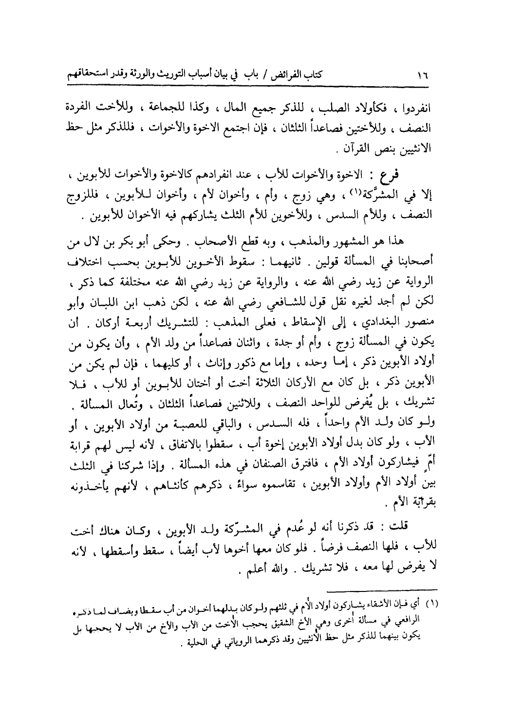 انفردوا، فكأولاد الصلب، للذكر جميع المال، وكذا للجماعة، وللاخت الفردة النصف، وللاختين فصاعدا الثلثان، فإن اجتمع الاخوة والاخوات، فللذكر مثل حظ الانثيين بنص القرآن. فرع الاخوة والاخوات للاب، عند انفرادهم كالاخوة والاخوات للابوين، إلا في المشركة، وهي زوج، وأم، وأخوان لام، وأخوان للابوين، فللزوج النصف، وللام السدس، وللاخوين للام الثلث يشاركهم فيه الاخوان للابوين. هذا هو المشهور والمذهب، وبه قطع الاصحاب. وحكى أبو بكر بن لال من أصحابنا في المسألة قولين. ثانيهما: سقوط الاخوين للابوين بحسب اختلاف الرواية عن زيد رضي الله عنه، والرواية عن زيد رضي الله عنه مختلفة كما ذكر، لكن لم أجد لغيره نقل قول للشافعي رضي الله عنه، لكن ذهب ابن اللبان وأبو منصور البغدادي، إلى الاسقاط، فعلى المذهب: للتشريك أربعة أركان. أن يكون في المسألة زوج، وأم أو جدة، واثنان فصاعدا من ولد الام، وأن يكون من أولاد الابوين ذكر، إما وحده، وإما مع ذكور أو إناث، أو كليهما، فإن لم يكن من الابوين ذكر، بل كان مع الاركان الثلاثة أخت أو أختان للابوين أو للاب، فلا تشريك، بل يفرض للواحد النصف، وللاثنين فصاعدا الثلثان، وتعال المسألة. ولو كان ولد الام واحدا، فله السدس، والباقي للعصبة من أولاد الابوين، أو الاب، ولو كان بدل أولاد الابوين إخوة أب، سقطوا بالاتفاق، لانه ليس لهم قرابة أم فيشاركون أولاد الام، فافترق الصنفان في هذه المسألة. وإذا شركنا في الثلث بين أولاد الام وأولاد الابوين، تقاسموه سواء، ذكرهم كأنثاهم، لانهم يأخذونه بقرابة الام. قلت: قد ذكرنا أنه لو عدم في المشركة ولد الابوين، وكان هناك أخت للاب، فلها النصف فرضا. فلو كان معها أخوها لاب أيضا، سقط وأسقطها، لانه لا يفرض لها معه، فلا تشريك. والله أعلم.