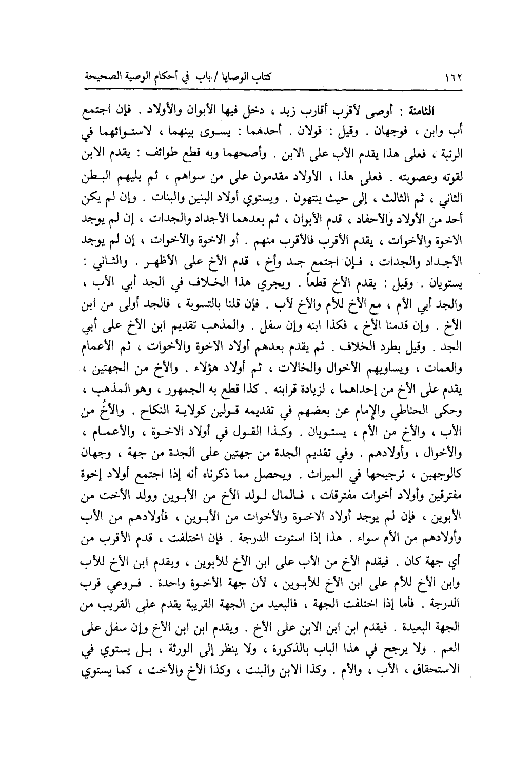(المسألة) الثامنة: أوصى لاقرب أقارب زيد، دخل فيها الابوان والاولاد. فإن اجتمع أب وابن، فوجهان. وقيل: قولان. أحدهما: يسوى بينهما، لاستوائهما في الرتبة، فعلى هذا يقدم الاب على ابن الابن. وأصحهما وبه قطع طوائف: يقدم الابن لقوته وعصوبته. فعلى هذا، الاولاد مقدمون على من سواهم، ثم يليهم البطن الثاني، ثم الثالث، إلى حيث ينتهون. ويستوي أولاد البنين والبنات. فإن لم يكن أحد من الاولاد والاحفاد، قدم الابوان، ثم بعدهما الاجداد والجدات، إن لم يوجد الاخوة والاخوات، يقدم الاقرب فالاقرب منهم. أو الاخوة والاخوات، إن لم يوجد الاجداد والجدات، فإن اجتمع جد وأخ، قدم الاخ على الاظهر. والثاني: يستويان. وقيل: يقدم الاخ قطعا. ويجري هذا الخلاف في الجد أبي الاب، والجد أبي الام، مع الاخ للام والاخ لاب. فإن قلنا بالتسوية، فالجد أولى من ابن الاخ. وإن قدمنا الاخ، فكذا ابنه وإن سفل. والمذهب تقديم ابن الاخ على أبي الجد. وقيل بطرد الخلاف. ثم يقدم بعدهم أولاد الاخوة والاخوات، ثم الاعمام والعمات، ويساويهم الاخوال والخالات، ثم أولاد هؤلاء. والاخ من الجهتين، يقدم على الاخ من إحداهما، لزيادة قرابته. كذا قطع به الجمهور، وهو المذهب، وحكى الحناطي والامام عن بعضهم في تقديمه قولين كولاية النكاح. والاخ من الاب، والاخ من الام، يستويان. وكذا القول في أولاد الاخوة، والاعمام، والاخوال، وأولادهم. وفي تقديم الجدة من جهتين على الجدة من جهة، وجهان كالوجهين، ترجيحها في الميراث. ويحصل مما ذكرناه أنه إذا اجتمع أولاد إخوة مفترقين وأولاد أخوات مفترقات، فالمال لولد الاخ من الابوين وولد الاخت من الابوين، فإن لم يوجد أولاد الاخوة والاخوات من الابوين، فأولادهم من الاب وأولادهم من الام سواء. هذا إذا استوت الدرجة. فإن اختلفت، قدم الاقرب من أي جهة كان. فيقدم الاخ من الاب على ابن الاخ للابوين، ويقدم ابن الاخ للاب وابن الاخ للام على ابن ابن الاخ للابوين، لان جهة الاخوة واحدة. فروعي قرب الدرجة. فأما إذا اختلفت الجهة، فالبعيد من الجهة القريبة يقدم على القريب من الجهة البعيدة. فيقدم ابن ابن الابن على الاخ. ويقدم ابن ابن الاخ وإن سفل على العم. ولا يرجح في هذا الباب بالذكورة، ولا ينظر إلى الورثة، بل يستوي في الاستحقاق، الاب، والام. وكذا الابن والبنت، وكذا الاخ والاخت، كما يستوي