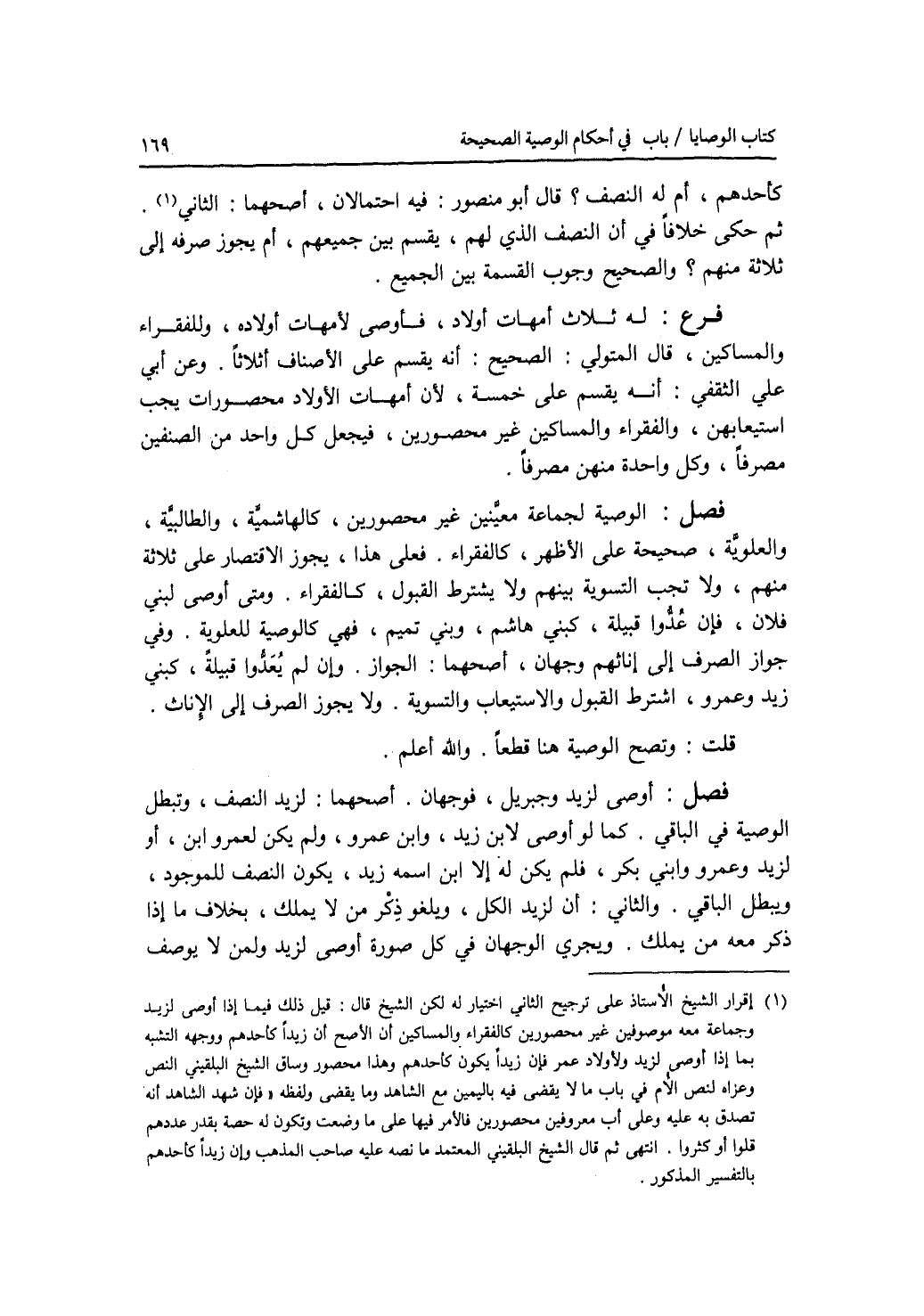 كأحدهم، أم له النصف ؟ قال أبو منصور: فيه احتمالان، أصحهما: الثاني. ثم حكى خلافا في أن النصف الذي لهم، يقسم بين جميعهم، أم يجوز صرفه إلى ثلاثة منهم ؟ والصحيح وجوب القسمة بين الجميع. فرع له ثلاث أمهات أولاد، فأوصى لامهات أولاده، وللفقراء والمساكين، قال المتولي: الصحيح: أنه يقسم على الاصناف أثلاثا. وعن أبي علي الثقفي: أنه يقسم على خمسة، لان أمهات الاولاد محصورات يجب استيعابهن، والفقراء والمساكين غير محصورين، فيجعل كل واحد من الصنفين مصرفا، وكل واحدة منهن مصرفا. فصل الوصية لجماعة معينين غير محصورين، كالهاشمية، والطالبية، والعلوية، صحيحة على الاظهر، كالفقراء. فعلى هذا، يجوز الاقتصار على ثلاثة منهم، ولا تجب التسوية بينهم ولا يشترط القبول، كالفقراء. ومتى أوصى لبني فلان. فإن عدوا قبيلة، كبني هاشم، وبني تميم، فهي كالوصية للعلوية. وفي جواز الصرف إلى إناثهم وجهان، أصحهما: الجواز. وإن لم يعدوا قبيلة، كبني زيد وعمرو، اشترط القبول والاستيعاب والتسوية. ولا يجوز الصرف إلى الاناث. قلت: وتصح الوصية هنا قطعا. والله أعلم. فصل أوصى لزيد وجبريل، فوجهان. أصحهما: لزيد النصف، وتبطل الوصية في الباقي. كما لو أوصى لابن زيد، وابن عمرو، ولم يكن لعمرو ابن، أو لزيد وعمرو وابني بكر، فلم يكن له إلا ابن اسمه زيد، يكون النصف للموجود، ويبطل الباقي. والثاني: أن لزيد الكل، ويلغو ذكر من لا يملك، بخلاف ما إذا ذكر معه من يملك. ويجري الوجهان في كل صورة أوصى لزيد ولمن لا يوصف