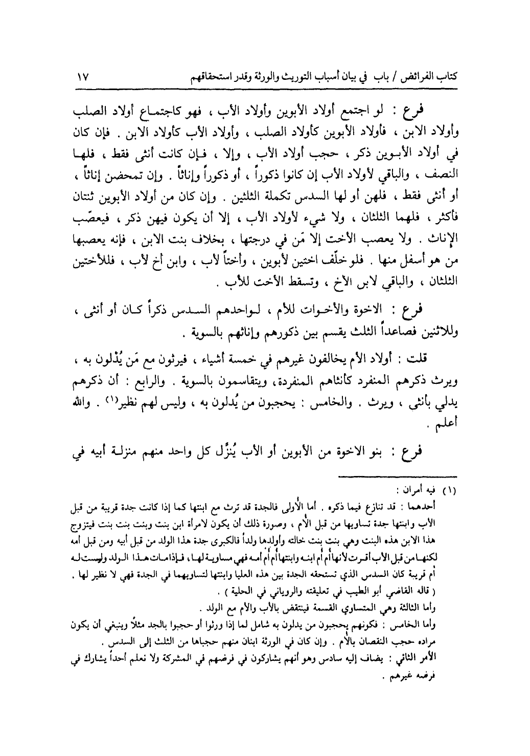 فرع لو اجتمع أولاد الابوين وأولاد الاب، فهو كاجتماع أولاد الصلب وأولاد الابن، فأولاد الابوين كأولاد الصلب، وأولاد الاب كأولاد الابن. فإن كان في أولاد الابوين ذكر، حجب أولاد الاب، وإلا، فإن كانت أنثى فقط، فلها النصف، والباقي لاولاد الاب إن كانوا ذكورا، أو ذكورا وإناثا. وإن تمحضن إناثا، أو أنثى فقط، فلهن أو لها السدس تكملة الثلثين. وإن كان من أولاد الابوين ثنتان فأكثر، فلهما الثلثان، ولا شئ لاولاد الاب، إلا أن يكون فيهن ذكر، فيعصب الاناث. ولا يعصب الاخت إلا من في درجتها، بخلاف بنت الابن، فإنه يعصبها من هو أسفل منها. فلو خلف اختين لابوين، وأختا لاب، وابن أخت لاب، فللاختين الثلثان، والباقي لابن الاخ، وتسقط الاخت للاب. فرع الاخوة والاخوات للام، لواحدهم السدس ذكرا كان أو أنثى، وللاثنين فصاعدا الثلث يقسم بين ذكورهم وإناثهم بالسوية. قلت: أولاد الام يخالفون غيرهم في خمسة أشياء، فيرثون مع من يدلون به، ويرث ذكرهم المنفرد كأنثاهم المنفردة، ويتقاسمون بالسوية. والرابع: أن ذكرهم يدلي بأنثى، ويرث. والخامس: يحجبون من يدلون به، وليس لهم نظير. والله أعلم. فرع بنو الاخوة من الابوين أو الاب ينزل كل واحد منهم منزلة أبيه في