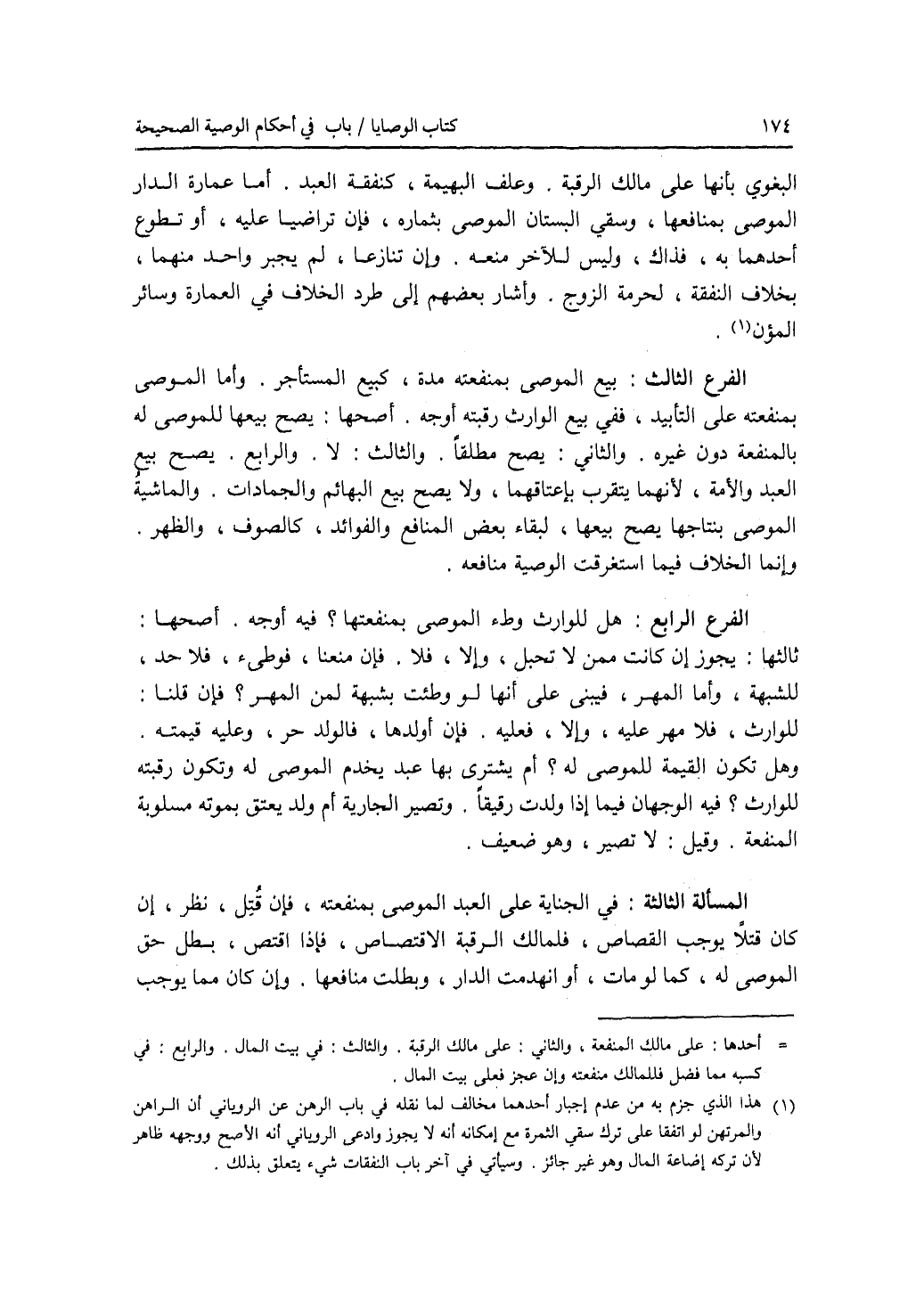 البغوي بأنها على مالك الرقبة. وعلف البهيمة، كنفقة العبد. أما عمارة الدار الموصى بمنافعها، وسقي البستان الموصى بثماره، فإن تراضيا عليه، أو تطوع أحدهما به، فذاك، وليس للآخر منعه. وإن تنازعا، لم يجبر واحد منهما، بخلاف النفقة، لحرمة الزوج. وأشار بعضهم إلى طرد الخلاف في العمارة وسائر المؤن. الفرع الثالث: بيع الموصى بمنفعته مدة، كبيع المستأجر. وأما الموصى بمنفعته على التأبيد، ففي بيع الوارث رقبته أوجه. أصحها: يصح بيعها للموصى له بالمنفعة دون غيره. والثاني: يصح مطلقا. والثالث: لا. والرابع: يصح بيع العبد والامة، لانهما يتقرب باعتاقهما، ولا يصح بيع البهائم والجمادات. والماشية الموصى بنتاجها يصح بيعها، لبقاء بعض المنافع والفوائد، كالصوف، والظهر. وإنما الخلاف فيما استغرقت الوصية منافعه. الفرع الرابع: هل للوارث وطئ الموصى بمنفعتها ؟ فيه أوجه. أصحها: ثالثها: يجوز إن كانت ممن لا تحبل، وإلا، فلا. فإن منعنا، فوطئ، فلا حد، للشبهة، وأما المهر، فيبنى على أنها لو وطئت بشبهة لمن المهر ؟ فإن قلنا: للوارث، فلا مهر عليه، وإلا، فعليه. فإن أولدها، فالولد حر، وعليه قيمته. وهل تكون القيمة للموصى له ؟ أم يشترى بها عبد يخدم الموصى له وتكون رقبته للوارث ؟ فيه الوجهان فيما إذا ولدت رقيقا. وتصير الجارية أم ولد يعتق بموته مسلوبة المنفعة. وقيل: لا تصير، وهو ضعيف. المسألة الثالثة: في الجناية على العبد الموصى بمنفعته، فإن قتل، نظر، إن كان قتلا يوجب القصاص، فلمالك الرقبة الاقتصاص، فإذا اقتص، بطل حق الموصى له، كما لو مات، أو انهدمت الدار، وبطلت منافعها. وإن كان مما يوجب
