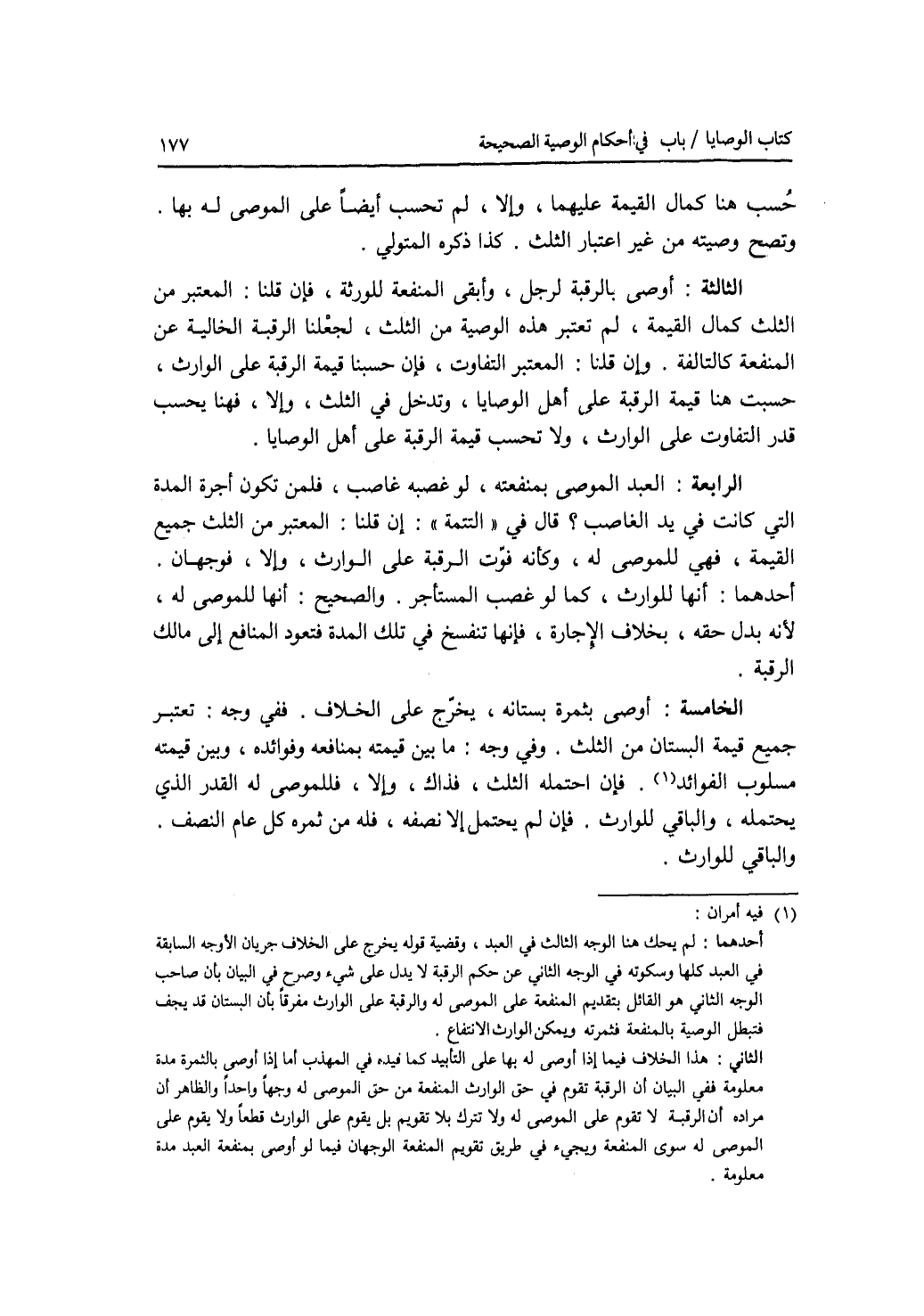 حسب هنا كمال القيمة عليهما، وإلا، لم تحسب أيضا على الموصى له بها. وتصح وصيته من غير اعتبار الثلث. كذا ذكره المتولي. الصورة الثالثة: أوصى بالرقبة لرجل، وأبقى المنفعة للورثة، فإن قلنا: المعتبر من الثلث كمال القيمة، لم تعتبر هذه الوصية من الثلث، لجعلنا الرقبة الخالية عن المنفعة كالتالفة. وإن قلنا: المعتبر التفاوت، فإن حسبنا قيمة الرقبة على الوارث، حسبت هنا قيمة الرقبة على أهل الوصايا، وتدخل في الثلث، وإلا، فهنا يحسب قدر التفاوت على الوارث، ولا تحسب قيمة الرقبة على أهل الوصايا. الصورة الرابعة: العبد الموصى بمنفعته، لو غصبه غاصب، فلمن تكون أجرة المدة التي كانت في يد الغاصب ؟ قال في التتمة: إن قلنا: المعتبر من الثلث جميع القيمة، فهي للموصى له، وكأنه فوت الرقبة على الوارث، وإلا، فوجهان. أحدهما: أنها للوارث، كما لو غصب المستأجر. والصحيح: أنها للموصى له، لانه بدل حقه، بخلاف الاجارة، فانها تنفسخ في تلك المدة فتعود المنافع إلى مالك الرقبة. الصورة الخامسة: أوصى بثمرة بستانه، يخرج على الخلاف. ففي وجه: تعتبر جميع قيمة البستان من الثلث. وفي وجه: ما بين قيمته بمنافعه وفوائده، وبين قيمته مسلوب الفوائد. فإن احتمله الثلث، فذا ك، وإلا، فللموصى له القدر الذي يحتمله، والباقي للوارث. فإن لم يحتمل إلا نصفه، فله من ثمره كل عام النصف. والباقي للوارث.