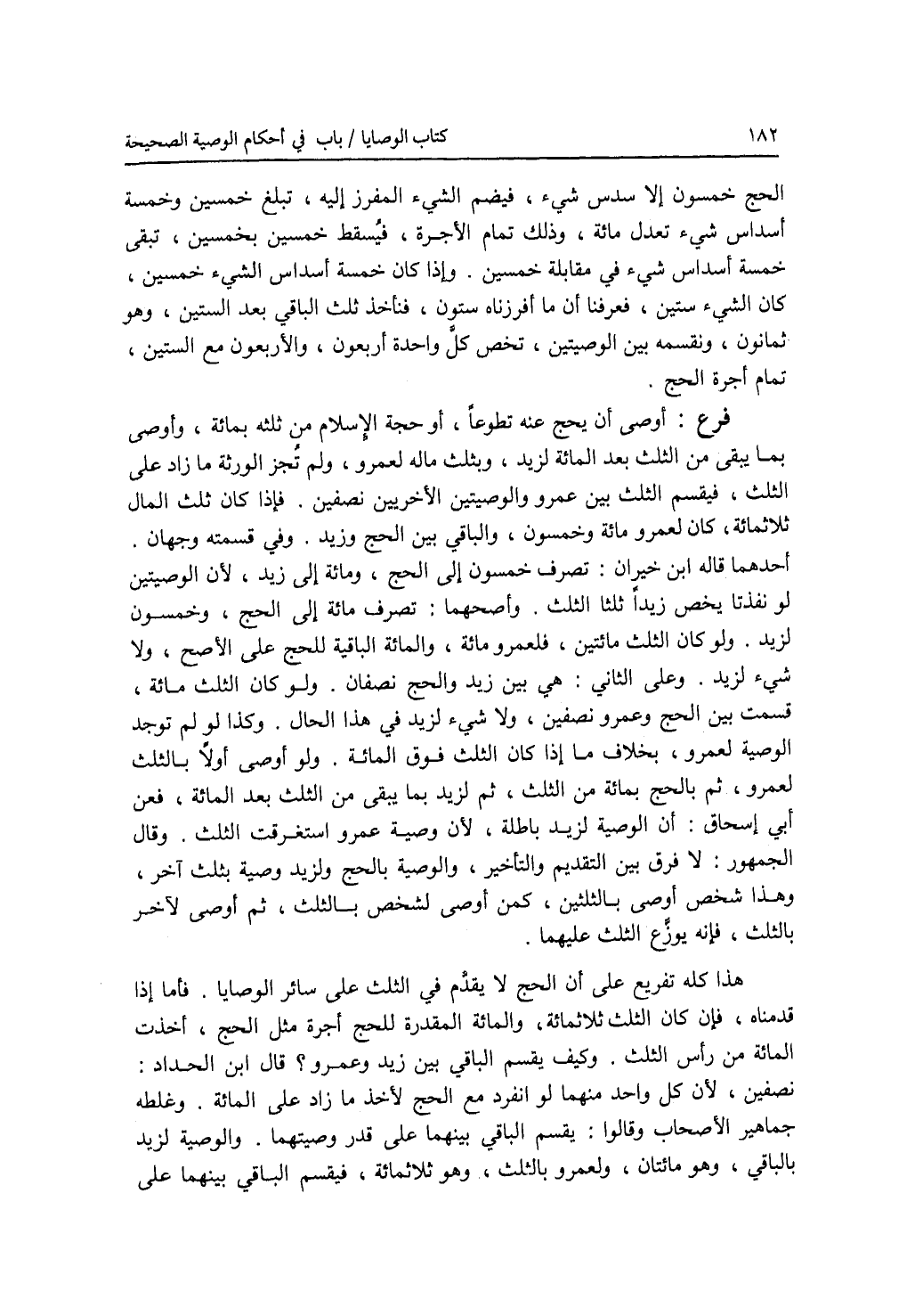 الحج خمسون إلا سدس شئ، فيضم الشئ المفرز إليه، تبلغ خمسين وخمسة أسداس شئ تعدل مائة، وذلك تمام الاجرة، فيسقط خمسين بخمسين، تبقى خمسة أسداس شئ في مقابلة خمسين. وإذا كان خمسة أسداس الشئ خمسين، كان الشئ ستين، فعرفنا أن ما أفرزناه ستون، فنأخذ ثلث الباقي بعد الستين، وهو ثمانون، ونقسمه بين الوصيتين، تخص كل واحدة أربعون والاربعون مع الستين، تمام أجرة الحج. فرع أوصى أن يحج عنه تطوعا، أو حجة الاسلام من ثلثه بمائة، وأوصى بما يبقى من الثلث بعد المائة لزيد، وبثلث ماله لعمرو، ولم تجز الورثة ما زاد على الثلث، فيقسم الثلث بين عمرو والوصيتين الاخريين نصفين. فإذا كان ثلث المال ثلثمائة، كان لعمرو مائة وخمسون، والباقي بين الحج وزيد. وفي قسمته وجهان. أحدهما قاله ابن خيران: تصرف خمسون إلى الحج، ومائة إلى زيد، لان الوصيتين لو نفذنا يخص زيدا ثلثا الثلث. وأصحهما: تصرف مائة إلى الحج، وخمسون لزيد. ولو كان الثلث مائتين، فلعمرو مائة، والمائة الباقية للحج على الاصح، ولا شئ لزيد. وعلى الثاني: هي بين زيد والحج نصفان. ولو كان الثلث مائة، قسمت بين الحج وعمرو نصفين، ولا شئ لزيد في هذا الحال. وكذا لو لم توجد الوصية لعمرو، بخلاف ما إذا كان الثلث فوق المائة. ولو أوصي أولا بالثلث لعمرو، ثم بالحج بمائة من الثلث، ثم لزيد بما يبقى من الثلث بعد المائة، فعن أبي إسحق: أن الوصية لزيد باطلة، لان وصية عمرو استغرقت الثلث. وقال الجمهور: لا فرق بين التقديم والتأخير، والوصية بالحج ولزيد وصية بثلث آخر، وهذا شخص أوصى بالثلثين، كمن أوصى لشخص بالثلث، ثم أوصى لآخر بالثلث، فإنه يوزع الثلث عليهما. هذا كله تفريع على أن الحج لا يقدم في الثلث على سائر الوصايا. فأما إذا قدمناه، فإن كان الثلث ثلثمائة، والمائة المقدرة للحج أجرة مثل الحج، أخذت المائة من رأس الثلث. وكيف يقسم الباقي بين زيد وعمرو ؟ قال ابن الحداد: نصفين، لان كل واحد منهما لو انفرد مع الحج لاخذ ما زاد على المائة. وغلطه جماهير الاصحاب وقالوا: يقسم الباقي بينهما على قدر وصيتهما. والوصية لزيد بالباقي، وهو مائتان، ولعمرو بالثلث، وهو ثلثمائة، فيقسم الباقي بينهما على