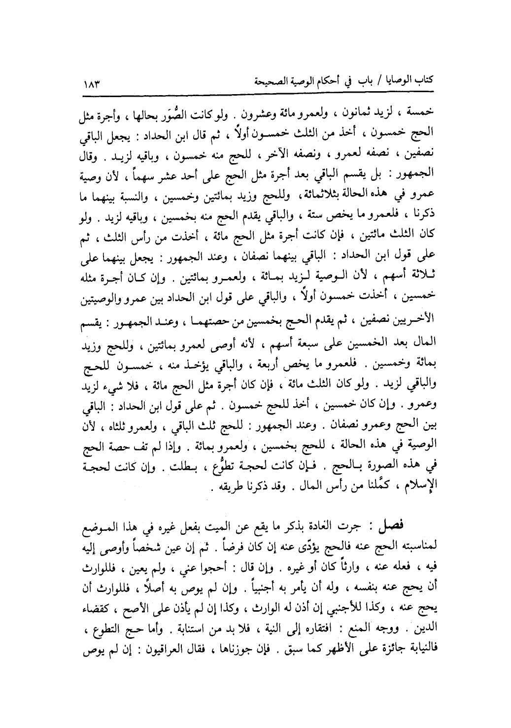 خمسة، لزيد ثمانون، ولعمرو مائة وعشرون. ولو كانت الصور بحالها، وأجرة مثل الحج خمسون، أخذ من الثلث خمسون أولا، ثم قال ابن الحداد: يجعل الباقي نصفين، نصفه لعمرو، ونصفه الآخر، للحج منه خمسون، وباقيه لزيد. وقال الجمهور: بل يقسم الباقي بعد أجرة مثل الحج على أحد عشر سهما، لان وصية عمرو في هذه الحالة بثلثمائة، وللحج وزيد بمائتين وخمسين، والنسبة بينهما ما ذكرنا، فلعمرو ما يخص ستة، والباقي يقدم الحج منه بخمسين، وباقيه لزيد. ولو كان الثلث مائتين، فإن كانت أجرة مثل الحج مائة، أخذت من رأس الثلث، ثم على قول ابن الحداد: الباقي بينهما نصفان، وعند الجمهور: يجعل بينهما على ثلاثة أسهم، لان الوصية لزيد بمائة، ولعمرو بمائتين. وإن كان أجرة مثله خمسين، أخذت خمسون أولا، والباقي على قول ابن الحداد بين عمرو والوصيتين الآخريين نصفين، ثم يقدم الحج بخمسين من حصتهما، وعند الجمهور: يقسم المال بعد الخمسين على سبعة أسهم، لانه أوصى لعمرو بمائتين، وللحج وزيد بمائة وخمسين. فلعمرو ما يخص أربعة، والباقي يؤخذ منه، خمسون للحج، والباقي لزيد. ولو كان الثلث مائة، فإن كان أجرة مثل الحج مائة، فلا شئ لزيد وعمرو وإن كان خمسين، أخذ للحج خمسون. ثم على قول ابن الحداد: الباقي بين الحج وعمرو نصفان. وعند الجمهور: للحج ثلث الباقي، ولعمرو ثلثاه، لان الوصية في هذه الحالة، للحج بخمسين، ولعمرو بمائة. وإذا لم تف حصة الحج في هذه الصورة بالحج. فإن كانت لحجة تطوع، بطلت. وإن كانت لحجة الاسلام، كملنا من رأس المال. وقد ذكرنا طريقه. فصل جرت العادة بذكر ما يقع عن الميت بفعل غيره في هذا الموضع لمناسبته الحج عنه فالحج يؤدى عنه إن كان فرضا. ثم إن عين شخصا وأوصى إليه فيه، فعله عنه، وارثا كان أو غيره. وإن قال: أحجوا عني، ولم يعين، فللوارث أن يحج عنه بنفسه، وله أن يأمر به أجنبيا. وإن لم يوص به أصلا، فللوارث أن يحج عنه، وكذا للاجنبي إن أذن له الوارث، وكذا إن لم يأذن على الاصح، كقضاء الدين. ووجه المنع: افتقاره إلى النية، فلا بد من استنابة. وأما حج التطوع، فالنيابة جائزة على الاظهر كما سبق. فإن جوزناها، فقال العراقيون: إن لم يوص