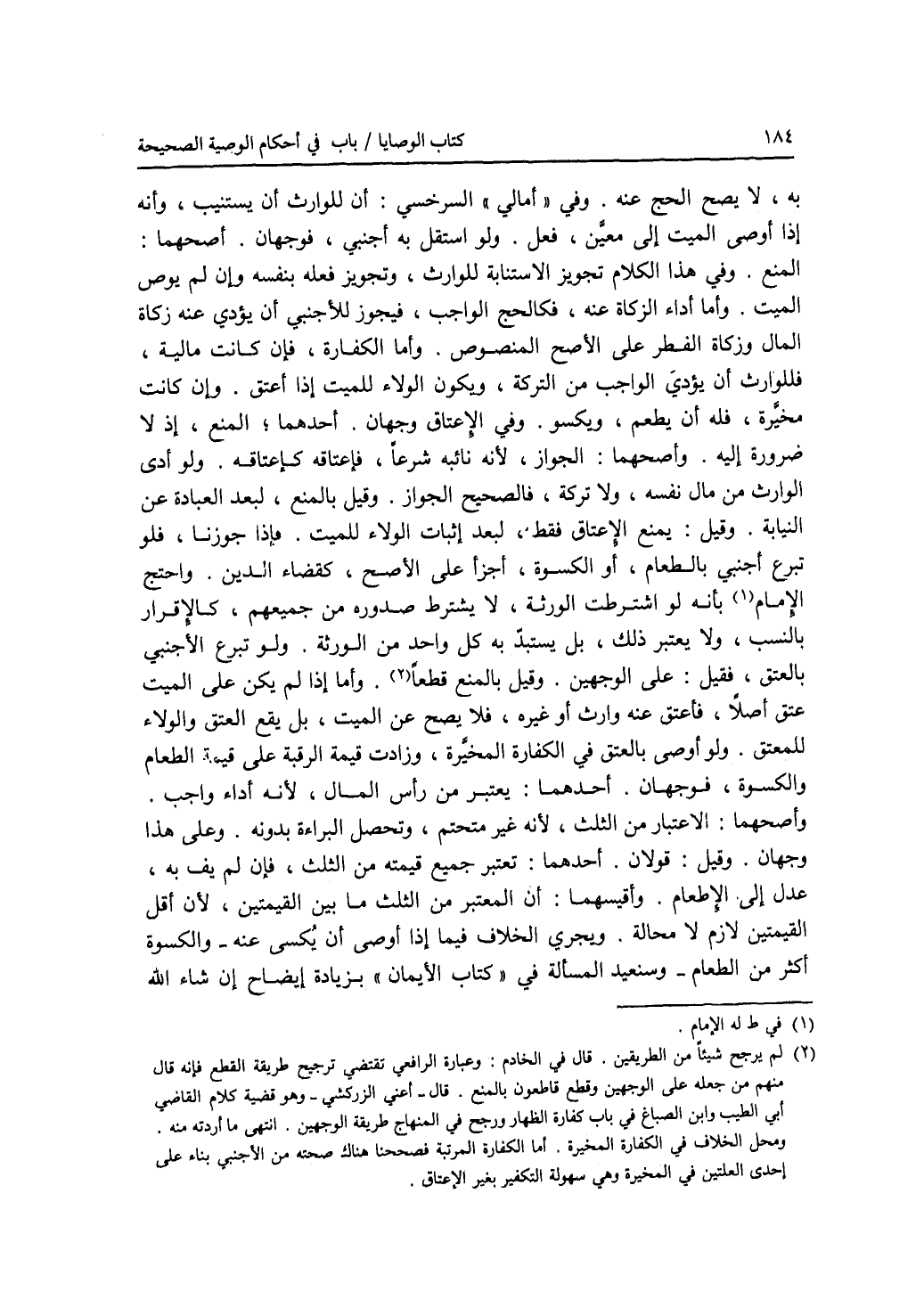 به، لا يصح الحج عنه. وفي أمالي السرخسي: أن للوارث أن يستنيب، وأنه إذا أوصى الميت إلى معين، فعل. ولو استقل به أجنبي، فوجهان. أصحهما: المنع. وفي هذا الكلام تجويز الاستنابة للوارث، وتجويز فعله بنفسه وإن لم يوص الميت. وأما أداء الزكا عنه، فكالحج الواجب، فيجوز للاجنبي أن يؤدي عنه زكاة المجل وزكاة الفطر على الاصح المنصوص. وأما الكفارة، فإن كانت مالية، فللوراث أن يؤدي الواجب من التركة، ويكون الولاء للميت إذا أعتق. وإن كانت مخيرة، فله أن يطعم، ويكسو. وفي الاعتاق وجهان. أحدهما: المنع، إذ لا ضرورة إليه. وأصحهما: الجواز، لانه نائبه شرعا، فاعتاقه كاعتاقه. ولو أدى الوارث من مال نفسه، ولا تركة، فالصحيح الجواز. وقيل بالمنع، لبعد العبادة عن النيابة. وقيل: يمنع الاعتاق فقط، لبعد إثبات الولاء للميت، فإذا جوزنا، فلو تبرع أجنبي بالطعام، أو الكسوة، أجزأ على الاصح، كقضاء الدين. واحتج له الامام بأنه لو اشترطت الورثة، لا يشترط صدوره من جميعهم، كالاقرار بالنسب، ولا يعتبر ذلك، بل يستبد به كل واحد من الورثة. ولو تبرع الاجنبي بالعتق، فقيل: على الوجهين. وقيل بالمنع قطعا. وأما إذا لم يكن على الميت عتق أصلا، فأعتق عنه وارث أو غيره، فلا يصح عن الميت، بل يقع العتق والولاء للمعتق. ولو أوصى بالعتق في الكفارة المخيرة، وزادت قيمة الرقبة على قيمة الطعام والكسوة، فوجهان. أحدهما: يعتبر من رأس المال، لانه أداء واجب. وأصحهما: الاعتبار من الثلث، لانه غير متحتم، وتحصل البراءة بدونه، وعلى هذا وجهان. وقيل: قولان. أحدهما: تعتبر جميع قيمته من الثلث، فإن لم يف به، عدل إلى الاطعام. وأقيسهما: أن لمعتبر من الثلث ما بين القيمتين، لان أقل القيمتين لازم لا محالة. ويجري الخلاف فيما إذا أوصى أن يكسى عنه - والكسوة أكثر من الطعام - وسنعيد المسألة في كتاب الايمان بزيادة إيضاح إن شاء الله