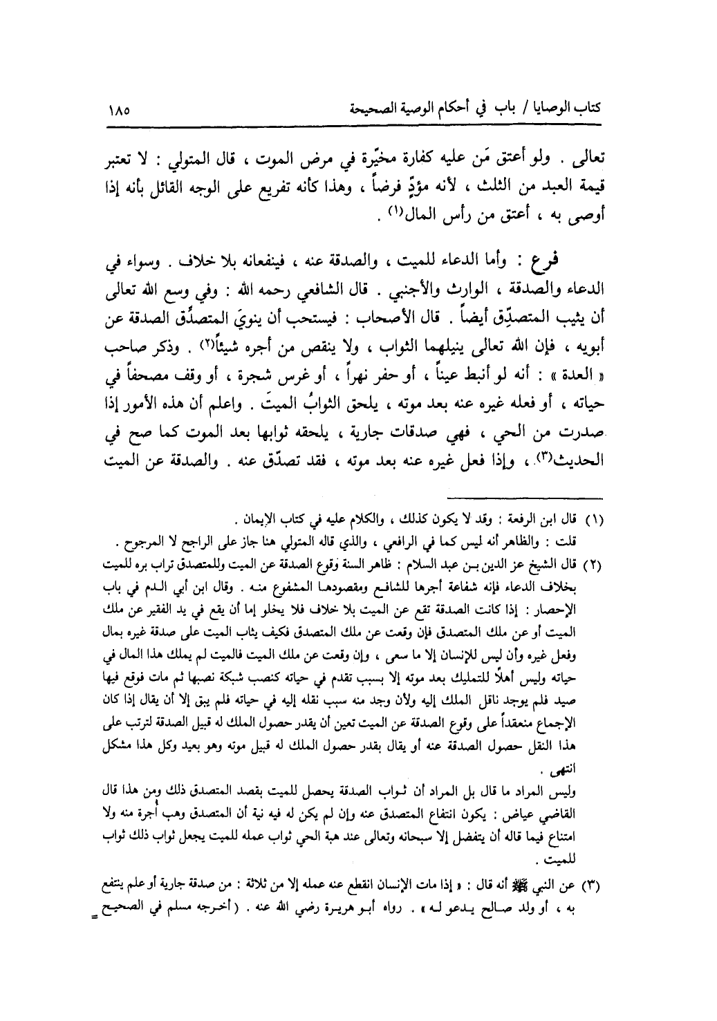 تعالى. ولو أعتق من عليه كفارة مخيرة في مرض الموت، قال المتولي: لا تعتبر قيمة العبد من الثلث، لانه مؤد فرضا، وهذا كأنه تفريع على الوجه القائل بأنه إذا أوصى به، أعتق من رأس المال. فرع وأما الدعاء للميت، والصدقة عنه، فينفعانه بلا خلاف. وسواء في الدعاء والصدقة، الوارث والاجنبي. قال الشافعي رحمه الله: وفي وسع الله تعالى أن يثيب المتصدق أيضا. قال الاصحاب: فيستحب أن ينوي المتصدق الصدقة عن أبويه، فإن الله تعالى ينيلهما الثواب، ولا ينقص من أجره شيئا. وذكر صاحب العدة: أنه لو أنبط عينا، أو حفر نهرا، أو غرس شجرة، أو وقف مصحفا في حياته، أو فعله غيره عنه بعد موته، يلجق الثواب الميت. وأعلم أن هذه الامور إذا صدرت من الحي، فهي صدقات جارية، يلحقه ثوابها بعد الموت كما صح في الحديث، وإذا فعل عيره عنه بعد موته، فقد تصدق عنه. والصدقة عن الميت