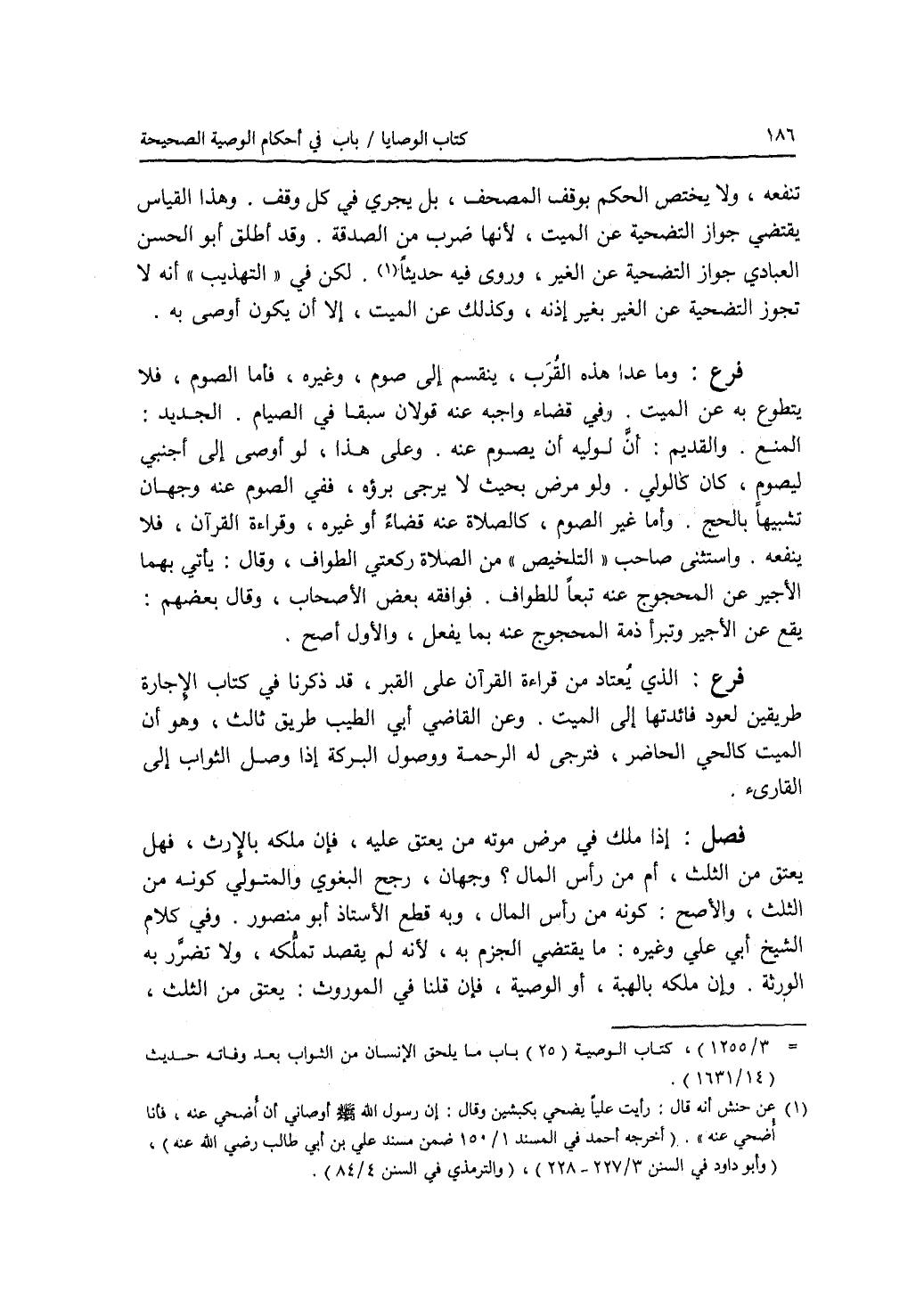 تنفعه، ولا يختص الحكم بوقف المصحف، بل يجري في كل وقف. وهذا القياس يقتضي جواز التضحية عن الميت، لانها ضرب من الصدقة. وقد أطلق أبو الحسن العبادي جواز التضحية عن الغير، وروى فيه حديثا. لكن في التهذيب أنه لا تجوز التضحية عن الغير بغير إذنه، وكذلك عن الميت، إلا أن يكون أوصى به. فرع وما عدا هذه القرب، ينقسم إلى صوم، وغيره، فأما الصوم، فلا يتطوع به عن الميت. وفي قضاء واجبه عنه قولان سبقا في الصيام. الجديد: المنع. والقديم: أن لوليه أن يصوم عنه. وعلى هذا، لو أوصى إلى أجنبي ليصوم، كان كالولي. ولو مرض بحيث لا يرجى برؤه، ففي الصوم عنه وجهان تشبيها بالحج. وأما غير الصوم، كالصلاة عنه قضاء أو غيره، وقراءة القران، فلا ينفعه. واستثنى صاحب التلخيص من الصلاة ركعتي الطواف، وقال: يأتي بهما الاجير عن المحجوج عنه تبعا للطواف. فوافقه بعض الاصحاب، وقال بعضهم: يقع عن الاجير وتبرأ ذمة المحجوج عنه بما يفعل، والاول أصح. فرع الذي يعتاد من قراءة القرآن على القبر، قد ذكرنا في كتاب الاجارة طريقين لعود فائدتها إلى الميت. وعن القاضي أبي الطيب طريق ثالث، وهو أن الميت كالحي الحاضر، فترجى له الرحمة ووصول البركة إذا وصل الثواب إلى القارئ. فصل إذا ملك في مرض موته من يعتق عليه، فإن ملكه بالارث، فهل يعتق من الثلث، أم من رأس المال ؟ وجهان، رجح البغوي والمتولي كونه من الثلث، والاصح: كونه من رأس المال، وبه قطع الاستاذ أبو منصور. وفي كلام الشيخ أبي علي وغيره: ما يقتضي الجزم به، لانه لم يقصد تملكه، ولا تضرر به الورثة. وإن ملكه بالهبة، أو الوصية، فإن قلنا في الموروث: يعتق من الثلث،