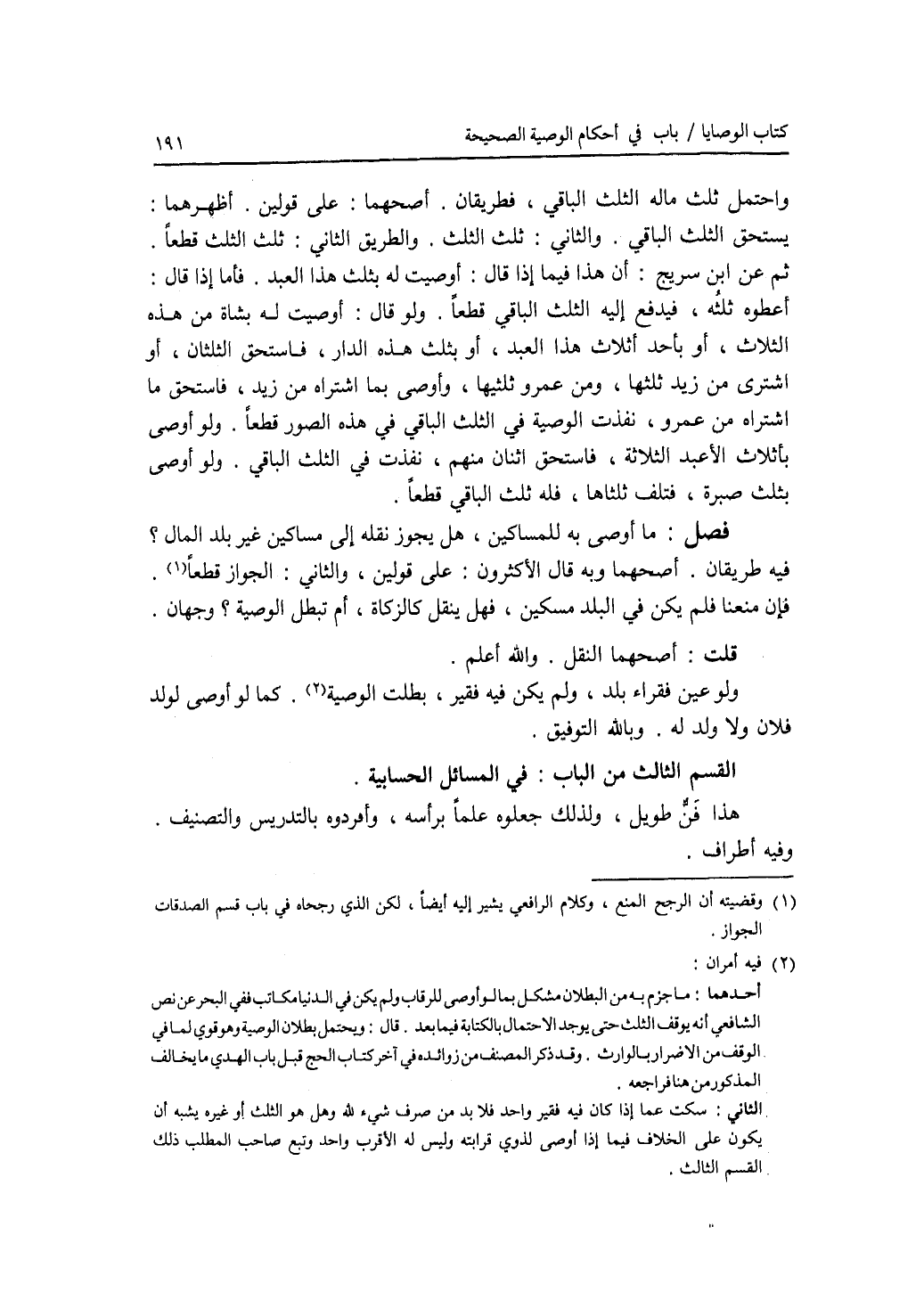 القسم الثالث من الباب : في المسائل الحسابية. هذا فن طويل، ولذلك جعلوه علما برأسه، وأفردوه بالتدريس والتصنيف. وفيه أطراف.