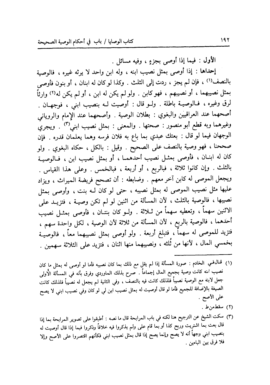الأول : فيما إذا أوصى بجزء، وفيه مسائل. إحداها: إذا أوصى بمثل نصيب ابنه، وله ابن واحد لا يرثه غيره، فالوصية بالنصف، فإن لم يجز، ردت إلى الثلث. وكذا لو كان له ابنان، أو بنون فأوصى بمثل نصيبهما، أو نصيبهم، فهو كابن. ولو لم يكن له ابن، أو لم يكن له وارثا لرق وغيره، فالوصية باطلة. ولو قال: أوصيت له بنصيب ابني، فوجهان. أصحهما عند العراقيين والبغوي: بطلان الوصية. وأصحهما عند الامام والروياني وغيرهما وبك قطع أبو منصور: صحتها. والمعنى: بمثل نصيب ابني. ويجري الوجهان فيما لو قال: بعتك عبدي بما باع به فلان فرسه وهما يعلمان قدره. فإن صححنا، فهو وصية بالنصف على الصحيح. وقيل: بالكل، حكاه البغوي. ولو كان له ابنان، فأوصى بمثل نصيب أحدهما، أو بمثل نصيب ابن، فالوصية بالثلث. وإن كانوا ثلاثة، فبالربع، أو أربعة، فبالحمس. وعلى هذا القياس. ويجعل الموصى له كابن آخر معهم. وضابطه: أن تصحح فريضة الميراث، ويزاد عليها مثل نصيب الموصى له بمثل نصيبه، حتى لو كان له بنت، وأوصى بمثل نصيبها، فالوصية بالثلث، لان المسألة من اثنين لو لم تكن وصية، فتزيد على الاثنين سهما، وتعطيه سهما من ثلاثة أسهم. ولو كان بنتان، فأوصى بمثل نصيب أحدهما، فالوصية بالربع، لان المسألة من ثلاثة لولا الوصية، لكل واحدة سهم، فتزيد للموصى له سهما، فتبلغ أربعة. ولو أوصى بمثل نصيبيهما معا، فالوصية بخمسي المال، لانها من ثلثه، ونصيبهما منها اثنان، فتزيد على الثلاثة سهمين.