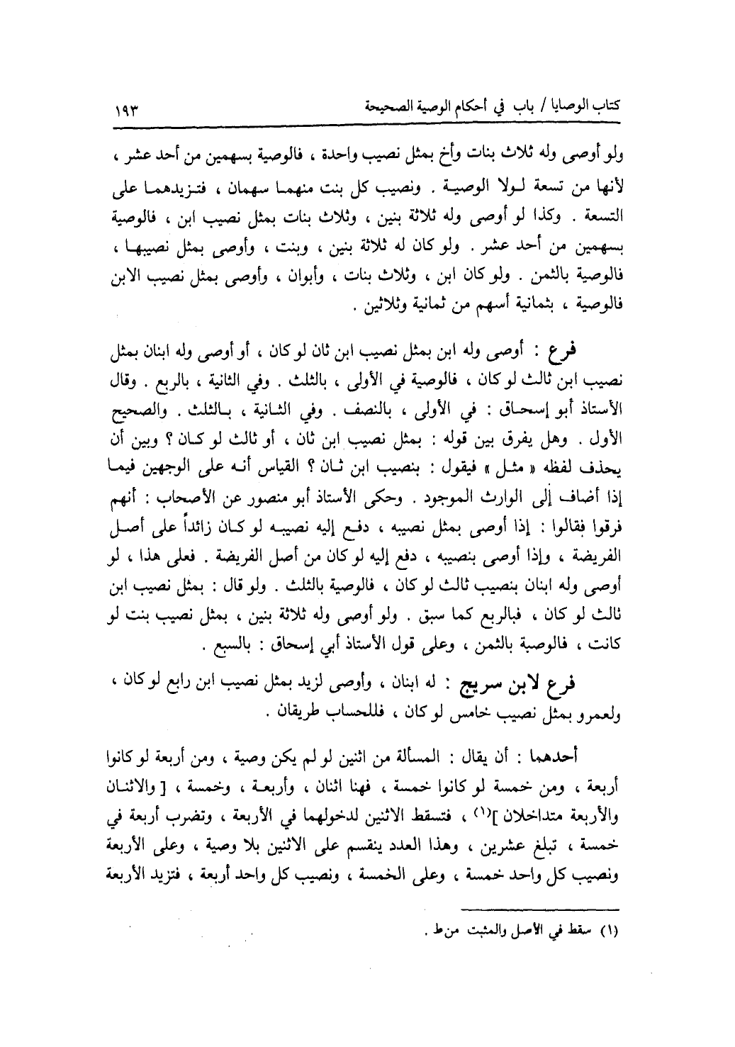 ولو أوصى وله ثلاث بنات وأخ بمثل نصيب واحدة، فالوصية بسهمين من أحد عشر. لانها من تسعة لولا الوصية. ونصيب كل بنت منهما سهمان، فتزيدهما على التسعة. وكذا لو أوصى وله ثلاثة بنين، وثلاث بنات بمثل نصيب ابن، فالوصية بسهمين من أحد عشر. ولو كان له ثلاثة بنين، وبنت، وأوصى بمثل نصيبها، فالوصية بالثمن. ولو كان ابن، وثلاث بنات، وأبوان، وأوصى بمثل نصيب الابن، فالوصية بثمانية أسهم من ثمانية وثلاثين. فرع أوصى وله ابن بمثل نصيب ابن ثان لو كان، أو أوصى وله ابنان بمثل نصيب ابن ثالث لو كان، فالوصية في الاولى، بالثلث. وفي الثانية، بالربع. وقال الاستاذ أبو إسحق: في الاولى، بالنصف. وفي الثانية. بالثلث والصحيح الاول. وهل يفرق بين قوله: بمثل نصيب ب ابن ثان، أو ثالث لو كان ؟ وبين أن يحذف لفظه مثل فيقول: بنصيب ابن ثان ؟ القياس أنه على الوجهين فيما إذا أضاف إلى الوارث الموجود. وحكى الاستاذ أبو منصور عن الاصحاب: أنهم فرقوا فقالوا: إذا أوصى بمثل نصيبه، دفع إليه نصيبه لو كان زائدا على أصل الفريضة، وإذا أوصى بنصيبه، دفع إليه لو كان من أصل الفريضة. فعلى هذا، لو أوصى وله ابنان بنصيب ثالث لو كان، فالوصية بالثلث. ولو قال: بمثل نصيب ابن ثالث لو كان، فبالربع كما سبق. ولو أوصى وله ثلاثة بنين، بمثل نصيب بنت لو كانت، فالوصية بالثمن، وعلى قول الاستاذ أبي إسحق: بالسبع. فرع لابن سريج له ابنان، وأوصى لزيد بمثل نصيب ابن رابع لو كان، ولعمرو بمثل نصيب خامس لو كان، فللحساب طريقان. أحدهما: أن يقال: المسألة من اثنين لو لم يكن وصية، ومن أربعة لو كانوا أربعة، ومن خمسة لو كانوا خمسة، فهنا اثنان، وأرجعة، وخمسة، والاثنان والاربعة متداخلان، فتسقط الاثنين لدخولهما في الاربعة، وتضرب أربعة في خمسة، تبلغ عشرين، وهذا العدد ينقسم على الاثنين بلا وصية، وعلى الاربعة لو كانوا، ونصيب كل واحد خمسة، وعلى الخمسة لو كانوا، ونصيب كل واحد أربعة، فتزيد الاربعة