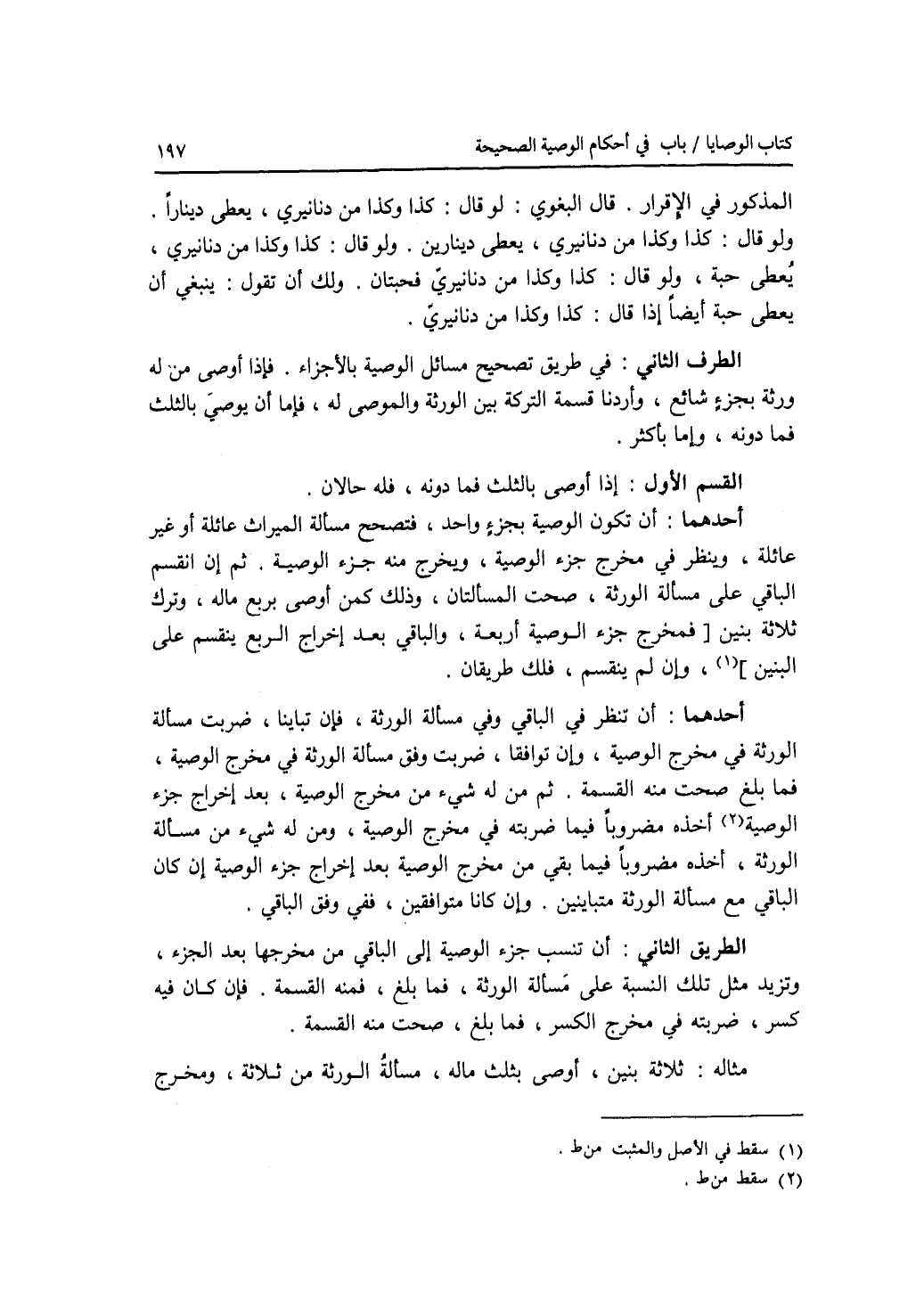 الطرف الثاني : في طريق تصحيح مسائل الوصية بالأجزاء. فإذا أوصى من له ورثة بجزء شائع، وأردنا قسمة التركة بين الورثة والموصى له، فاما أن يوصي بالثلث فما دونه، وإما بأكثر. القسم الاول: إذا أوصى بالثلث فما دونه، فله حالان. أحدهما: أن تكون الوصية بجزء واحد، فتصحح مسألة الميراث عائلة أو غير عائلة، وينظر في مخرج جزء الوصية، ويخرج منه جزء الوصية. ثم إن انقسم الباقي على مسألة الورثة، صحت المسألتان، وذلك كمن أوصى بربع ماله، وترك ثلاثة بنين فمخرج جزء الوصية أربعة، والباقي بعد إخراج الربع ينقسم على البنين، وإن لم ينقسم، فلك طريقان. أحدهما: أن تنظر في الباقي وفي مسألة الورثة، فإن تباينا، ضربت مسألة الورثة في مخرج الوصية، وإن توافقا، ضربت وفق مسألة الورثة في مخرج الوصية، فما بلغ صحت منه القسمة. ثم من له شئ من مخرج الوصية، بعد إخراج جزء الوصية أخذه مضروبا فيما ضربته في مخرج الوصية، ومن له شئ من مسألة الورثة، أخذه مضروبا فيما بقي من مخرج الوصية بعد إخراج جزء الوصية إن كان الباقي مع مسألة الورثة متباينين. وإن كانا متوافقين، ففي وفق الباقي. الطريق الثاني: أن تنسب جزء الوصية إلى الباقي من مخرجها بعد الجزء، وتزيد مثل تلك النسبة على مسألة الورثة، فما بلغ، فمنه القسمة. فإن كان فيه كسر، ضربته في مخرج الكسر، فما بلغ، صحت منه القسمة. مثاله: ثلاثة بنين، أوصى بثلث ماله، مسألة الورثة من ثلاثة، ومخرج