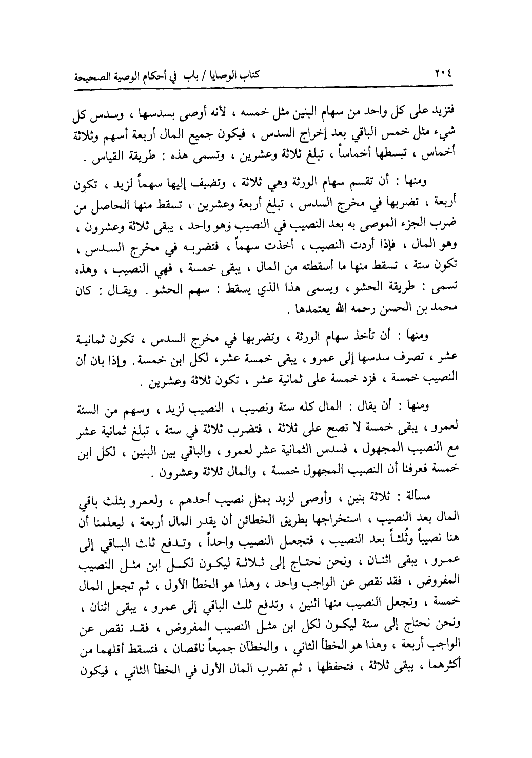 فتزيد على كل واحد من سهام البنين مثل خمسه، لانه أوصى بسدسها، وسدس كل شئ مثل خمس الباقي بعد إخراج السدس، فيكون جميع المال أربعة أسهم وثلاثة أخماس، تبسطها أخماسا، تبلغ ثلاثة وعشرين، وتسمى هذه: طريقة القياس. ومنها: أن تقسم سهام الورثة وهي ثلاثة، وتضيف إليها سهما لزيد، تكون أربعة، تضربها في مخرج السدس، تبلغ أربعة وعشرين، تسقط منها الحاصل من ضرب الجزء الموصى به بعد النصيب في النصيب وهو واحد، يبقى ثلاثة وعشرون، وهو المال، فإذا أردت النصيب، أخذت سهما، فتضربه في مخرج السدس، تكون ستة، تسقط منها ما أسقطته من المال، يبقى خمسة، فهي النصيب، وهذه تسمى: طريقة الحشو، ويسمى هذا الذي يسقط: سهم الحشو. ويقال: كان محمد بن الحسن رحمه الله يعتمدها. ومنها: أن تأخذ سهام الورثة، وتضربها في مخرج السدس، تكون ثمانية عشر، تصرف سدسها إلى عمرو، يبقى خمسة عشر، لكل ابن خمسة. وإذا بان أن النصيب خمسة، فزد خمسة على ثمانية عشر، تكون ثلاثة وعشرين. ومنها: أن يقال: المال كله ستة ونصيب، النصيب لزيد، وسهم من الستة لعمرو، يبقى خمسة لا تصح على ثلاثة، فتضرب ثلاثة في ستة، تبلغ ثمانية عشر مع النصيب المجهول، فسدس الثمانية عشر لعمرو، والباقي بين البنين، لكل ابن خمسة. فعرفنا أن النصيب المجهول خمسة، والمال ثلاثة وعشرون. مسألة: ثلاثة بنين، وأوصى لزيد بمثل نصيب أحدهم، ولعمرو بثلث باقي المال بعد النصيب، استخراجها بطريق الخطائن أن يقدر المال أربعة، ليعلمنا أن هنا نصيبا وثلثا بعد النصيب، فتجعل النصيب واحدا، وتدفع ثلث الباقي إلى عمرو، يبقى الجنان، ونحن نحتاج إلى ثلاثة ليكون لكل ابن مثل النصيب المفروض، فقد نقص عن الواجب واحد، وهذا هو الخطأ الاول، ثم تجعل المال خمسة، وتجعل النصيب منها اثنين، وتدفع ثلث الباقي إلى عمرو، يبقى اثنان، ونحن نحتاج إلى ستة ليكون لكل ابن مثل النصيب المفروض، فقد نقص عن الواجب أربعة، وهذا هو الخطأ الثاني، والخطآن جميعا ناقصان، فتسقط أقلهما من أكثرهما، يبقى ثلاثة، فتحفظها، ثم تضرب المال الاول في الخطأ الثاني، فيكون