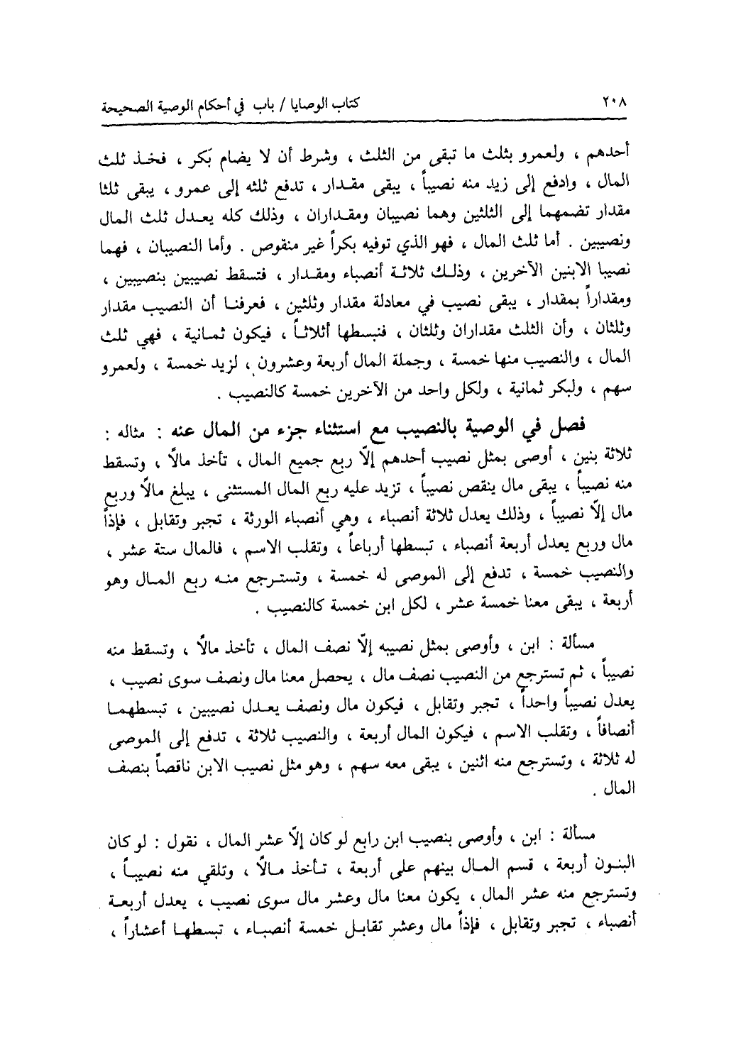 فصل في الوصية بالنصيب مع استثناء جزء من المال عنه مثاله: ثلاثة بنين، أوصى بمثل نصيب أحدهم إلا ربع جميع المال، تأخذ مالا، وتسقط منه نصيبا، يبقى مال ينقص نصيجا، تزيد عليه ربع المال المستثنى، يبلغ مالا وربع مال إلا نصيبا، وذلك يعدل ثلاثة أنباء، وهي أنصباء الورثة، تجبر وتقابل، فإذا مال وربع يعدل أربعة أنصباء، تبسطها أرباعا، وتقلب الاسم، فالمال ستة عشر، والنصيب خمسة، تدفع إلى الموصى له خمسة، وتسترجع منه ربع المال وهو أربعة، يبقى معنا خمسة عشر، لكل ابن خمسة كالنصيب. مسألة: ابن، وأوصى بمثل نصيبه إلا نصف المال، تأخذ مالا، وتسقط منه نصيبا، ثم تسترجع من النصيب نصف مال، يحصل معنا مال ونصف سوى نصيب، يعدل نصيبا واحدا، تجبر وتقابل، فيكون مال ونصف يعدل نصيبين، تبسطهما أنصافا، وتقلب الاسم، فيكون المال أربعة، والنصيب ثلاثة، تدفع إلى الموصى له ثلاثة، وتسترجع منه اثنين، يبقى معه سهم، وهو مثل نصيب الابن ناقصا بنصف المال. مسألة: ابن، وأوصى بنصيب ابن رابع لو كان إلا عشر المال، نقول: لو كان البنون أربعة، قسم المال بينهم على أربعة، تأخذ مالا، وتلقي منه نصيبا، وتسترجع منه عشر المال، يكون معنا مال وعشر مال سوى نصيب، يعدل أربعة أنصباء، تجبر وتقابل، فإذا مال وعشر مال تقابل خمسة أنصباء، تبسطها أعشارا،