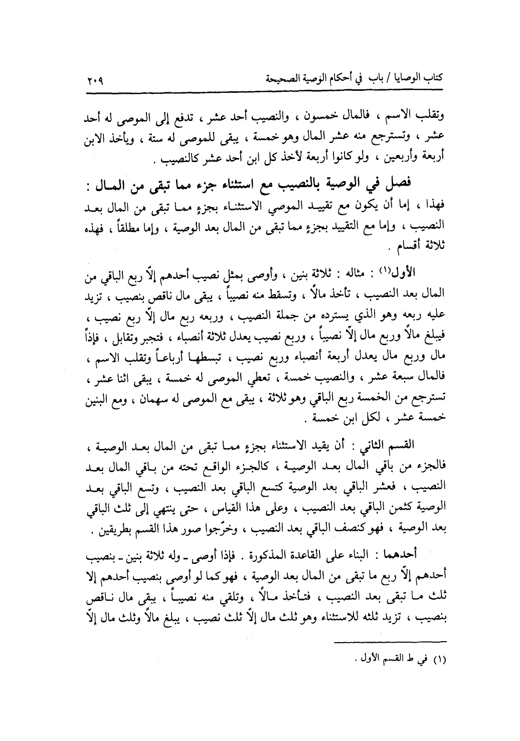 فصل في الوصية بالنصيب مع استثناء جزء مما تبقى من المال فهذا، إما أن يكون مع تقييد الموصي الاستثناء بجزء مما تبقى من المال بعد النصيب، وإما مع التقييد بجزء مما تبقى من المال بعد الوصية، وإما مطلقا، فهذه ثلاثة أقسام. (القسم) الاول: مثاله: ثلاثة بنين، وأوصى بمثل نصيب أحدهم إلا ربع الباقي من المال بعد النصيب، تأخذ مالا وتسقط منه نصيبا، يبقى مال ناقص بنصيب، تزيد عليه ربعه وهو الذي يسترده من جملة النصيب، وربعه ربع مال إلا ربع نصيب، فيبلغ مالا وربع مال إلا نصيبا، وربع نصيب يعدل ثلاثة أنصباء، فتجبر وتقابل، فإذا مال وربع مال يعدل أربعة أنصباء وربع نصيب، تبسطها أرباعا وتقلب الاسم، فالمال سبعة عشر، والنصيب خمسة، تعطي الموصى له خمسة، يبقى اثنا عشر، تسترجع من الخمسة ربع الباقي وهو ثلاثة، يبقى مع الموصى له سهمان، ومع البنين خمسة عشر، لكل ابن خمسة. القسم الثاني: أن يقيد الاستثناج بجزء مما تبقى من المال بعد الوصية، فالجزء من باقي المال بعد الوصية، كالجزء الواقع تحته من باقي المال بعد النصيب، فعشر الباقي بعد الوصية كتسع الباقي بعد النصيب، وتسع الباقي بعد الوصية كثمن الباقي بعد النصيب، وعلى هذا القياس، حتى ينتهي إلى ثلث الباقي بعد الوصية، فهو كنصف الباقي بعد النصيب، وخرجوا صور هذا القسم بطريقين. أحدهما: البناء على القاعدة المذكورة. فإذا أوصى - وله ثلاثة بنين - بنصيب أحدهم إلا ربع ما تبقى من المال بعد الوصية، فهو كما لو أوصى بنصيب أحدهم إلا ثلث ما تبقى بعد النصيب، فتأخذ مالا، وتلقي منه نصيبا، يبقى مال ناقص بنصيب، تزيد ثلثه للاستثناء وهو ثلث مال إلا ثلث نصيب، يبلغ مالا وثلث مال إلا