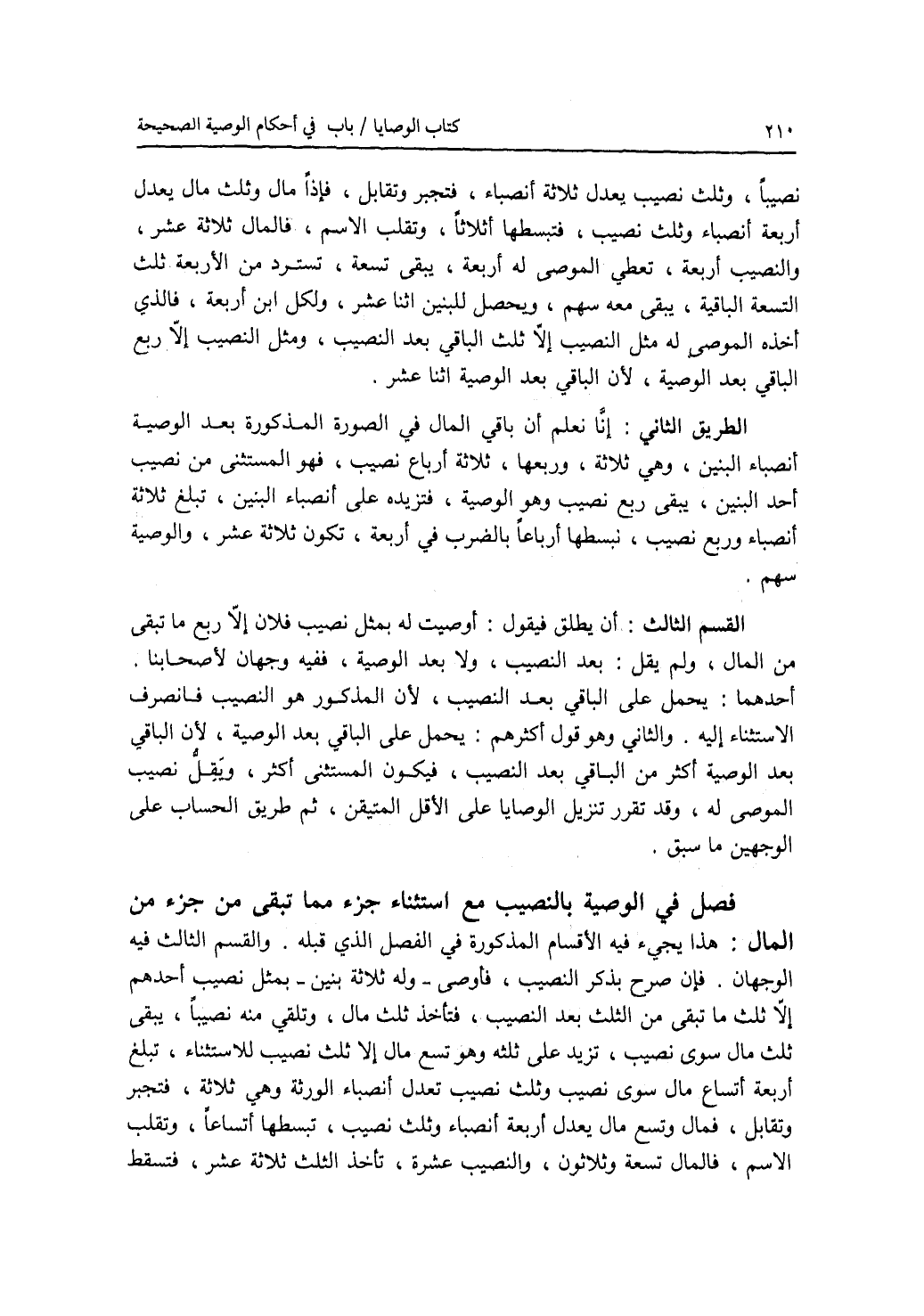 فصل في الوصية بالنصيب مع استثناء جزء مما تبقى من جزء من المال هذا يجئ فيه الاقسام المذكورة في الفصل الذي قبله. والقسم الثالث فيه الوجهان. فإن صرح بذكر النصيب، فأوصى - وله ثلاثة بنين - بمثل نصيب أحدهم إلا ثلث ما تبقى من الثلث بعد النصيب، فتأخذ ثلث مال، وتلقي منه نصيبا، يبقى ثلث مال سوى نصيب، تزيد على ثلثه وهو تسع مال إلا ثلث نصيب للاستثناء، تبلغ أربعة أتساع مال سوى نصيب وثلث نصيب تعدل أنصباء الورثة وهي ثلاثة، فتجبر وتقابل، فمال وتسع مال يعدل أربعة أنصباء وثلث نصيب، تبسطها أتساعا، وتقلب الاسم، فالمال تسعة وثلاثون، والنصيب عشرة، تأخذ الثلث ثلاثة عشر، فتسقط