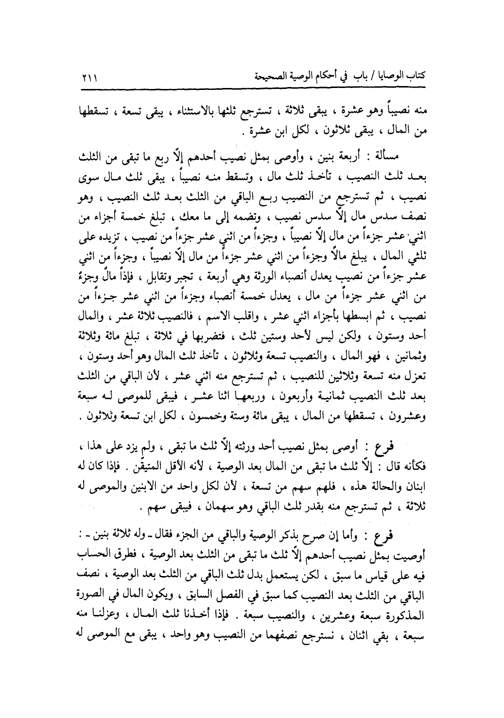 منه نصيبا وهو عشرة، يبقى ثلاثة، تسترجع ثلثها بالاستثناء، يبقى تسعة، تسقطها من المال، يبقى ثلاثون، لكل ابن عشرة. مسألة: أربعة بنين، وأوصى بمثل نصيب أحدهم إلا ربع ما تبقى من الثلث بعد ثلث النصيب، تأخذ ثلث مال، وتسقط منه نصيبا، يبقى ثلث مال سوى نصيب، ثم تسترجع من النصيب ربع الباقي من الثلث بعد ثلث النصيب، وهو نصف سدس مال إلا سدس نصيب، وتضمه إلى ما معك، تبلغ خمسة أجزاء من اثني عشر جزءا من مال إلا نصيبا، وجزءا من اثني عشر جزءا من نصيب، تزيده على ثلثي المال، يبلغ مالا وجزءا من اثني عشر جزءا من مال إلا نصيبا، وجزءا من اثني عشر جزءا من نصيب يعدل أنصباء الورثة وهي أربعة، تجبر وتقابل، فإذا مال وجزء من اثني عشر جزءا من مال، يعدل خمسة أنصباء وجزءا من اثني عشر جزءا من نصيب، ثم ابسطها بأجزاء اثني عشر، واقلب الاسم، فالنصيب ثلاثة عشر، والمال أحد وستون، ولكن ليس لاحد وستين ثلث، فتضربها في ثلاثة، تبلغ مائة وثلاثة وثمانين، فهو المال، والنصيب تسعة وثلاثون، تأخذ ثلث المال وهو أحد وستون، تعزل منه تسعة وثلاثين للنصيب، ثم تسترجع منه اثني عشر، لان الباقي من الثلث بعد ثلث النصيب ثمانية وأربعون، وربعها اثنا عشر، فيبقى للموصى له سبعة وعشرون، تسقطها من المال، يبقى مائة وستة وخمسون، لكل ابن تسعة وثلاثون. فرع أوصى بمثل نصيب أح ورثته إلا ثلث ما تبقى، ولم يزد على هذا، فكأنه قال: إلا ثلث ما تبقى من المال بعد الوصية، لانه الاقل المتيقن. فإذا كان له ابنان والحالة هذه، فلهم سهم من تسعة، لان لكل واحد من الابنين والموصى له ثلاثة، ثم تسترجع منه بقدر ثلث الباقي وهو سهمان، فيبقى سهم. فرع وأما إن صرح بذكر الوصية والباقي من الجزء فقال - وله ثلاثة بنين -: أوصيت بمثل نصيب أحدهم إلا ثلث ما تبقى من الثلث بعد الوصية، فطرق الحساب فيه على قياس ما سبق، لكن يستعمل بدل ثلث الباقي من الثلث بعد الوصية، نصف الباقي من الثلث بعد النصيب كما سبق في الفصل السابق، ويكون المال في الصورة المذكورة سبعة وعشرين، والنصيب سبعة. فإذا أخذنا ثلث المال، وعزلنا منه سبعة، بقي اثنان، نسترجع نصفهما من النصيب وهو واحد، يبقى مع الموصى له