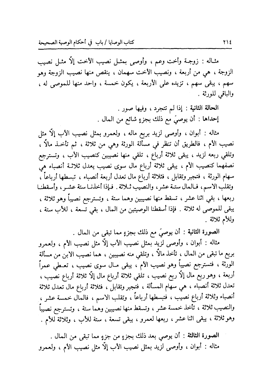 مثاله: زوجة وأخت وعم، وأوصى بمثل نصيب الاخت إلا مثل نصيب الزوجة، هي من أربعة، ونصيب الاخت سهمان، ينقص منها نصيب الزوجة وهو سهم، يبقى سهم، تزيده على الاربعة، يكون خمسة، واحد منها للموصى له، والباقي للورثة. الحالة الثانية: إذا لم تتجرد، وفيها صور. إحداها: أن يوصي مع ذلك بجزء شائع من المال. مثاله: أبوان، وأوصى لزيد بربع ماله، ولعمرو بمثل نصيب الاب إلا مثل نصيب الام، فالطريق أن تنظر في مسألة الورثة وهي من ثلاثة، ثم تأخذ مالا، وتلقي ربعه لزيد، يبقى ثلاثة أرباع، تلقي منها نصيبين كنصيب الاب، وتسترجع نصفهما كنصيب الام، يبقى ثلاثة أرباع مال سوى نصيب يعدل ثلاثة أنصباء هي سهام الورثة، فتجبر وتقابل، فثلاثة أرباع مال تعدل أربعة أنصباء، تبسطها أرباعا، وتقلب الاسم، فالمال ستة عشر، والنصيب ثلاثة. فإذا أخذنا ستة عشر، وأسقطنا ربعها، بقي اثنا عشر، تسقط منها نصيبين وهما ستة، وتسترجع نصيبا وهو ثلاثة، يبقى للموصى له ثلاثة. فإذا أسقطنا الوصيتين من المال، بقي تسعة، للاب ستة، وللام ثلاثة. الصورة الثانية: أن يوصي مع ذلك بجزء مما تبقى من المال. مثاله: أبوان، وأوصى لزيد بمثل نصيب الاب إلا مثل نصيب الام، ولعمرو ربع ما تبقى من المال، تأخذ مالا، وتلقي منه نصيبين، هما نصيب الابن من مسألة الورثة، فتسترجع نصيبا وهو نصيب الام، يبقى مال سوى نصيب، تعطي عمرا أربعة، وهو ربع مال إلا ربع نصيب، تلقي ثلاثة أرباع مال إلا ثلاثة أرباع نصيب، تعدل ثلاثة أنصباء، هي سهام المسألة، فتجبر وتقابل، فثلاثة أرباع مال تعدل ثلاثة أنصباء وثلاثة أرباع نصيب، فتبسطها أرباعا، وتقلب الاسم، فالمال خمسة عشر، والنصيب ثلاثة، تأخذ خمسة عشر، وتسقط منها نصيبين وهما ستة، وتسترجع نصيبا وهو ثلاثة، يبقى اثنا عشر، ربعها لعمرو، يبقى تسعة، ستة للاب، وثلاثة للام. الصورة الثالثة: أن يوصي بعد ذلك بجزء من جزء مما تبقى من المال. مثاله: أبوان، وأوصى لزيد بمثل نصيب الاب إلا مثل نصيب الام، ولعمرو