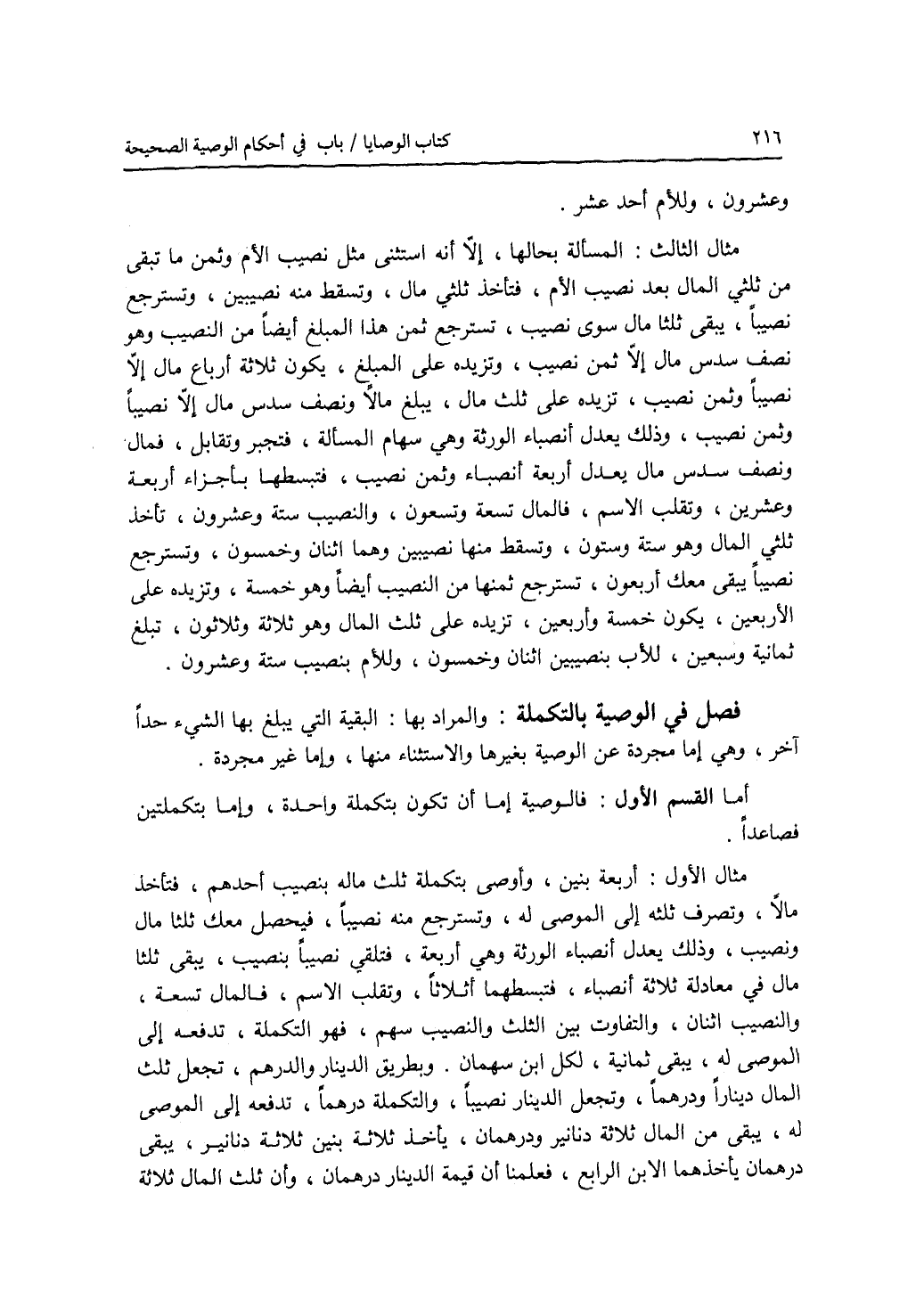 فصل في الوصية بالتكملة والمراد بها : البقية التي يبلغ بها الشئ حدا آخر، وهي إما مجردة عن الوصية بغيرها والاستثناء منها، وإما غير مجردة. أما القسم الاول: فالوصية إما أن تكون بتكملة واحدة، وإما بتكملتين فصاعدا. مثال الاول: أربعة بنين، وأوصى بتكملة ثلث ماله بنصيب أحدهم، فتأخذ مالا، وتصرف ثلث إلى ثلثه الموصى له، وتسترجع منه نصيبا، فيحصل معك ثلثا مال ونصيب، وذلك يعدل أنصباء الورثة وهي أربعة، فتلقي نصيبا بنصيب، يبقى ثلثا مال في معادلة ثلاثة أنصباء، فتبسطهما أثلاثا، وتقلب الاسم، فالمال تسعة، والنصيب اثنان، والتفاوت بين الثلث والنصيب سهم، فهو التكملة، تدفعه إلى الموصى له، يبقى ثمانية، لكل ابن سهمان. وبطريق الدينار والدرهم، تجعل ثلث المال دينارا ودرهما، وتجعل الدينار نصيبا، والتكملة درهما، تدفعه إلى الموصى له، يبقى من المال ثلاثة دنانير ودرهمان، يأخذ ثلاثة بنين ثلاثة دنانير، يبقى درهمان يأخذهما الابن الرابع، فعلمنا أن قيمة الدينار درهمان، وأن ثلث المال ثلاثة