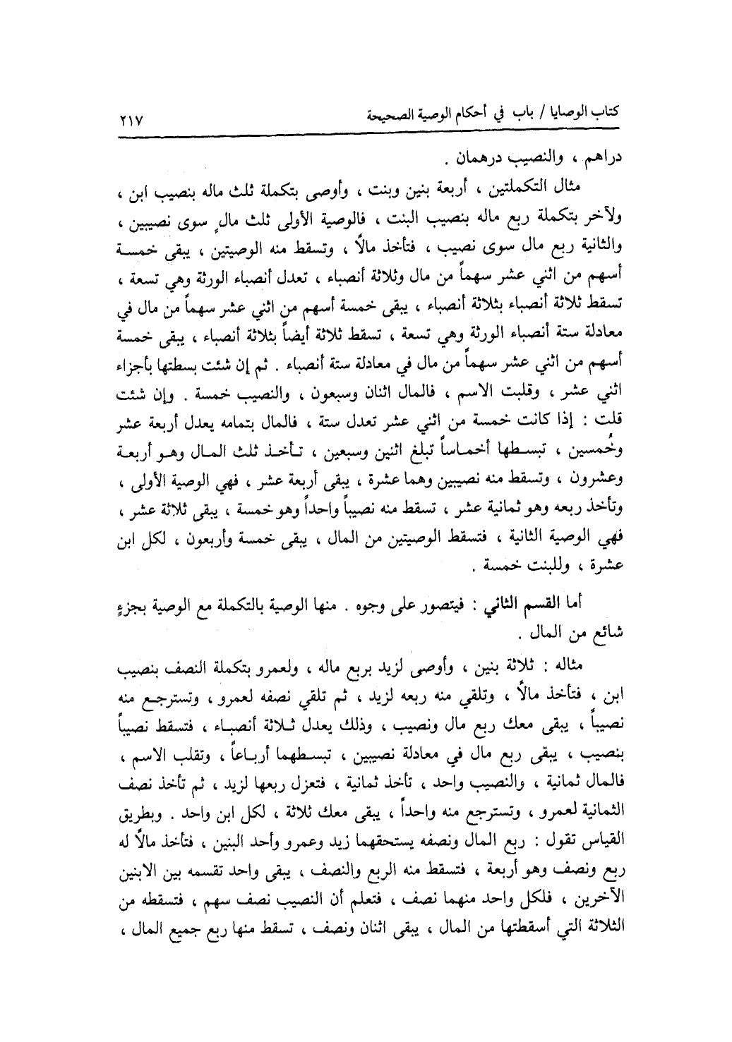 دراهم، والنصيب درهمان. مثال التكملتين، أربعة بنين وبنت، وأوصى بتكملة ثلث ماله بنصيب ابن، ولآخر بتكملة ربع ماله بنصيب البنت، فالوصية الاولى ثلث مال سوى نصيبين، والثانية ربع مال سوى نصيب، فتأخذ مالا، وتسقط منه الوصيتين، يبقى خمسة أسهم من اثني عشر سهما من مال وثلاثة أنصباء، تعدل أنصباء الورثة وهي تسعة، تسقط ثلاثة أنصباء بثلاثة أنصباء، يبقى خمسة أسهم من اثني عشر سهما من مال في معادلة ستة أنصباء الورثة وهي تسعة، تسقط ثلاثة أيضا بثلاثة أنصباء، يبقى خمسة أسهم من اثني عشر سهما من مال في معادلة ستة أنصباء. ثم إن شئت بسطتها بأجزاء اثني عشر، وقلبت الاسم، فالمال اثنان وسبعون، والنصيب خمسة. وإن شئت قلت: إذا كانت خمسة من اثني عشر تعدل ستة، فالمال بتمامه يعدل أربعة عشر وخمسين، تبسطها أخماسا تبلغ اثنين وسبعين، تأخذ ثلث المال وهو أربعة وعشرون، وتسقط منه نصيبين وهما عشرة، يبقى أربعة عشر، فهي الوصية الاولى، وتأخذ ربعه وهو ثمانية عشر، تسقط منه نصيبا واحدا وهو خمسة، يبقى ثلاثة عشر، فهي الوصية الثانية، فتسقط الوصيتين من المال، يبقى خمسة وأربعون، لكل ابن عشرة، وللبنت خمسة. أما القسم الثاني، فيتصور على وجوه. منها الوصية بالتكملة مع الوصية بجزء شائع من المال. مثاله: ثلاثة بنين، وأوصى لزيد بربع ماله، ولعمرو بتكملة النصف بنصيب ابن، فتأخذ مالا، وتلقي منه ربعه لزيد، ثم تلقي نصفه لعمرو، وتسترجع منه نصيبا، يبقى معك ربع مال ونصيب، وذلك يعدل ثلاثة أنصباء، فتسقط نصيبا بنصيب، يبقى ربع مال في معادلة نصيبين، تبسطهما أرباعا، وتقلب الاسم، فالمال ثمانية، والنصيب واحد، تأخذ ثمانية، فتعزل ربعها لزيد، ثم تأخذ نصف الثمانية لعمرو، وتسترجع منه واحدا، يبقى معك ثلاثة، لكل ابن واحد. وبطريق القياس تقول: ربع المال ونصفه يستحقهما زيد وعمرو وأحد البنين، فتأخذ مالا له ربع ونصف وهو أربعة، فتسقط منه الربع والنصف، يبقى واحد تقسمه بين الابنين الآخرين، فلكل واحد منهما نصف، فتعلم أن النصيب نصف سهم، فتسقطه من الثلاثة التي أسقطتها من المال، يبقى اثنان ونصف، تسقط منها ربع جميع المال،