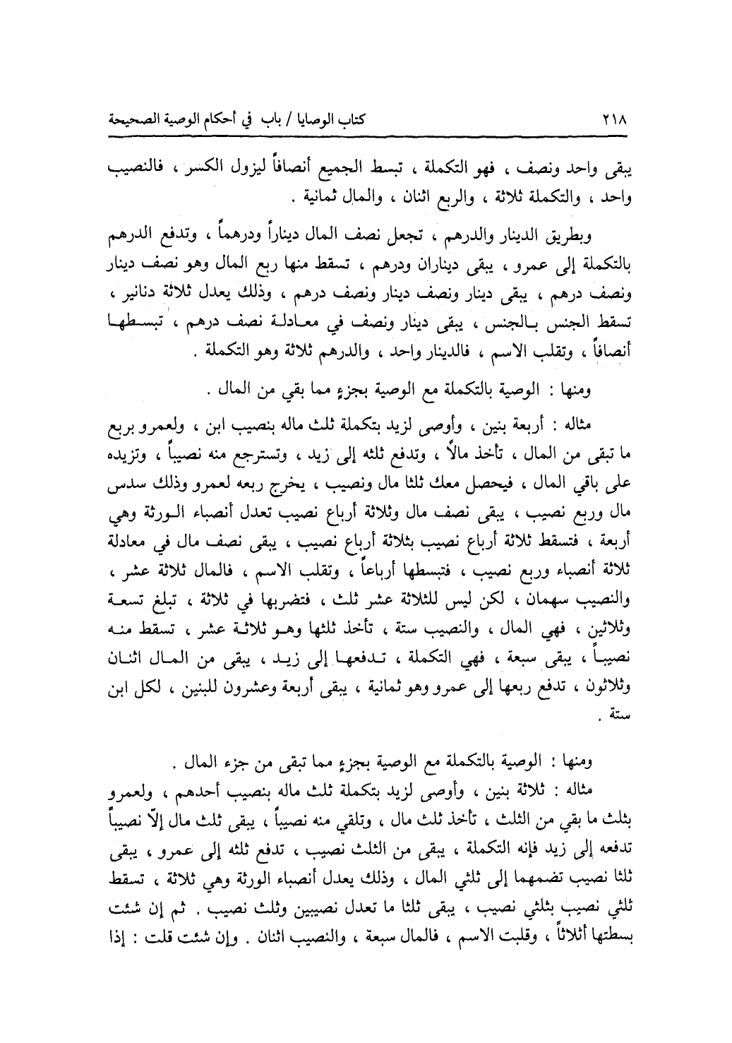 يبقى واحد ونصف، فهو التكملة، تبسط الجميع أنصافا ليزول الكسر، فالنصيب واحد، والتكملة ثلاثة، والربع اثنان، والمال ثمانية. وبطريق الدينار والدرهم، تجعل نصف المال دينارا ودرهما، وتدفع الدرهم بالتكملة إلى عمرو، يبقى ديناران ودرهم، تسقط منها ربع المال وهو نصف دينار ونصف درهم، يبقى دينار ونصف دينار ونصف درهم، وذلك يعدل ثلاثة دنانير، تسقط الجنس بالجنس، يبقى دينار ونصف في معادلة نصف درهم، تبسطها أنصافا، وتقلب الاسم، فالدينار واحد، والدرهم ثلاثة وهو التكملة. ومنها: الوصية بالتكملة مع الوصية بجزء مما بقي من المال. مثاله: أربعة بنين، وأوصى لزيد بتكملة ثلث ماله بنصيب ابن، ولعمرو بربع ما تبقى من المال، تأخذ مالا، وتدفع ثلثه إلى زيد، وتسترجع منه نصيبا، وتزيده على باقي المال، فيحصل معك ثلثا مال ونصيب، يخرج ربعه لعمرو وذلك سدس مال وربع نصيب، يبقى نصف مال وثلاثة أرباع نصيب تعدل أنصباء الورثة وهي أربعة، فتسقط ثلاثة أرباع نصيب بثلاثة أرباع نصيب، يبقى نصف مال في معادلة ثلاثة أنصباء وربع نصيب، فتبسطها أرباعا، وتقلب الاسم، فالمال ثلاثة عشر، والنصيب سهمان، لكن ليس للثلاثة عشر ثلث، فتضربها في ثلاثة، تبلغ تسعة وثلاثين، فهي المال، والنصيب ستة، تأخذ ثلثها وهو ثلاثة عشر، تسقط منه نصيبا، يبقى سبعة، فهي التكملة، تدفعها إلى زيد، يبقى من المال اثنان وثلاثون، تدفع ربعها إلى عمرو وهو ثمانية، يبقى أربعة وعشرون للبنين، لكل ابن ستة. ومنها: الوصية بالتكملة مع الوصية بجزء مما تبقى من جزء المال. مثاله: ثلاثة بنين، وأوصى لزيد بتكملة ثلث ماله بنصيب أحدهم، ولعمرو بثلث ما بقي من الثلث، تأخذ ثلث مال، وتلقي منه نصيبا، يبقى ثلث مال إلا نصيبا تدفعه إلى زيد فإنه التكملة، يبقى من الثلث نصيب، تدفع ثلثه إلى عمرو، يبقى ثلثا نصيب تضمهما إلى ثلثي المال، وذلك يعدل أنصباء الورثة وهي ثلاثة، تسقط ثلثي نصيب بثلثي نصيب، يبقى ثلثا مال تعدل نصيبين وثلث نصيب. ثم إن شئت بسطتها أثلاثا، وقلبت الاسم، فالمال سبعة، والنصيب اثنان. وإن شئت قلت: إذا