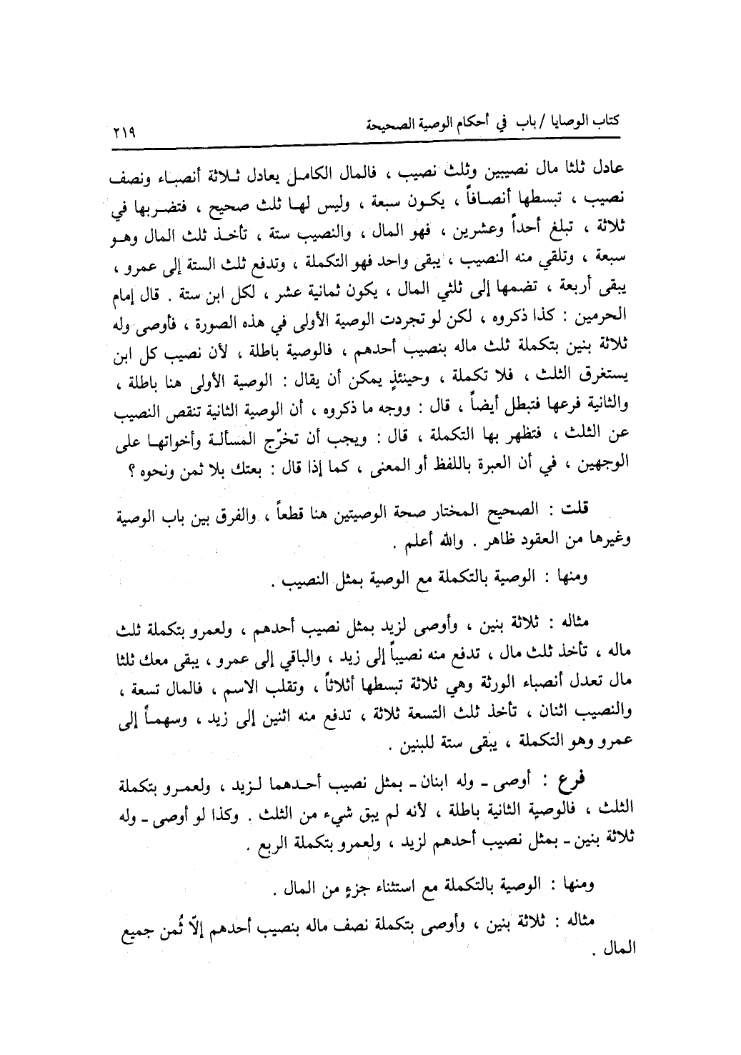 عادل ثلثا مال نصيبين وثلث نصيب، فالمال الكامل يعادل ثلاثة أنصباء ونصف نصيب، تبسطها أنصافا، يكون سبعة، وليس لها ثلث صحيح، فتضربها في ثلاثة، تبلغ أحدا وعشرين، فهو المال، والنصيب ستة، تأخذ ثلث المال وهو سبعة، وتلقي منه النصيب، يبقى واحد فهو التكملة، وتدفع ثلث الستة إلى عمرو، يبقى أربعة، تضمها إلى ثلثي المال، يكون ثمانية عشر، لكل ابن ستة. قال إمام الحرمين: كذا ذكروه، لكن لو تجردت الوصية الاولى في هذه الصورة، فأوصى وله ثلاثة بنين بتكملة ثلث ماله بنصيب أحدهم، فالوصية باطلة، لان نصيب كل ابن يستغرق الثلث، فلا تكملة، وحينئذ يمكن أن يقال: الوصية الاولى هنا باطلة، والثانية فرعها فتبطل أيضا، قال: ووجه ما ذكروه، أن الوصية الثانية تنقص النصيب عن الثلث، فتظهر بها التكملة، قال: ويجب أن تخرج المسألة وأخواتها على الوجهين، في أن العبرة باللفظ أو المعنى، كما إذا قال: بعتك بلا ثمن ونحوه ؟ قلت: الصحيح المختار صحة الوصيتين هنا قطعا، والفرق بين باب الوصية وغيرها من العقود ظاهر. والله أعلم. ومنها: الوصية بالتكملة مع الوصية بمثل النصيب. مثاله: ثلاثة بنين، وأوصى لزيد بمثل نصيب أحدهم، ولعمرو بتكملة ثلث ماله، تأخذ ثلث مال، تدفع منه نصيبا إلى زيد، والباقي إلى عمرو، يبقى معك ثلثا مال تعدل أنصباء الورثة وهي ثلاثة، تبسطها أثلاثا، وتقلب الاسم، فالمال تسعة، والنصيب اثنان، تأخذ ثلث التسعة ثلاثة، تدفع منه اثنين إلى زيد، وسهما إلى عمرو وهو التكملة، يبقى ستة للبنين. فرع أوصى - وله ابنان - بمثل نصيب أحدهما لزيد، ولعمرو بتكملة الثلث، فالوصية الثانية باطلة، لانه لم يبق شئ من الثلث. وكذا لو أوصى - وله ثلاثة بنين - بمثل نصيب أحدهم لزيد، ولعمرو بتكملة الربع. ومنها: الوصية بالتكملة مع استثناء جزء من المال. مثاله: ثلاثة بنين، وأوصى بتكملة نصف ماله بنصيب أحدهم إلا ثمن جميع المال.
