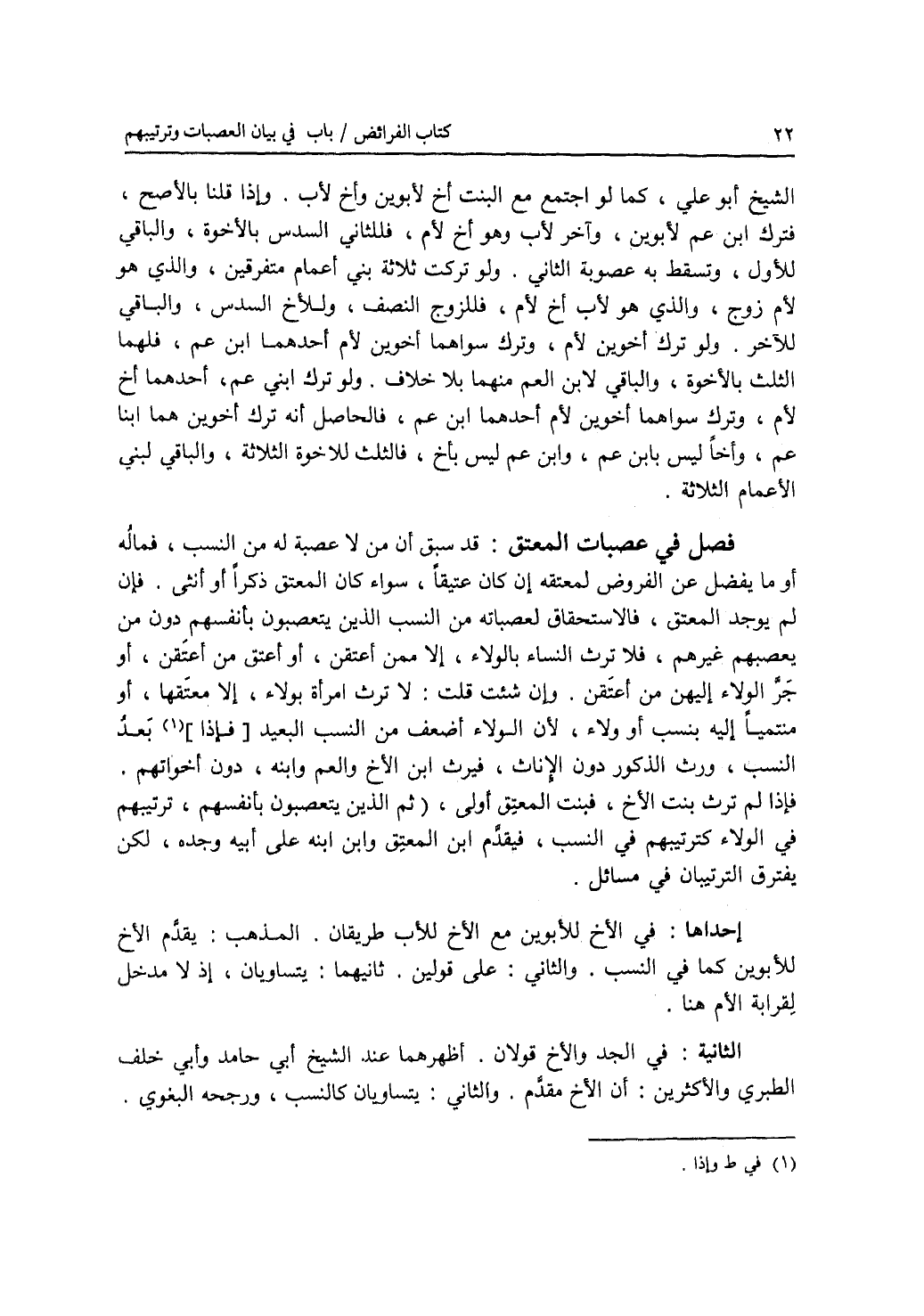 الشيخ أبو علي، كما لو اجتمع مع البنت أخ لابوين وأخ لاب. وإذا قلنا بالاصح، فترك ابن عم لابوين، وآخر لاب وهو أخ لام، فللثاني السدس بالاخوة، والباقي للاول، وتسقط به عصوبة الثاني. ولو تركت ثلاثة بني أعمام متفرقين، والذي هو لام زوج، والذي هو لاب أخ لام، فللزوج النصف، وللاخ السدس، والباقي للآخر. ولو ترك أخوين لا، وترك سواهما أخوين لام أحدهما ابن عم، فلهما الثلث بالاخوة، والباقي لابن العم منهما بلا خلاف. ولو ترك ابني عم، أحدهما أخ لام، وترك سواهما أخوين لام أحدهما ابن عم، فالحاصل أنه ترك أخوين هما ابنا عم، وأخا ليس بابن عم، وابن عم ليس بأخ، فالثلث للاخوة الثلاثة، والباقي لبني الاعمام الثلاثة.