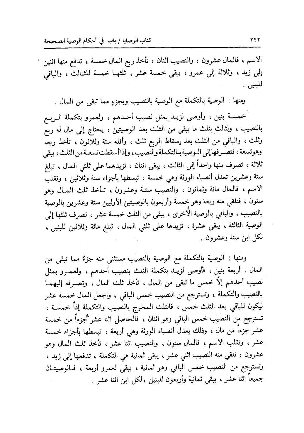 الاسم، فالمال عشرون، والنصيب اثنان، تأخذ ربع المال خمسة، تدفع منها اثنين إلى زيد، وثلاثة إلى عمرو، يبقى خمسة عشر، ثلثها خمسة للثالث، والباقي للبنين. ومنها: الوصية بالتكملة مع الوصية بالنصيب وبجزء مما تبقى من المال. خمسة بنين، وأوصى لزيد بمثل نصيب أحدهم، ولعمرو بتكملة الربع بالنصيب، ولثالث بثلث ما يبقى من الثلث بعد الوصيتين، يحتاج إلى مال له ربع وثلث، والباقي من الثلث بعد إسقاط الربع ثلث، وأقله ستة وثلاثون، تأخذ ربعه وهو تسعة، فتصرفها إلى الوصية بالتكملة والنصيب، وإذا أسقطت تسعة من الثلث، يبقى ثلاثة، تصرف منها واحدا إلى الثالث، يبقى اثنان، تزيدهما على ثلثي المال، تبلغ ستة وعشرين تعدل أنصباء الورثة وهي خمسة، تبسطها بأجزاء ستة وثلاثين، وتقلب الاسم، فالمال مائة وثمانون، والنصيب ستة وعشرون، تأخذ ثلث المال وهو ستون، فتلقي منه ربعه وهو خمسة وأربعون بالوصيتين الاوليين ستة وعشرين بالوصية بالنصيب، والباقي بالوصية الاخرى، يبقى من الثلث خمسة عشر، نصرف ثلثها إلى الوصية الثالثة، يبقى عشرة، تزيدها على ثلثي المال، تبلغ مائة وثلاثين للبنين، لكل ابن ستة وعشرون. ومنها: الوصية بالتكملة مع الوصية بالنصيب مستثنى منه جزء مما تبقى من المال. أربعة بنين، فأوصى لزيد بتكملة الثلث بنصيب أحدهم، ولعمرو بمثل نصيب أحدهم إلا خمس ما تبقى من المال، تأخذ ثلث المال، وتصرفه إليهما بالنصيب والتكملة، وتسترجع من النصيب خمس الباقي، واجعل المال خمسة عشر ليكون للباقي بعد الثلث خمس، فالثلث المخرج بالنصيب والتكملة إذا خمسة، تسترجع من النصيب خمس الباقي وهو اثنان، فالحاصل اثنا عشر جزءا من خمسة عشر جزءا من مال، وذلك يعدل أنصباء الورثة وهي أربعة، تبسطها بأجزاء خمسة عشر، وتقلب الاسم، فالمال ستون، والنصيب اثنا عشر، تأخذ ثلث المال وهو عشرون، تلقي منه النصيب اثني عشر، يبقى ثمانية هي التكملة، تدفعها إلى زيد، وتسترجع من النصيب خمس الباقي وهو ثمانية، يبقى لعمرو أربعة، فالوصيتان جميعا اثنا عشر، يبقى ثمانية وأربعون للبنين، لكل ابن اثنا عشر.