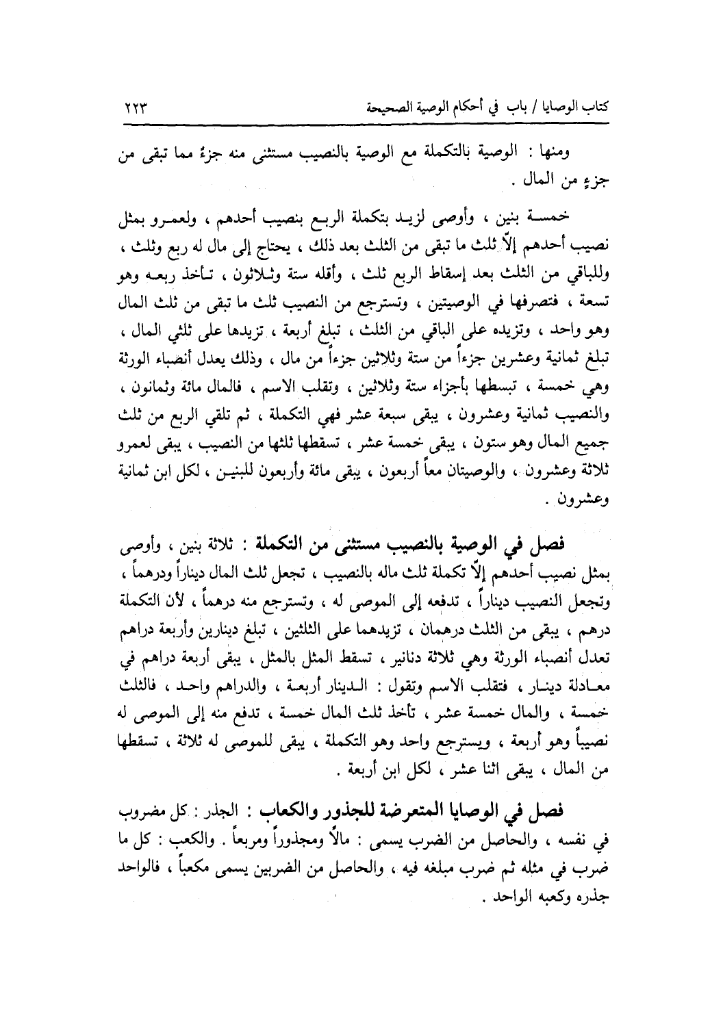 ومنها: الوصية بالتكملة مع الوصية بالنصيب مستثنى منه جزء مما تبقى من جزء من المال. خمسة بنين، وأوصى لزيد بتكملة الربع بنصيب أحدهم، ولعمرو بمثل نصيب أحدهم إلا ثلث ما تبقى من الثلث بعد ذلك، يحتاج إلى مال له ربع وثلث، وللباقي من الثلث بعد إسقاط الربع ثلث، وأقله ستة وثلاثون، تأخذ ربعه وهو تسعة، فتصرفها في الوصيتين، وتسترجع من النصيب ثلث ما تبقى من ثلث المال وهو واحد، وتزيده على الباقي من الثلث، تبلغ أربعة، تزيدها على ثلثي المال، تبلغ ثمانية وعشرين جزءا من ستة وثلاثين جزءا من مال، وذلك يعدل أنصباء الورثة وهي خمسة، تبسطها بأجزاء ستة وثلاثين، وتقلب الاسم، فالمال مائة وثمانون، والنصيب ثمانية وعشرون، يبقى سبعة عشر فهي التكملة، ثم تلقي الربع من ثلث جميع المال وهو ستون، يبقى خمسة عشر، تسقطها ثلثها من النصيب، يبقى لعمرو ثلاثة وعشرون، والوصيتان معا أربعون، يبقى مائة وأربعون للبنين، لكل ابن ثمانية وعشرون.