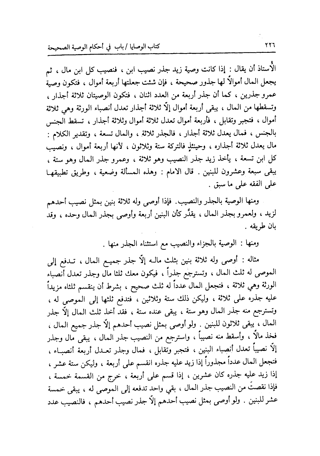الاستاذ أن يقال: إذا كانت وصية زيد جذر نصيب ابن، فنصيب كل ابن مال، ثم يجعل المال أموالا لها جذور صحيحة، فان شئت جعلتها أربعة أموال، فتكون وصية عمرو جذرين، كما أن جذر أربعة من العدد اثنان، فتكون الوصيتان ثلاثة أجذار، وتسقطها من المال، يبقى أربعة أموال إلا ثلاثة أجذار تعدل أنصجاء الورثة وهي ثلاثة أموال، فتجبر وتقابل، فأربعة أموال تعدل ثلاثة أموال وثلاثة أجذار، تسقط الجنس بالجنس، فمال يعدل ثلاثة أجذار، فالجذر ثلاثة، والمال تسعة، وتقدير الكلام: مال يعدل ثلاثة أجذاره، وحينئذ فالتركة ستة وثلاثون، لانها أربعة أموال، ونصيب كل ابن تسعة، يأخذ زيد جذر النصيب وهو ثلاثة، وعمرو جذر المال وهو ستة، يبقى سبعة وعشرون للبنين. قال الامام: وهذه المسألة وضعية، وطريق تطبيقها على الفقه على ما سبق. ومنها: الوصية بالجذر والنصيب. فإذا أوصى وله ثلاثة بنين بمثل نصيب أحدهم لزيد، ولعمرو بجذر المال، يقدر كأن البنين أربعة وأوصى بجذر المال وحده، وقد بان طريقه. ومنها: الوصية بالجزاء والنصيب مع استثناء الجذر منها. مثاله: أوصى وله ثلاثة بنين بثلث ماله إلا جذر جميع المال، تدفع إلى الموصى له ثلث المال، وتسترجع جذرا، فيكون معك ثلثا مال وجذر تعدل أنصباء الورثة وهي ثلاثة، فتجعل المال عددا له ثلث صحيح، بشرط أن ينقسم ثلثاه مزيدا عليه جذره على ثلاثة، وليكن ذلك ستة وثلاثين، فتدفع ثلثها إلى الموصى له، وتسترجع منه جذر المال وهو ستة، يبقى عنده ستة، فقد أخذ ثلث المال إلا جذر المال، يبقى ثلاثون للبنين. ولو أوصى بمثل نصيب أحدهم إلا جذر جميع المال، فخذ مالا، وأسقط منه نصيبا، واسترجع من النصيب جذر المال، يبقى مال وجذر إلا نصيبا تعدل أنصباء البنين، فتجبر وتقابل، فمال وجذر تعدل أربعة أنصباء، فتجعل المال عددا مجذورا إذا زيد عليه جذره انقسم على أربعة، وليكن ستة عشر، إذا زيد عليه جذره كان عشرين، إذا قسم على أربعة، خرج من القسمة خمسة، فإذا نقصت من النصيب جذر المال، بقي واحد تدفعه إلى الموصى له، يبقى خمسة عشر للبنين. ولو أوصى بمثل نصيب أحدهم إلا جذر نصيب أحدهم، فالنصيب عدد
