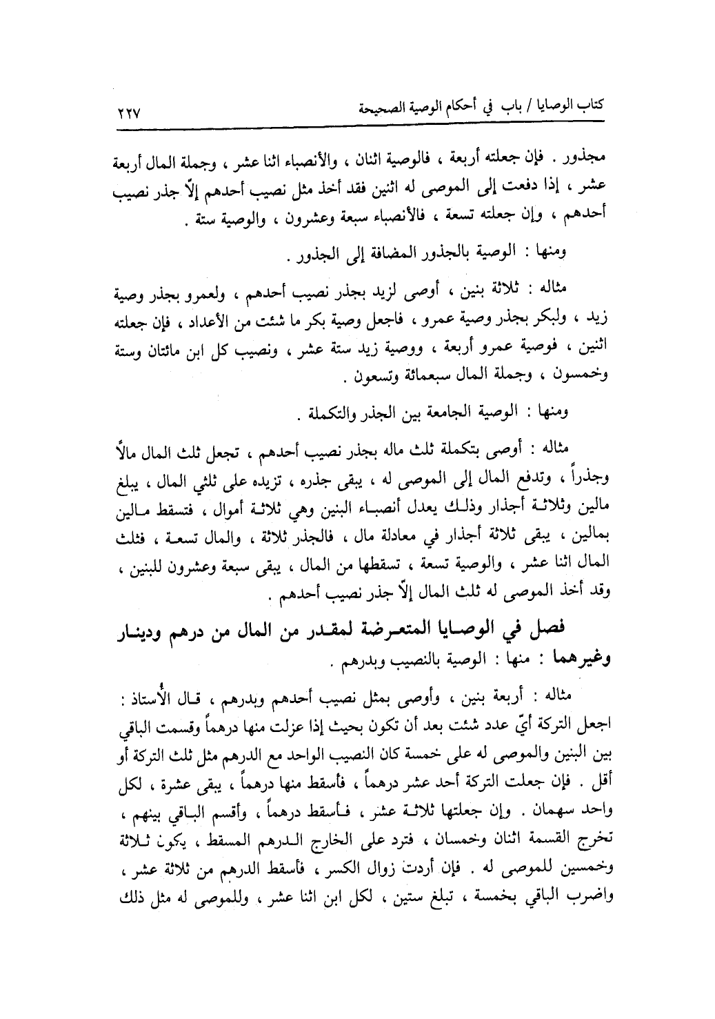 فصل في الوصايا المتعرضة لمقدر من المال من درهم ودينار وغيرهما منها: الوصية بالنصيب وبدرهم. مثاله: أربعة بنين، وأوصى بمثل نصيب أحدهم وبدرهم، وقال الاستاذ: اجعل التركة أي عدد شئت بعد أن تكون بحيث إذا عزلت منها درهما وقسمت الباقي بين البنين والموصى له على خمسة كان النصيب الواحد مع الدرهم مثل ثلث التركة أو أقل. فان جعلت التركة أحد عشر درهما، فأسقط منها درهما، يبقى عشرة، لكل واحد سهمان. وإن جعلتها ثلاثة عشر، فأسقط درهما، واقسم الباقي بينهم، تخرج القسمة اثنان وخمسان، فترد على الخارج الدرهم المسقط، يكون ثلاثة وخمسين للموصى له. فإن أردت زوال الكسر، فأسقط الدرهم من ثلاثة عشر، واضرب الباقي بخمسة، تبلغ ستين، لكل ابن اثنا عشر، وللموصى له مثل ذلك