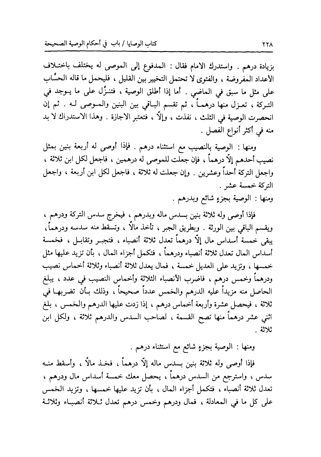 بزيادة درهم. واستدرك الامام فقال: المدفوع إلى الموصى له يختلف باختلاف الاعداد المفروضة، والفتوى لا تحتمل التخيير بين القليل، فليحمل ما قاله الحساب على مثل ما سبق في الماضي. أما إذا أطلق الوصية، فتنزل على ما يوجد في التركة، تعزل منها درهما، ثم تقسم الباقي بين البنين والموصى له. ثم إن انحصرت الوصية في الثلث، نفذت، وإلا، فتعتبر الاجازة. وهذا الاستدراك لا بد منه في أكثر أنواع الفصل. ومنها: الوصية بالنصيب مع استثناء درهم. فإذا أوصى وله أربعة بنين بمثل نصيب أحدهم إلا درهما، فإن جعلت للموصى له درهمين، فاجعل لكل ابن ثلاثة، واجعل التركة أحدا وعشرين. وإن جعلت له ثلاثة، فاجعل لكل ابن أربعة، واجعل التركة خمسة عشر. ومنها: الوصية بجزء شائع وبدرهم. فإذا أوصى وله ثلاثة بنين بسدس ماله وبدرهم، فيخرج سدس التركة ودرهم، ويقسم الباقي بين الورثة. وبطريق الجبر، تأخذ مالا، وتسقط منه سدسه ودرهما، يبقى خمسة أسداس مال إلا درهما تعدل ثلاثة أنصباء، فتجبر وتقابل، فخمسة أسداس المال تعدل ثلاثة أنصباء ودرهما، فتكمل أجزاء المال، بأن تزيد عليها مثل خمسها، وتزيد على العديل خمسة، فمال يعدل ثلاثة أنصباء وثلاثة أخماس نصيب ودرهما وخمس درهم، فاضرب الانصباء الثلاثة وأخماس النصيب في عدد، يبلغ الحاصل منه مزيدا عليه الدرهم والخمس عددا صحيحا، وذلك بأن تضربها في ثلاثة، فيحصل عشرة دراهم وأربعة أخماس درهم، حذا زدت عليها الدرهم والخمس، بلغ اثني عشر درهما منها تصح القسمة، لصاحب السدس والدرهم ثلاثة، ولكل ابن ثلاثة. ومنها: الوصية بجزء شائع مع استثناء درهم. فإذا أوصى وله ثلاثة بنين بسدس ماله إلا درهما، فخذ مالا، وأسقط منه سدسه، واسترجع من السدس درهما، يحصل معك خمسة أسداس مال ودرهم، تعدل ثلاثة أنصباء، فتكمل أجزاء المال، بأن تزيد عليها خمسها، وتزيد الخمس على كل ما في المعادلة، فمال ودرهم وخمس درهم تعدل ثلاثة أنصباء وثلاثة