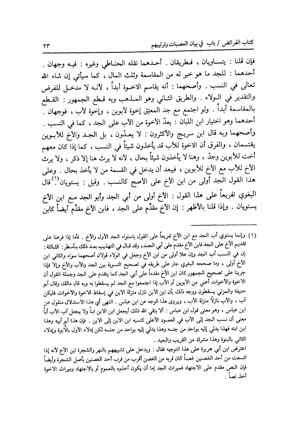 فإن قلنا: يتساويان، فطريقان. أحدهما نقله الحناطي وغيره: فيه وجهان. أحدهما: للجد ما هو خير له من المقاسمة وثلث المال، كما سيأتي إن شاء الله تعالى في النسب. وأصحهما: أنه يقاسم الاخوة أبدا، لانه لا مدخل للفرض والتقدير في الولاء. والطريق الثاني وهو المذهب وبه قطع الجمهور: القطع بالمقاسمة أبدا. ولو اجتمع مع جد المعتق إخوة لابوين، وإخوة لاب، فوجهان. أحدهما وهو اختيار ابن اللبان: يعد الاخوة من الاب على الجد، كما في النسب. وأصحهما وبه قال ابن سريج والاكثرون: لا يعدون، بل الجد والاخ للابوين يقتسمان، والفرق أن الاخوة للابقد يأخذون شيئا في النسب، كما إذا كان معهم أخت للابوين وجد، وهنا لا يأخذون شيئا بحال، لانه لا يرث هنا إلا ذكر، ولا يرث الاخ للاب مع الاخ للابوين، فيبعد أن يدخل في القسمة من لا يأخذ بحال. وعلى هذا القول الجد أولى من ابن الاخ على الاصح كالنسب. وقيل: يستويان. قال البغوي تفريعا على هذا القول: الاخ أولى من أبي الجد، وأبو الجد مع ابن الاخ يستويان. وإذا قلنا بالاظهر: إن الاخ مقدم على الجد، فابن الاخ مقدم أيضا كابن