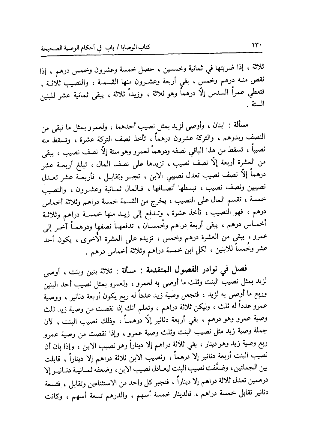 ثلاثة، إذا ضربتها في ثمانية وخمسين، حصل خمسة وعشرون وخمس درهم، إذا نقص منه درهم وخمس، بقي أربعة وعشرون منها القسمة، والنصيب ثلاثة، فتعطي عمرا السدس إلا درهما وهو ثلاثة، وزيدا ثلاثة، يبقى ثمانية عشر للبنين الستة. مسألة: ابنان، وأوصى لزيد بمثل نصيب أحدهما، ولعمرو بمل ما تبقى من النصف وبدرهم، والتركة عشرون درهما، تأخذ نصف التركة عشرة، وتسقط منه نصيبا، تسقط من هذا الباقي نصفه ودرهما لعمرو وهو ستة إلا نصف نصيب، يبقى من العشرة أربعة إلا نصف نصيب، تزيدها على نصف المال، تبلغ أربعة عشر درهما إلا نصف نصيب تعدل نصيبي الابن، تجبر وتقابل، فأربعة عشر تعدل نصيبين ونصف نصيب، تبسطها أنصافا، فالمال ثمانية وعشرون، والنصيب خمسة، تقسم المال على النصيب، يخرج من القسمة خمسة دراهم وثلاثة أخماس درهم، فهو النصيب، تأخذ عشرة، وتدفع إلى زيد منها خمسة دراهم وثلاثة أخماس درهم، يبقى أربعة دراهم وخمسان، تدفعها نصفها ودرهما آخر إلى عمرو، يبقى من العشرة درهم وخمس، تزيده على العشرة الاخرى، يكون أحد عشر وخمسا للابنين، لكل ابن خمسة دراهم وثلاثة أخماس درهم.