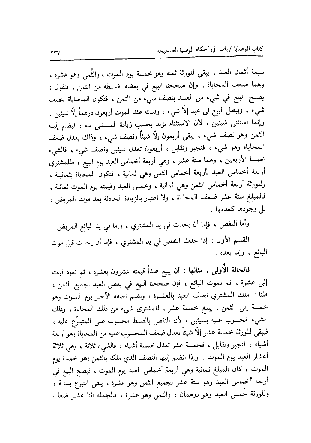 سبعة أثمان العبد، يبقى للورثة ثمنه وهو خمسة يوم الموت، والثمن وهو عشرة، وهما ضعف المحاباة. وإن صححنا البيع في بعضه بقسطه من الثمن، فنقول: يصح البيع في شئ من العبد بنصف شئ من الثمن، فتكون المحاباة بنصف شئ، ويبطل البيع في عبد إلا شئ، وقيمته عند الموت أربعون درهما إلا شيئين. وإنما استثنى شيئين، لان الاستثناء يزيد بحسب زيادة المستثنى منه، فيضم إليه الثمن وهو نصف شئ، يبقى أربعون إلا شيئا ونصف شئ، وذلك يعدل ضعف المحاباة وهو شئ، فتجبر وتقابل، أربعون تعدل شيئين ونصف شئ، فالشئ خمسا الاربعين، وهما ستة عشر، وهي أربعة أخماس العبد يوم البيع، فللمشتري أربعة أخماس العبد بأربعة أخماس الثمن وهي ثمانية، فتكون المحاباة بثمانية، وللورثة أربعة أخماس الثمن وهي ثمانية، وخمس العبد وقيمته يوم الموت ثمانية، فالمبلغ ستة عشر ضعف المحاباة، ولا اعتبار بالزيادة الحادثة بعد موت المرى ض، بل وجودها كعدمها. وأما النقص، فإما أن يحدث في يد المشتري، وإما في يد البائع المريض. القسم الاول: إذا حدث النقص في يد المشتري، فإما أن يحدث قبل موت البائع، وإما بعده. فالحالة الاولى: مثالها: أن يبيع عبدا قيمته عشرون بعشرة، ثم تعود قيمته إلى عشرة، ثم يموت البائع، فإن صححنا البيع في بعض العبد بجميع الثمن، قلنا: ملك المشتري نصف العبد بالعشرة، ونضم نصفه الآخر يوم الموت وهو خمسة إلى الثمن، يبلغ خمسة عشر، للمشتري شئ من ذلك المحاباة، وذلك الشئ محسوب عليه بشيئين، لان النقص بالقسط محسوب على المتبرع عليه، فيبقى للورثة خمسة عشر إلا شيئا يعدل ضعف المحسوب عليه من المحاباة وهو أربعة أشياء، فتجبر وتقابل، فخمسة عشر تعدل خمسة أشياء، فالشئ ثلاثة، وهي ثلاثة أعشار العبد يوم الموت. وإذا انضم إليها النصف الذي ملكه بالثمن وهو خمسة يوم الموت، كان المبلغ ثمانية وهي أربعة أخماس العبد يوم الموت، فيصح البيع في أربعة أخماس العبد وهو ستة عشر بجميع الثمن وهو عشرة، يبقى التبرع بستة، وللورثة خمس العبد وهو درهمان، والثمن وهو عشرة، فالجملة اثنا عشر ضعف