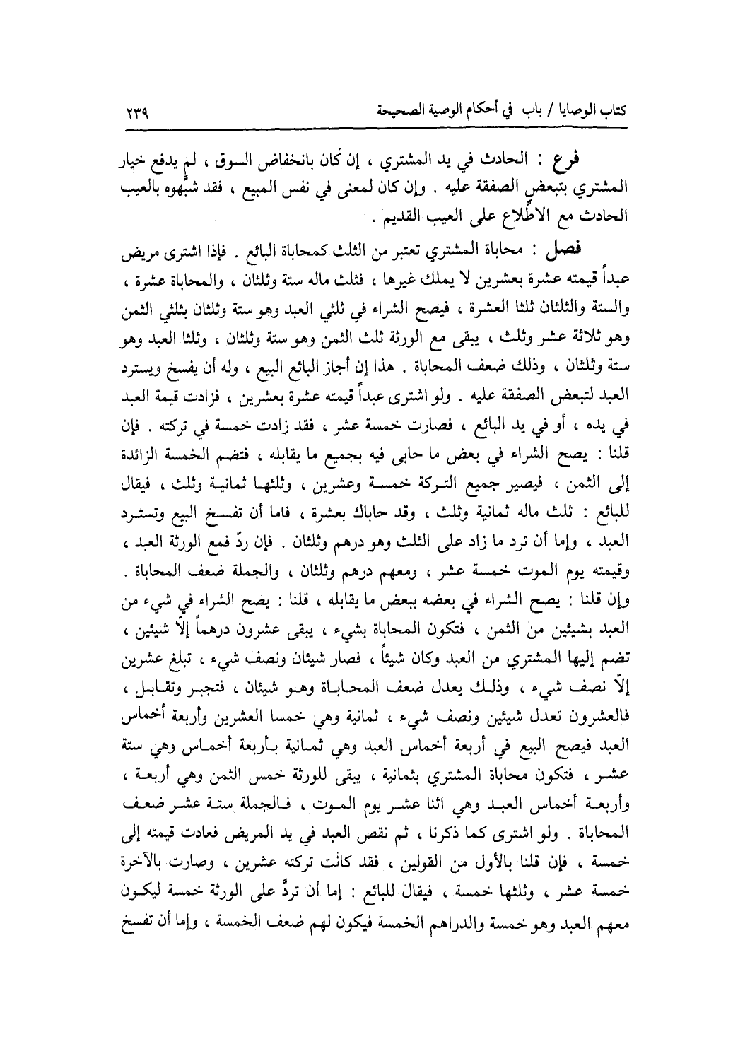 فصل محاباة المشتري تعتبر من الثلث كمحاباة البائع. فإذا اشترى مريض عبدا قيمته عشرة بعشرين لا يملك غيره، فثلث ماله ستة وثلثان، والمحاباة عشرة، والستة والثلثان ثلثا العشرة، فيصح الشراء في ثلثي العبد وهو ستة وثلثان بثلثي الثمن وهو ثلاثة عشر وثلث، يبقى مع الورثة ثلث الثمن وهو ستة وثلثان، وثلثا العبد وهو ستة وثلثان، وذلك ضعف المحاباة. هذا إن أجاز البائع البيع، وله أن يفسخ ويسترد العبد لتبعض الصفقة عليه. ولو اشترى عبدا قيمته عشرة بعشرين، فزادت قيمة العبد في يده، أو في يد البائع، فصارت خمسة عشر، فقد زادت خمسة في تركته. فإن قلنا: يصح الشراء فبعض ما حابى فيه بجميع ما يقابله، فتضم الخمسة الزائدة إلى الثمن، فيصير جميع التركة خمسة وعشرين، وثلثها ثمانية وثلث، فيقال للبائع: ثلث ماله ثمانية وثلث، وقد حاباك بعشرة، فإما أن تفسخ البيع وتسترد العبد، وإما أن ترد ما زاد على الثلث وهو درهم وثلثان. فإن رد، فمع الورثة العبد، وقيمته يوم الموت خمسة عشر، ومعهم درهم وثلثان، والجملة ضعف المحاباة. وإن قلنا: يصح الشراء في بعضه ببعض ما يقابله، قلنا: يصح الشراء في شئ من العبد بشيئين من الثمن، فتكون المحاباة بشئ، يبقى عشرون درهما إلا شيئين، تضم إليها المشترى من العبد وكان شيئا، فصار شيئان ونصف شئ، تبلغ عشرين إلا نصف شئ، وذلك يعدل ضعف المحاباة وهو شيئان، فتجبر وتقابل، فالعشرون تعدل شيئين ونصف شئ، فالشئ ثمانية وهي خمسا العشرين وأربعة أخماس العبد، فيصح البيع في أربعة أخماس العبد وهي ثمانية بأربعة أخماس وهي ستة عشر، فتكون محاباة المشتري بثمانية، يبقى للورثة خمس الثمن وهي أربعة، وأربعة أخماس العبد وهي اثنا عشر يوم الموت، فالجملة ستة عشر ضعف المحاباة. ولو اشترى كما ذكرنا، ثم نقص العبد في يد المريض فعادت قيمته إلى خمسة، فإن قلنا بالاول من القولين، فقد كانت تركته عشرين، وصارت بالآخرة خمسة عشر، وثلثها خمسة، فيقال للبائع: إما أن ترد على الورثة خمسة ليكون معهم العبد وهو خمسة والدراهم الخمسة فيكون لهم ضعف الخمسة، وإما أن تفسخ