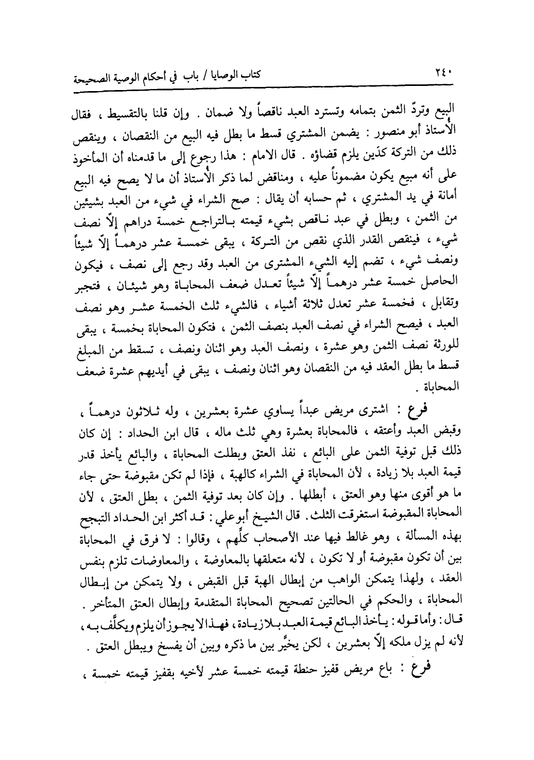 البيع وترد الثمن بتمامه وتسترد العبد ناقصا ولا ضمان. وإن قلنا بالتقسيط، فقال الاستاذ أبو منصور: يضمن المشتري قسط ما بطل فيه البيع من النقصان، وينقص ذلك من التركة كدين يلزم قضاؤه. قال الامام: هذا رجوع إلى ما قدمناه أن المأخوذ على أنه مبيع يكون مضمونا عليه، ومناقض لما ذكر الاستاذ أن مالا يصح فيه البيع أمانة في يد المشتري، ثم حسابه أن يقال: صح الشراء في شئ من العبد بشيئين من الثمن، وبطل في عبد ناقص بشئ قيمته بالتراجع خمسة دراهم إلا نصف شئ، فينقص القدر الذي نقص من التركة، يبقى خمسة عشر درهما إلا شيئا ونصف شئ، تضم إليه الشئ المشترى من العبد وقد رجع إلى نصف، فيكون الحاصخمسة عشر درهما إلا شيئا تعدل ضعف المحاباة وهو شيئان، فتجبر وتقابل، فخمس عشر تعدل ثلاثة أشياء، فالشئ ثلث الخمسة عشر وهو نصف العبد، فيصح الشراء فنصف العبد بنصف الثمن، فتكون المحاباة بخمسة، يبقى للورثة نصف الثمن وهو عشرة، ونصف العبد وهو اثنان ونصف، تسقط من المبلغ قسط ما بطل العقد فيه من النقصان وهو اثنان ونصف، يبقى في أيديهم عشرة ضعف المحاباة. فرع اشترى مريض عبدا يساوي عشرة بعشرين، وله ثلاثون درهما، وقبض العبد وأعتقه، فالمحاباة بعشرة وهي ثلث ماله، قال ابن الحداد: إن كان ذلك قبل توفية الثمن على البائع، نفذ العتق وبطلت المحاباة، والبائع يأخذ قدر قيمة العبد بلا زيادة، لان المحاباة في الشراء كالهبة، فإذا لم تكن مقبوضة حتى جاء ما هو أقوى منها وهو العتق، أبطلها. وإن كان بعد توفية الثمن، بطل العتق، لان المحاباة المقبوضة استغرقت الثلث. قال الشيخ أبو علي: قد أكثر ابن الحداد التبجح بهذه المسألة، وهو غالظ فيها عند الاصحاب كلهم، وقالوا: لا فرق في المحاباة بين أن تكون مقبوضة أو لا تكون، لانها متعلقها بالمعاوضة، والمعاوضات تلزم بنفس العقد، ولهذا يتمكن الواهب من إبطال الهبة قبل القبض، ولا يتمكن من إبطال المحاباة، والحكم في الحالتين تصحيح المحاباة المتقدمة وإبطال العتق المتأخر. قال: وأما قوله: يأخذ البائع قيمة العبد بلا زيادة، فهذا لا يجوز أن يلزم ويكلف به، لانه لم يزل ملكه إلا بعشرين، لكن يخير بين ما ذكره وبين أن يفسخ البيع ويبطل العتق. فرع باع مريض قفيز حنطة قيمته خمسة عشر لاخيه يقفيز قيمته خمسة،