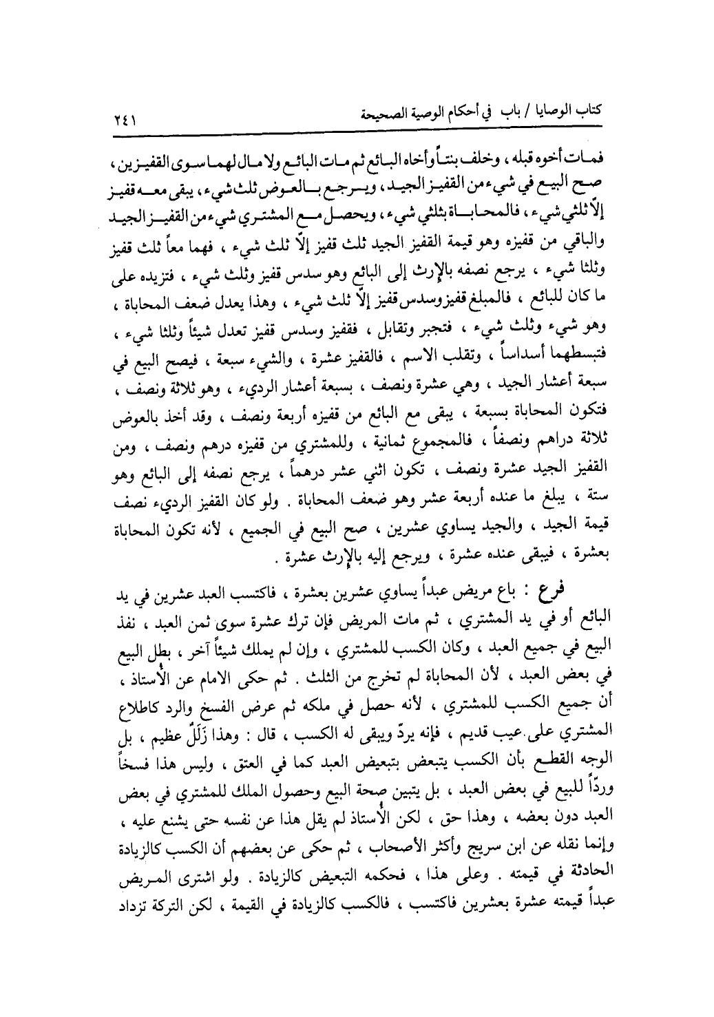 فمات أخوه قبله، وخلف بنتا وأخاه البائع، ثم مات البائع ولا مال لهما سوى القفيزين، صح البيع في شئ من القفيز الجيد، ويرجع بالعوض ثلث شئ، يبقى معه قفيز ثلثي شئ، فالمحاباة بثلثي شئ، ويحصل مع المشتري شئ من القفيز الجيد، والباقي من قفيزه وهو قيمة القفيز الجيد ثلث قفيز إلا ثلث شئ، فهما معا ثلث قفيز وثلثا شئ، يرجع نصفه بالارث إلى البائع وهو سدس قفيز وثلث شئ، فتزيده على ما كان للبائع، فالمبلغ قفيز وسدس قفيز إلا ثلث شئ، وهذا يعدل ضعف المحاباة، وهو شئ وثلث شئ، فتجبر وتقابل، فقفيز وسدس قفيز تعدل شيئا وثلثا شئ، فتبسطهما أسداسا، وتقلب الاسم، فالقفيز عشرة، والشئ سبعة، فيصح البيع في سبعة أعشار الجيد، وهي عشرة ونصف، بسبعة أعشار الردئ، وهو ثلاثة ونصف، فتكون المحاباة بسبعة، يبقى مع البائع من قفيزه أربعة ونصف، وقد أخذ بالعوض ثلاثة دراهم ونصفا، فالمجموع ثمانية، وللمشتري من قفيزه درهم ونصف، ومن القفيز الجيد عشرة ونصف، تكون اثني عشر درهما، يرجع نصفه إلى البائع وهو ستة، يبلغ ما عنده أربعة عشر وهو ضعف المحاباة. ولو كان القفيز الردئ نصف قيمة الجيد، والجيد يساوي عشرين، صح البيع في الجميع، لانه تكون المحاباة بعشرة، فيبقى عنده عشرة، ويرجع إليه بالارث عشرة. فرع باع مريض عبدا يساوي عشرين بعشرة، فاكتسب العبد عشرين في يد البائع أو في يد المشتري، ثم مات المريض، فإن ترك عشرة سوى ثمن العبد، نفذ البيع في جميع العبد، وكان الكسب للمشتري، وإن لم يملك شيئا آخر، بطل البيع في بعض العبد، لان المحاباة لم تخرج من الثلث. ثم حكى الامام عن الاستاذ، أن جميع الكسب للمشتري، لانه حصل في ملكه ثم عرض الفسخ والرد كاطلاع المشتري على عيب قديم، فإنه يرد ويبقى له الكسب، قال: وهذا زلل عظيم، بل الوجه القطع بأن الكسب يتبعض بتبعض العبد كما في العتق، وليس هذا فسخا وردا للبيع في بعض العبد، بل يتبين صحة البيع وحصول الملك للمشتري في بعض العبد دون بعضه، وهذا حق، لكن الاستاذ لم يقل هذا عن نفسه حتى يشنع عليه، وإنما نقله عن ابن سريج وأكثر الاصحاب، ثم حكى عن بعضهم أن الكسب كالزيادة الحادثة في قيمته. وعلى هذا، فحكمه التبعيض كالزيادة. ولو اشترى المريض عبدا قيمته عشرة بعشرين (فاكتسب)، فالكسب كالزيادة في القيمة، لكن التركة تزداد