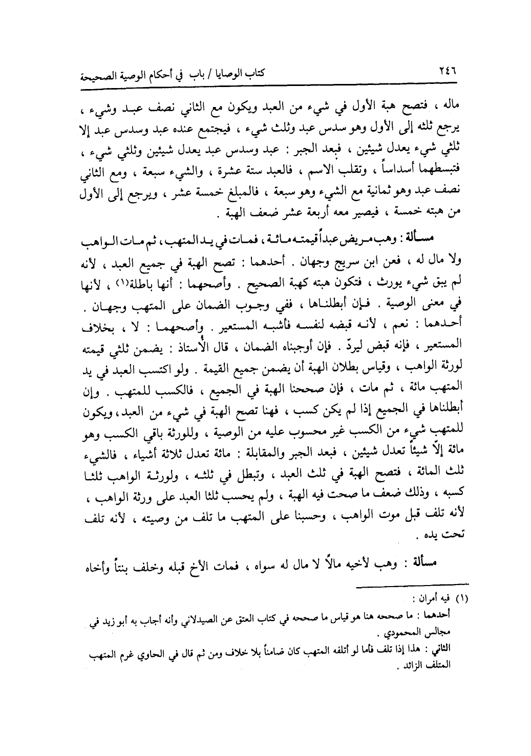 ماله، فتصح هبة الاول في شئ من العبد ويكون مع الثاني نصف عبد وشئ، يرجع ثلثه إلى الاول وهو سدس عبد وثلث شئ، فيجتمع عنده عبد وسدس عبد إلا ثلثي شئ يعدل شيئين، فبعد الجبر: عبد وسدس عبد يعدل شيئين وثلثي شئ، فتبسطهما أسداسا، وتقلب الاسم، فالعبد ستة عشر، والشئ سبعة، ومع الثاني نصف عبد وهو ثمانية مع الشئ وهو سبعة، فالمبلغ خمسة عشر، ويرجع إلى الاول من هبته خمسة، فيصير معه أربعة عشر ضعف الهبة. مسألة: وهب مريض عبدا قيمته مائة، فمات في يد المتهب، ثم مات الواهب ولا مال له، فعن ابن سريج وجهان. أحدهما: تصح الهبة في جميع العبد، لانه لم يبق شئ يورث، فتكون هبته كهبة الصحيح. وأصحهما: أنها باطلة، لانها في معنى الوصية. فإن أبطلناها، ففي وجوب الضمان على المتهب وجهان. أحدهما: نعم، لانه قبضه لنفسه فأشبه المستعير. وأصحهما: لا، بخلاف المستعير، فإنه قبض ليرد. فإن أوجبنا الضمان، قال الاستاذ: يضمن ثلثي قيمته لورثة الواهب، وقياس بطلان الهبة أن يضمن جميع القيمة. ولو اكتسب العبد في يد المتهب مائة، ثم مات، فإن صححنا الهبة في الجميع، فالكسب للمتهب. وإن أبطلناها في الجميع إذا لم يكن كسب، فهنا تصح الهبة في شئ من العبد، ويكون للمتهب شئ من الكسب غير محسوب عليه من الوصية، وللورثة باقي الكسب وهو مائة إلا شيئا تعدل شيئين، فبعد الجبر والمقابلة: مائة تعدل ثلاثة أشياء، فالشئ ثلث المائة، فتصح الهبة في ثلث العبد، وتبطل في ثلثه، ولورثة الواهب ثلثا كسبه، وذلك ضعف ما صحت فيه الهبة، ولم يحسب ثلثا العبد على ورثة الواهب، لانه تلف قبل موت الواهب، وحسبنا على المتهب ما تلف من وصيته، لانه تلف تحت يده. مسألة: وهب لاخيه مالا لا مال له سواه، فمات الاخ قبله وخلف بنتا وأخاه