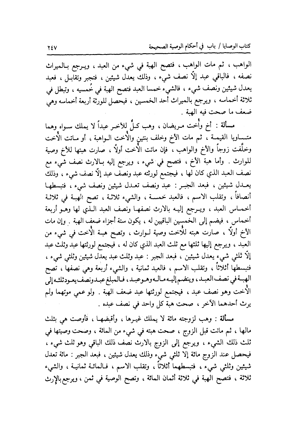 الواهب، ثم مات الواهب، فتصح الهبة في شئ من العبد، ويرجع بالميراث نصفه، فالباقي عبد إلا نصف شئ، وذلك يعدل شيئين، فتجبر وتقابل، فعبد يعدل شيئين ونصف شئ، فالشئ خمسا العبد، فتصح الهبة في خمسيه، وتبطل في ثلاثة أخماسه، ويرجع بالميراث أحد الخمسين، فيحصل للورثة أربعة أخماسه وهي ضعف ما صحت فيه الهبة. مسألة: أخ وأخت مريضان، وهب كل للآخر عبدا لا يملك سواه وهما متساويا القيمة، ثم مات الاخ وخلف بنتين والاخت الواهبة، أو ماتت الاخت وخلفت زوجا والاخ الواهب، فإن ماتت الاخت أولا، صارت هبتها للاخ وصية للوارث. وأما هبة الاخ، فتصح في شئ، ويرجع إليه بالارث نصف شئ مع نصف العبد الذي كان لها، فيجتمع لورثته عبد ونصف عبد إلا نصف شئ، وذلك يعدل شيئين، فبعد الجبر: عبد ونصف عبد تعدل شيئين ونصف شئ، فتبسطها أنصافا، وتقلب الاسم، فالعبد خمسة، والشئ ثلاثة، تصح الهبة في ثلاثة أخماس العبد، ويرجع إليه بالارث نصفها ونصف العبد الذي لها وهو أربعة أخماس، فيضم إلى الخمسين الباقيين له، يكون ستة أجزاء ضعف الهبة. وإن مات الاخ أولا، صارت هبته للاخت وصية لوارث، وتصح هبة الاخت في شئ من العبد، ويرجع إليها ثلثها مع ثلث العبد الذي كان له، فيجتمع لورثتها عبد وثلث عبد إلا ثلثي شئ يعدل شيئين، فبعد الجبر: عبد وثلث عبد يعدل شيئين وثلثي شئ، فتبسطها أثلاثا، وتقلب الاسم، فالعبد ثمانية، والشي أربعة وهي نصفها، تصح الهبة في نصف العبد، وينضم إليه ماله وهو عبد، فالمبلغ عبد ونصف يعود ثلثه إلى الاخت وهو نصف عبد، فيجتمع لورثتها عبد ضعف الهبة. ولو عمي موتهما ولم يرث أحدهما الآخر، صحت هبة كل واحد في نصف عبده. مسألة: وهب لزوجته مائة لا يملك غيرها، وأقبضها، فأوصت هي بثلث مالها، ثم ماتت قبل الزوج، صحت هبته في شئ من المائة، وصحت وصيتها في ثلث ذلك الشئ، ويرجع إلى الزوج بالارث نصف ذلك الباقي وهو ثلث شئ، فيحصل عند الزوج مائة إلا ثلثي شئ وذلك يعدل شيئين، فبعد الجبر: مائة تعدل شيئين وثلثي شئ، فتبسطهما أثلاثا، وتقلب الاسم، فالمائة ثمانية، والشئ ثلاثة، فتصح الهبة في ثلاثة أثمان المائة، وتصح الوصية في ثمن، ويرجع بالارث