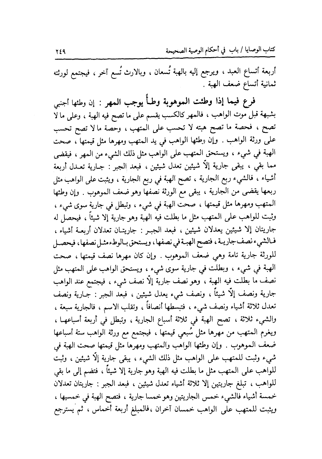 أربعة أتساع العبد، ويرجع إليه بالهبة تسعان، وبالارث تسع آخر، فيجتمع لورثته ثمانية أتساع ضعف الهبة. فرع فيما إذا وطئت الموهوبة وطئا يوجب المهر إن وطئها أجنبي بشبهة قبل موت الواهب، فالمهر كالكسب يقسم علما تصح فيه الهبة، وعلى ما لا تصح، فحصة ما تصح هبته لا تحسب على المتهب، وحصة ما لا تصح تحسب على ورثة الواهب. وإن وطئها الواهب في يد المتهب ومهرها مثل قيمتها، صحت الهبة في شئ، ويستحق المتهب على الواهب مثل ذلك الشئ من المهر، فيقضى مما بقي، يبقى جارية إلا شيئين تعدل شيئين، فبعد الجبر: جارية تعدل أربعة أشياء، فالشئ ربع الجارية، تصح الهبة في ربع الجارية، ويثبت على الواهب مثل ربعها يقضى من الجارية، يبقى مع الورثة نصفها وهو ضعف الموهوب. وإن وطئها المتهب ومهرها مثل قيمتها، صحت الهبة في شئ، وتبطل في جارية سوى شئ، وثبت للواهب على المتهب مثل ما بطلت فيه الهبة وهو جارية إلا شيئا، فيحصل له جاريتان إلا شيئين يعدلان شيئين، فبعد الجبر: جاريتان تعدلان أربعة أشياء، فالشئ نصف جارية، فتصح الهبة في نصفها، ويستحق بالوطئ مثل نصفها، فيحصل للورثة جارية تامة وهي ضعف الموهوب. وإن كان مهرها نصف قيمتها، صحت الهبة في شئ، وبطلت في جارية سوى شئ، ويستحق الواهب على المتهب مثل نصف ما بطلت فيه الهبة، وهو نصف جارية إلا نصف شئ فيجتمع عند الواهب جارية ونصف إشيئا، ونصف شئ يعدل شيئين، فبعد الجبر: جارية ونصف تعدل ثلاثة أشياء ونصف شئ، فتبسطها أنصافا، وتقلب الاسم، فالجارية سبعة، والشئ ثلاثة، تصح الهبة في ثلاثة أسباع الجارية، وتبطل في أربعة أسباعها، ويغرم المتهب من مهرها مثل سبع قيمتها، فيجتمع مع ورثة الواهب ستة أسباعها ضعف الموهوب. وإن وطئها الواهب والمتهب ومهرها مثل قيم تها، صحت الهبة في شئ وثبت للمتهب على الواهب مثل ذلك الشئ، يبقى جارية إلا شيئين، وثبت للواهب على المتهب مثل ما بطلت في الهبة وهو جارية إلا شيئا، فتضم إلى ما بقي للواهب، تبلغ جاريتين إلا ثلاثة أشياء تعدل شيئين، فبعد الجبر: جاريتان تعدلان خمسة أشياء، فالشئ خمس الجاريتين وهو خمسا جارية، فتصح الهبة في خمسيها، ويثبت للمتهب على الواهب خمسان آخران، فالمبلغ أربعة أخماس، ثم يسترجع
