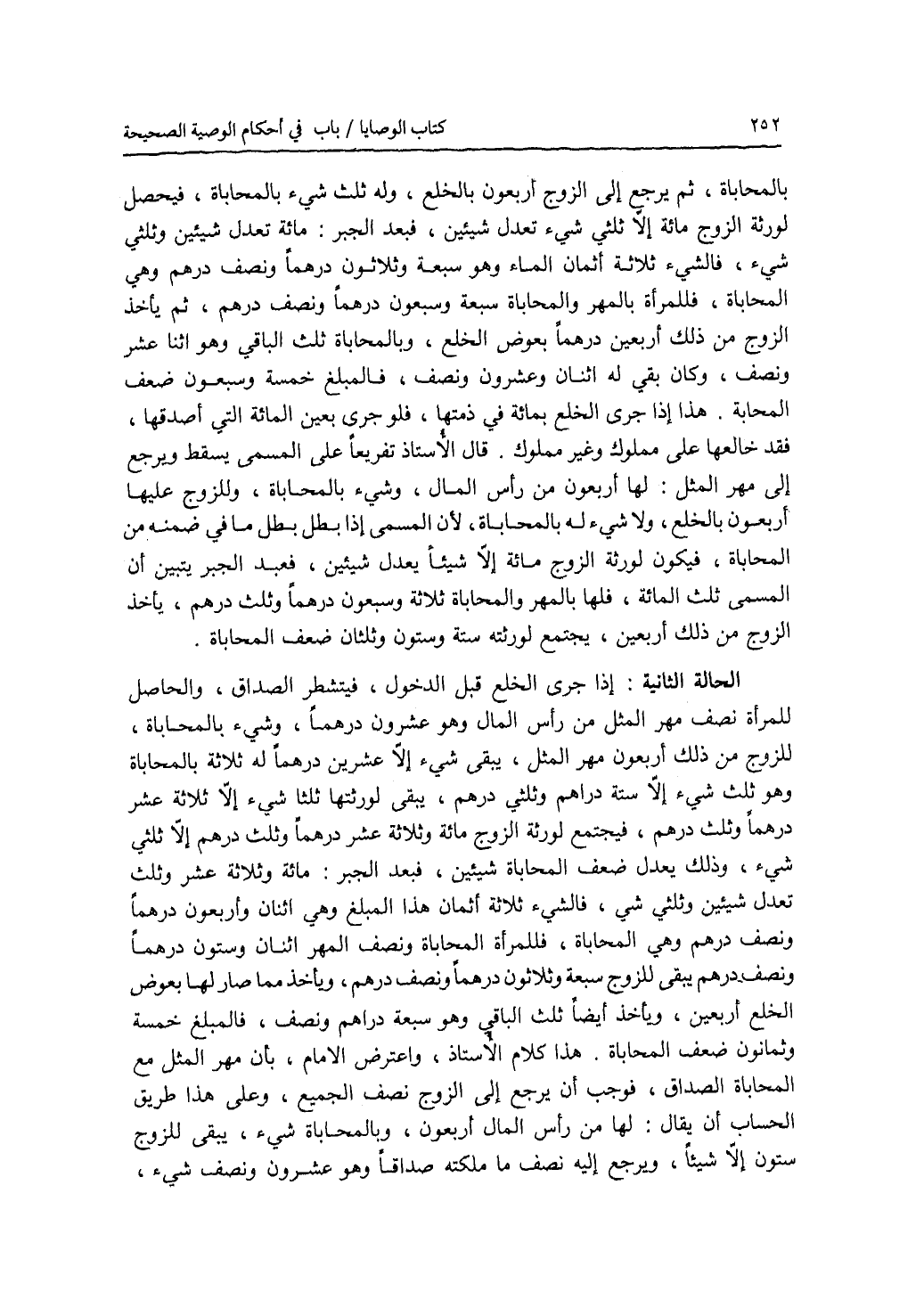 بالمحاباة، ثم يرجع إلى الزوج أربعون بالخلع، وله ثلث شئ بالمحاباة، فيحصل لورثة الزوج مائة إلا ثلثي شئ تعدل شيئين، فبعد الجبر: مائة تعدل شيئين وثلثي شئ، فالشئ ثلاثة أثمان المائة وهو سبعة وثلاثون درهما ونصف درهم وهي المحاباة، فللمرأة بالمهر والمحاباة سبعة وسبعون درهما ونصف درهم، ثم يأخذ الزوج من ذلك أربعين درهما بعوض الخلع، وبالمحاباة ثلث الباقي وهو اثنا عشر ونصف، وكان بقي له اثنان وعشرون ونصف، فالمبلغ خمسة وسبعون ضعف المحاباة. هذا إذا جرى الخلع بمائة في ذمتها، فلو جرى بعين المائة التي أصدقها، فقد خالعها على مملوك وغير مملوك. قال الاستاذ تفريعا على أن المسمى يسقط ويرجع إلى مهر المثل: لها أربعون من رأس المال، وشئ بالمحاباة، وللزوج عليها أربعون بالخلع، ولا شئ له بالمحاباة، لان المسمى إذا بطل بطل ما في ضمنه من المحاباة، فيكون لورثة الزوج مائة إلا شيئا يعدل شيئين، فبعد الجبر يتبين أن المسمى ثلث المائة، فلها بالمهر والمحاباة ثلاثة وسبعون درهما وثلث درهم، يأخذ الزوج من ذلك أربعين، يجتمع لورثته ستة وستون وثلثان ضعف المحاباة. الحالة الثانية: إذا جرى الخلع قبل الدخول، فيتشطر الصداق، والحاصل للمرأة نصف مهر المثل من رأس المال وهو عشرون درهما، وشئ بالمحاباة، للزوج من ذلك أربعون مهر المثل، يبقى شئ إلا عشرين درهما له ثلاثة بالمحاباة وهو ثلث شئ إلا ستة دراهم وثلثي درهم، يبقى لورثتها ثلثا شئ إلا ثلاثة عشر درهما وثلث درهم، فيجتمع لورثة الزوج مائة وثلاثة عشر درهما وثلث درهم إلا ثلثي شئ، وذلك يعدل ضعف المحاباة شيئين، فبعد الجبر: مائة وثلاثة عشر وثلث تعدل شيئين وثلثي شئ، فالشئ ثلاثة أثمان هذا المبلغ وهي اثنان وأربعون درهما ونصف درهم وهي المحاباة، فللمرأة المحاباة ونصف المهر اثنان وستون درهما ونصف درهم يبقى للزوج سبعة وثلاثون درهما ونصف درهم، ويأخذ مما صار لها بعوض الخلع أربعين، ويأخذ أيضا ثلث الباقي وهو سبعة دراهم ونصف، فالمبلغ خمسة وثمانون ضعف المحاباة. هذا كلام الاستاذ، واعترض الامام، بأن مهر المثل مع المحاباة الصداق، فوجب أن يرجع إلى الزوج نصف الجميع، وعلى هذا طريق الحساب أن يقال: لها من رأس المال أربعون، وبالمحاباة شئ، يبقى للزوج ستون إلا شيئا، ويرجع إليه نصف ما ملكته صداقا وهو عشرون ونصف شئ،