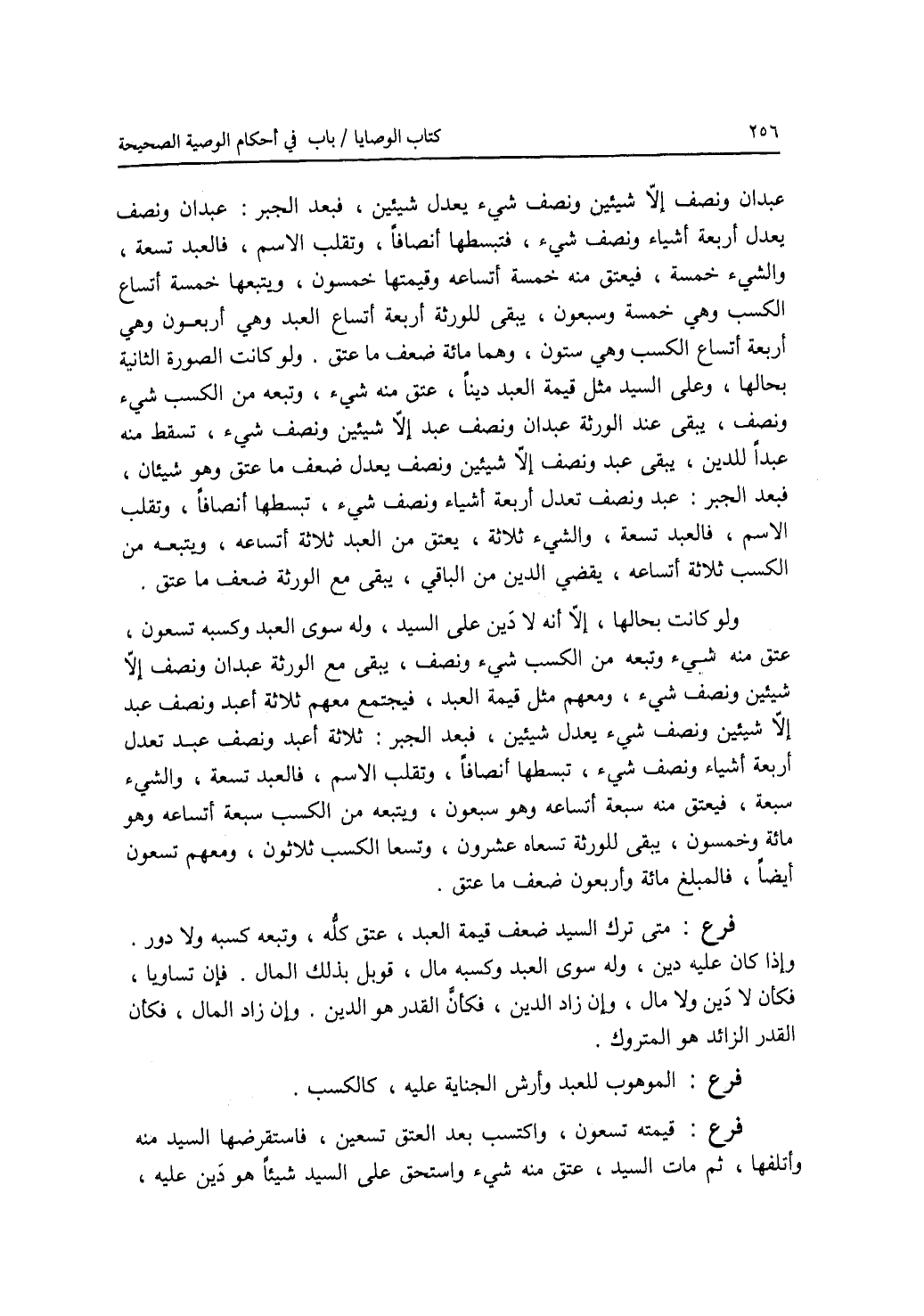 عبدان ونصف إلا شيئين ونصف شئ يعدل شيئين، فبعد الجبر: عبدان ونصف يعدل أربعة أشياء ونصف شئ، فتبسطها أنصافا، وتقلب الاسم، فالعبد تسعة، والشئ خمسة، فيعتق منه خمسة أتساعه وقيمتها خمسون، ويتبعها خمسة أتساع الكسب وهي خمسة وسبعون، يبقى للورثة أربعة أتساع العبد وهي أربعون وهي أربعة أتساع الكسب وهي ستون، وهما مائة ضعف ما عتق. ولو كانت الصورة الثانية بحالها، وعلى السيد مثل قيمة العبد دينا، عتق منه شئ، وتبعه من الكسب شئ ونصف، يبقى عند الورثة عبدان ونصف عبد إلا شيئين ونصف شئ، تسقط منه عبد الدين، يبقى عبد ونصف إلا شيئين ونصف يعدل ضعف ما عتق وهو شيئان، فبعد الجبر: عبد ونصف تعدل أربعة أشياء ونصف شئ، تبسطها أنصافا، وتقلب الاسم، فالعبد تسعة، والشئ ثلاثة، يعتق من العبد ثلاثة أتساعه، ويتبعه من الكسب ثلاثة أتساعه، يقضى الدين من الباقي، يبقى مع الورثة ضعف ما عتق. ولو كانت بحالها، إلا أنه لا دين على السيد، وله سوى العبد وكسبه تسعون، عتق منه شئ، وتبعه من الكسب شئ ونصف، يبقى مع الورثة عبدان ونصف إلا شيئين ونصف شئ، ومعهم مثل قيمة العبد، فيجتمع معهم ثلاثة أعبد ونصف عبد إلا شيئين ونصف شئ يعدل شيئين، فبعد الجبر: ثلاثة أعبد ونصف عبد تعدل أربعة أشياء ونصف شئ، تبسطها أنصافا، وتقلب الاسم، فالعبد تسعة، والشئ سبعة، فيعتق منه سبعة أتساعه وهو سبعون، ويتبعه من الكسب سبعة أتساعه وهو مائة وخمسة، يبقى للورثة تسعاه عشرون، وتسعا الكسب ثلاثون، ومعهم تسعون أيضا، فالمبلغ مائة وأربعون ضعف ما عتق. فرع متى ترك السيد ضعف قيمة العبد، عتق كله، وتبعه كسبه ولا دور. وإذا كان عليه دية، وله سوى العبد وكسبه مال، قوبل بذلك المال. فان تساويا، فكأن لا دين ولا ما، وإن زاد الدين، فكأن القدر هو الدين. وإن زاد المال، فكأن القدر الزائد هو المتروك. فرع الموهوب للعبد وأرش الجناية عليه، كالكسب. فرع قيمته تسعون، واكتسب بعد العتق تسعين، فاستقرضها السيد منه وأتلفها، ثم مات السيد، عتق منه شئ واستحق على السيد شيئا هو دين عليه،