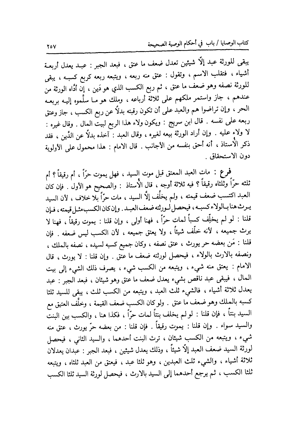 يبقى للورثة عبد إلا شيئين تعدل ضعف ما عتق، فبعد الجبر: عبد يعدل أربعة أشياء، فتقلب الاسم، وتقول: عتق منه ربعه، ويتبعه ربعه كربع كسبه، يبقى للورثة نصفه وهو ضعف ما عتق، ثم ربع الكسب الذي هو دين، إن أداه الورثة من عندهم، جاز واستمر ملكهم على ثلاثة أرباعه، وملك هو ما سلموه إليه بربعه الحر، وإن تراضوا هم والعبد على أن تكون رقبته بدلا عن ربع الكسب، جاز وعتق ربعه على نفسه. قال ابن سريج: ويكون ولاهذا الربع لبيت المال. وقال غيره: لاولاء عليه. وإن أراد الورثة بيعه لغيره، وقال العبد: أخذه بدلا عن الدين، فقد ذكر الاستاذ، أنه أحق بنفسه من الاجانب. قال الامام: هذا محمول على الاولوية دون الاستحقاق. فرع مات العبد المعتق قبل موت السيد، فهل يموت حرا، أم رقيقا ؟ أم ثلثه حرا وثلثاه رقيقا ؟ فيه ثلاثة أوجه، قال الاستاذ: والصحيح هو الاول. فإن كان العبد اكتسب ضعف قيمته، ولم يخلف إلا السيد، مات حرا بلا خلاف، لان السيد يرث هنا بالولاء كسبه، فيحصل لورثته ضعف العبد. وإن كان الكسب مثل قيمته، فإن قلنا: لو لم يخلف كسبا لمات حرا، فهنا أولى، وإن قلنا: يموت رقيقا، فهنا لا يرث جميعه، لانه خلف شيئا، ولا يعتق جميعه، لان الكسب ليس ضعفه. فإن قلنا: من بعضه حر يورث، عتق نصفه، وكان جميع كسبه لسيده، نصفه بالملك، ونصفه بالارث بالولاء، فيحصل لورثته ضعف ما عتق. وإن قلنا: لا يورث، قال الامام: يعتق منه شئ، ويتبعه من الكسب شئ، يصرف ذلك الشئ إلى بيت بالمال، فيبقى عبد ناقص بشئ يعدل ضعف ما عتق وهو شيئان، فبعد الجبر: عبد يعدل ثلاثة أشياء، فالشئ ثلث العبد، فيعتق ثلثه، ويتبعه من الكسب ثلثه، يبقى للسيد ثلثا كسبه بالملك وهو ضعف ما عتق. ولو كان الكسب ضعف القيمة، وخلف العتيق مع السيد بنتا، فإن قلنا: لو لم يخلف بنتا لمات حرا، فكذا هنا، والكسب بين البنت والسيد سواء. وإن قلنا: يموت رقيقا. فإن قلنا: من بعضه حر يورث، عتق منه شئ، ويتبعه من الكسب شيئان، ترث البنت أحدهما، والسيد الثاني، فيحصل لورثة السيد ضعف العبد إلا شيئا، وذلك يعدل شيئين، فبعد الجبر: عبدان يعدلان ثلاثة أشياء، والشئ ثلث العبدين، وهو ثلثا عبد، فيعتق من العبد ثلثاه، ويتبعه ثلثا الكسب، ثم يرجع أحدهما إلى السيد بالارث، فيحصل لورثة السيد ثلثا الكسب