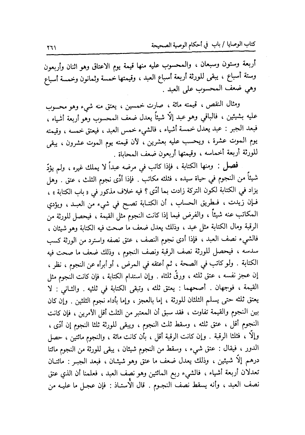 أربعة وستون وسبعان، والمحسوب عليه منها قيمة يوم الاعتاق وهو اثنان وأربعون وستة أسباع، يبقى للورثة أربعة أسباع العبد، وقيمتها خمسة وثمانون وخمسة أسباع وهي ضعف المحسوب على العبد. ومثال النقص، قيمته مائة، صارت خمسين، يعتق منه شئ وهو محسوب عليه بشيئين، فالباقي وهو عبد إلا شيئا يعدل ضعف المحسوب وهو أربعة أشياء، فبعد الجبر: عبد يعدل خمسة أشياء، فالشئ خمس العبد، فيعتق خمسه، وقيمته يوم الموت عشرة، ويحسب عليه بعشرين، لان قيمته يوم الموت عشرون، يبقى للورثة أربعة أخماسه، وقيمتها أربعون ضعف المحاباة. فصل ومنها الكتابة، فإذا كاتب في مرضه عبدا لا يملك غيره، ولم يؤد شيئا من النجوم في حياة سيده، فثلثه مكاتب. فإذا أدى نجوم الثلث، عتق. وهل يزاد في الكتابة لكون التركة زادت بما أدى ؟ فيه خلاف مذكور في باب الكتابة، فإن زيدت، فطريق الحساب، أن الكتابة تصح في شئ من العبد، ويؤدي المكاتب عنه شيئا، والفرض فيما إذا كانت النجوم مثل القيمة، فيحصل للورثة من الرقبة ومال الكتابة مثل عبد، وذلك يعدل ضعف ما صحت فيه الكتابة وهو شيئان، فالشئ نصف العبد، فإذا أدى نجوم النصف، عتق نصفه، واسترد من الورثة كسب سدسه، فيحصل للورثة نصف الرقبة ونصف النجوم، وذلك ضعف ما صحت فيه الكتابة. ولو كاتب في الصحة، ثم أعتقه في المرض، أو أبرأه عن النجوم، نظر، إن عجز نفسه، عتق ثلثه، ورق ثلثاه. وإن استدام الكتابة، فإن كانت النجوم مثل القيمة، فوجهان. أصحهما: يعتق ثلثه، وتبقى الكتابة في ثلثيه. والثاني: لا يعتق ثلثه حتى يسلم الثلثان للرثة، إما بالعجز، وإما بأداء نجوم الثلثين. وإن كان بين النجوم والقيمة تفاوت، فقد سبق أن المعتبر من الثلث أقل الامرين، فإن كانت النجوم أقل، عتق ثلثه، وسقط ثلث النجوم، ويبقى للورثة ثلثا النجوم إن أدى، وإلا، فثلثا الرقبة. وإن كانت الرقبة أقل، بأن كانت مائة، والنجوم مائتين، حصل الدور، فيقال: عتق شئ، وسقط من النجوم شيئان، يبقى للورثة من النجوم مائتا درهم إلا شيئين، وذلك يعدل ضعف ما عتق وهو شيئان، فيعد الجبر: مائتان تعدلان أربعة أشياء، فالشئ ربع المائتين وهو نصف العبد، فعلمنا أن الذي عتق نصف العبد، وأنه يسقط نصف النجوم. قال الاستاذ: فإن عجل ما عليه من