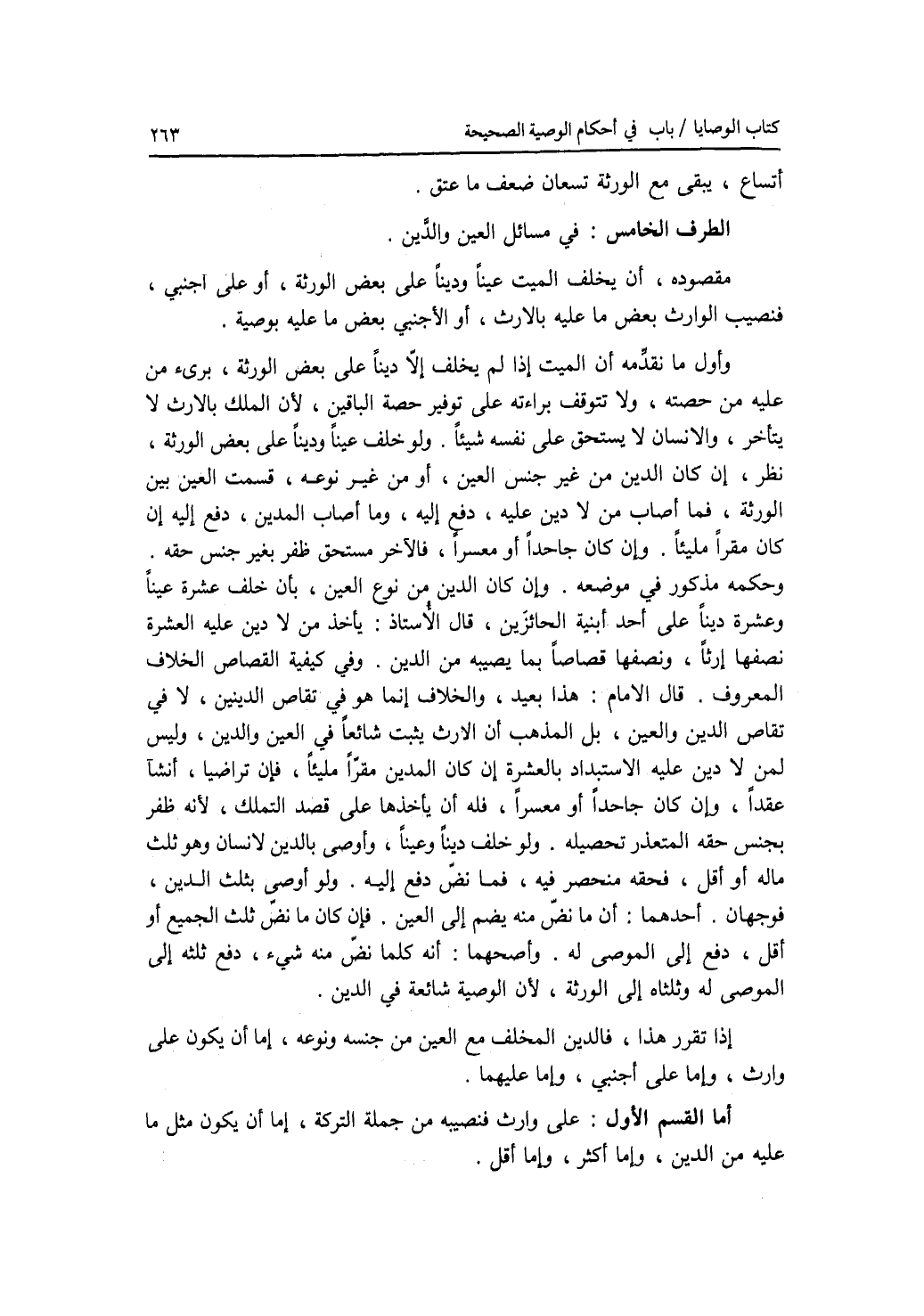 الطرف الخامس : في مسائل العين والدين. مقصوده، أن يخلف الميت عينا ودينا على بعض الورثة، أو على أجنبي، فنصيب الوارث بعض ما عليه بالارث، أو الاجنبي بعض ما عليه بوصية. وأول ما نقدمه أن الميت إذا لم يخلف إلا دينا على بعض الورثة، برئ من عليه من حصته، ولا تتوقف براءته على توفير حصة الباقين، لان الملك جالارث لا يتأخر، والانسان لا يستحق على نفسه شيئا. ولو خلف عينا ودينا على بعض الورثة، نظر، إن كان الدين من غير جنس العين، أو من غير نوعه، قسمت العين بين الورثة، فما أصاب من لا دين عليه، دفع إليه، وما أصاب المدين، دفع إليه إن كان مقرا مليئا. وإن كان جاحدا أو معسرا، فالآخر مستحق ظفر بغير جنس حقه. وحكمه مذكور في موضعه. وإن كان الدين من نوع العين، بأن خلف عشرة عينا وعشرة دينا على أحد ابنيه الحائزين، قال الاستاذ: يأخذ من لا دين عليه العشرة نصفها إرثا، ونصفها قصاصا بما يصيبه من الدين. وفي كيفية القصاص الخلاف المعروف. قال الامام: هذا بعيد، والخلاف إنما هو في تقاص الدينين، لا في تقاص الدين والعين، بل المذهب أن الارث يثبت شائعا في العين والدين، وليس لمن لا دين عليه الاستبداد بالعشرة إن كان المدين مقرا مليئا، فإن تراضيا، أنشآ عقدا، وإن كان جاحدا أو معسرا، فله أن يأخذها على قصد التملك، لانه ظفر بجنس حقه المتعذر تحصيله. ولو خلف دينا وعينا، وأوصى بالدين لانسان وهو ثلث ماله أو أقل، فحقه منحصر فيه، فما نض دفع إليه. ولو أوصى بثلث الدين، فوجهان. أحدهما: أن ما نض منه يضم إلى العين. فإن كان مانض ثلث الجميع أو أقل، دفع إلى الموصى له. وأصحهما: أنه كلما نض منه شئ، دفع ثلثه إلى الموصله وثلثاه إلى الورثة، لان الوصية شائعة في الدين. إذا تقرر هذا، فالدين المخلف مع العين من جنسه ونوعه، إما أن يكون على وارث، وإما على أجنبي، وإما عليهما. أما