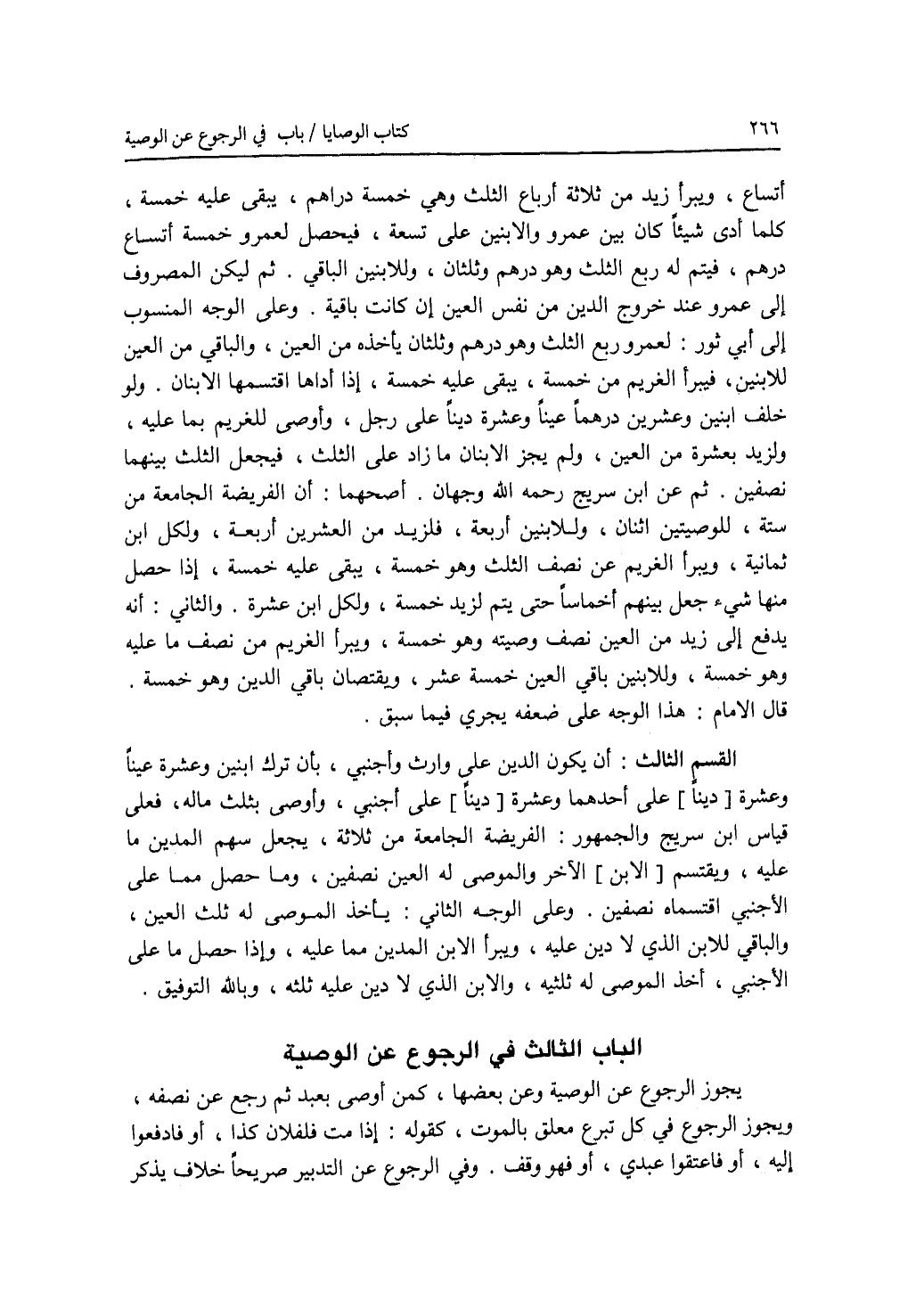 الباب الثالث : في الرجوع عن الوصية يجوز الرجوع عن الوصية وعن بعضها، كمن أوصى بعبد ثم رجع عن نصفه، ويجوز الرجوع في كل تبرع معلق بالموت، كقوله: إذا مت فلفلان كذا، أو فادفعوا إليه، أو فاعتقوا عبدي، أو فهو وقف. وفي الرجوع عن التدبير صريحا خلاف يذكر