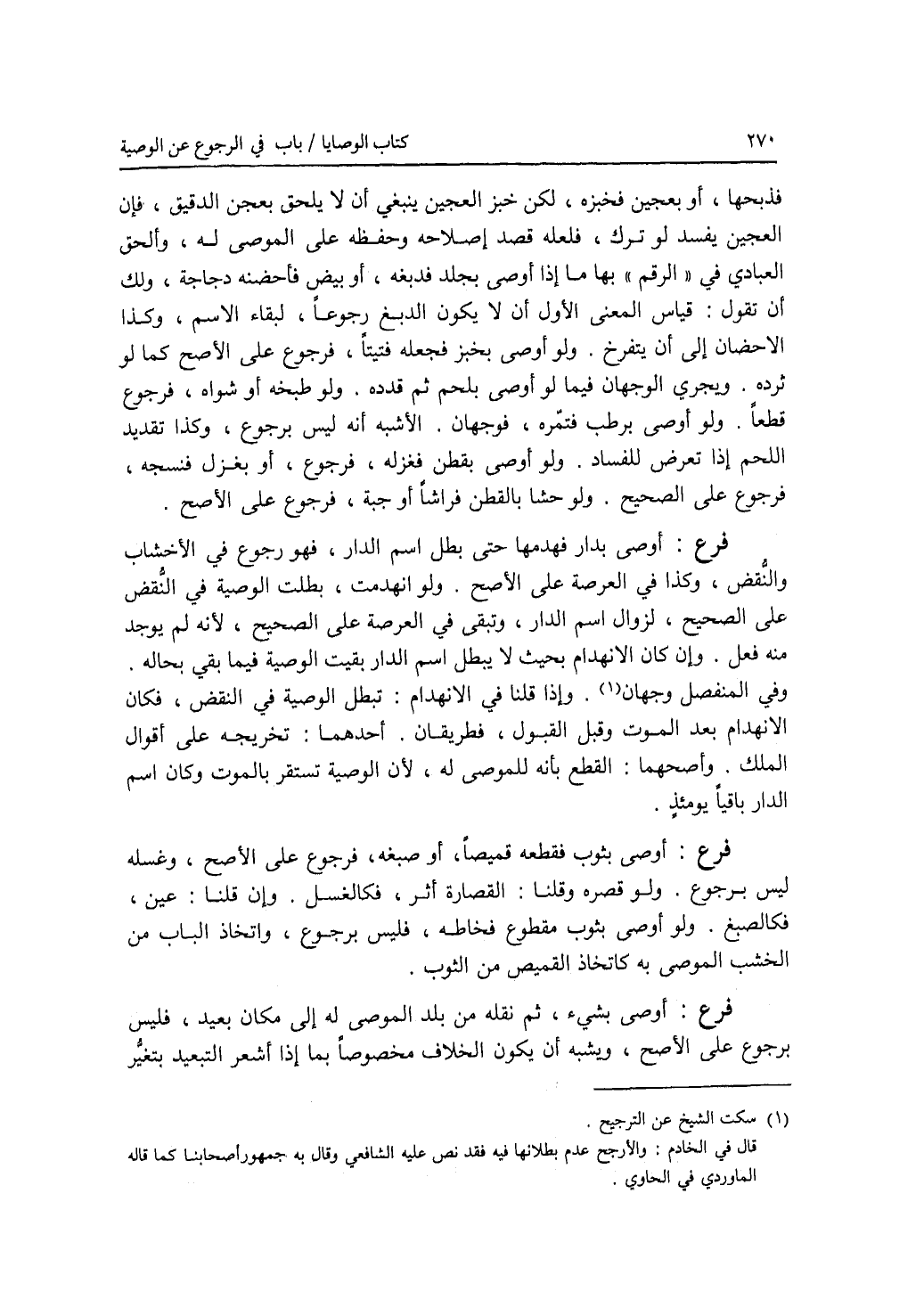 فذبحها، أو بعجين فخبزه، لكن خبز العجين ينبغي أن لا يلحق بعجن الدقيق، فإن العجين يفسد لو ترك، فلعله قد إصلاحه وحفظه على الموصى له، وألحق العبادي في الرقم بها ما إذا أوصى بجلد فدبغه، أو بيض فأحضنه دجاجة، ولك أن تقول: قياس المعنى الاول أن لا يكون الدبغ رجوعا، لبقاء الاسم، وكذا الاحضان إلى أن يتفرخ. ولو أوصى بخبز فجعله فتيتا، فرجوع على الاصح كما لو ثرده. ويجري الوجهان فيما لو أوصى بلحم ثم قدده. ولو طبخه أو شواه، فرجوع قطعا. ولو أوصى برطب فتمره، فوجهان. الاشبه أنه ليس برجوع، وكذا تقديد اللحم إذا تعرض للفساد. ولو أوصى بقطن فغزله، فرجوع، أو بغزل فنسجه، فرجوع على الصحيح. ولو حشا بالقطن فراشا أو جبة، فرجوع على الاصح. فرع أوصى بدار فهدمها حتى بطل اسم الدار، فهو رجوع في الاخشاب والنقض، وكذا في العرصة على الاصح. ولو انهدمت بطلت الوصية في النقض على الصحيح، لزوال اسم الدار، وتبقى في العرصة على الصحيح، لانه لم يوجد منه فعل. وإن كان الانهدام بحيث لا يبطل اسم الدار بقيت الوصية فيما بقي بحاله. وفي المنفصل وجهان. وإذا قلنا في الانهدام: تبطل الوصية في النقض، فكان الانهدام بعد الموت وقبل القبول، فطريقان. أحدهما: تخريجه على أقوال الملك. وأصحهما: القطع بأنه للموصى له، لان الوصية تستقر بالموت وكان اسم الدار باقيا يومئذ. فرع أوصى بثوب فقطعه قميصا، أو صبغه، فرجوع على الاصح، وغسله ليس برجوع. ولو قصره وقلنا: القصارة أثر، فكالغسل. وإن قلنا: عين، فكالصبغ. ولو أوصى بثوب مقطوع فخاطه، فليس برجوع، واتخاذ الباب من الخشب الموصى به كاتخاذ القميص من الثوب. فرع أوصى بشئ، ثم نقله من بلد الموصى له إلى مكان بعيد، فليس برجوع على الاصح، ويشبه أن يكون الخلاف مخصوصا بما إذا أشعر التبعيد بتغير