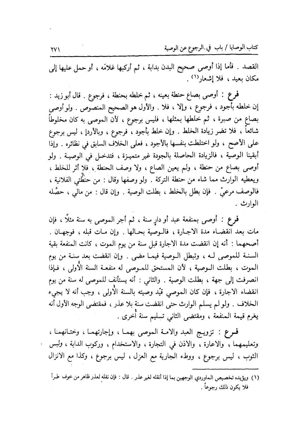 القصد. فأما إذا أوصى صحيح البدن بدابة، ثم أركبها غلامه، أو حمل عليها إلى مكان بعيد، فلا إشعار. فرع أوصى بصاع حنطة بعينه، ثم خلطه بحنطة، فرجوع. قال أبو زيد: إن خلطه بأجود، فرجوع، وإلا، فلا. والاول هو الصحيح المنصوص. ولو أوصى بصاع من صبرة، ثم خلطها بمثلها، فليس برجوع، لان الموصى به كان مخلوطا شائعا، فلا تضر زيادة الخلط. وإن خلط بأجود، فرجوع، وبالاردإ، ليس برجوع على الاصح. ولو اختلطت بنفسها بالاجود، فعلى الخلاف الساب في نظائره. وإذا أبقينا الوصية، فالزيادة الحاصلة بالجودة غير متميزة، فتدخل في الوصية. ولو أوصى بصاع من حنطة، ولم يعين الصاع، ولا وصف الحنطة، فلا أثر للخلط، ويعطيه الوارث مما شاء من حنطة التركة. ولو وصفها وقال: من حنطتي الفلانية، فالوصف مرعي. فإن بطل بالخلط، بطلت الوصية. وإن قال: من مالي، حصله الوارث. فرع أوصى بمنفعة عبد أو دار سنة، ثم أجر الموصى به سنة مثلا، فإن مات بعد انقضاء مدة الاجارة، فالوصية بحالها. وإن مات قبله، فوجهان. أصحهما: أنه إن انقضت مدة الاجارة قبل سنة من يوم الموت، كانت المنفعة بقية السنة للموصى له، وتبطل الوصية فيما مضى. وإن انقضت بعد سنة من يوم الموت، بطلت الوصية، لان المستحق للموصى له منفعة السنة الاولى، فإذا انصرفت إلى جهة، بطلت الوصية. والثاني: أنه يستأنف للموصى له سنة من يوم انقضاء الاجارة، فإن كان الموصي قيد وصيته بالسنة الاولى، وجب أنه لا يجئ الخلاف. ولو لم يسلم الوارث حتى انقضت سنة بلا عذر، فمقتضى الوجه الاول أنه يغرم قيمة المنفعة، ومقتضى الثاني تسليم سنة أخرى. فرع تزويج العبد والامة الموصى بهما، وإجارتهما، وختانهما، وتعليمهما، والاعارة، والاذن في التجارة، والاستخدام، وركوب الدابة، ولبس الثوب، ليس برجوع، ووطئ الجارية مع العزل، ليس برجوع، وكذا مع الانزال